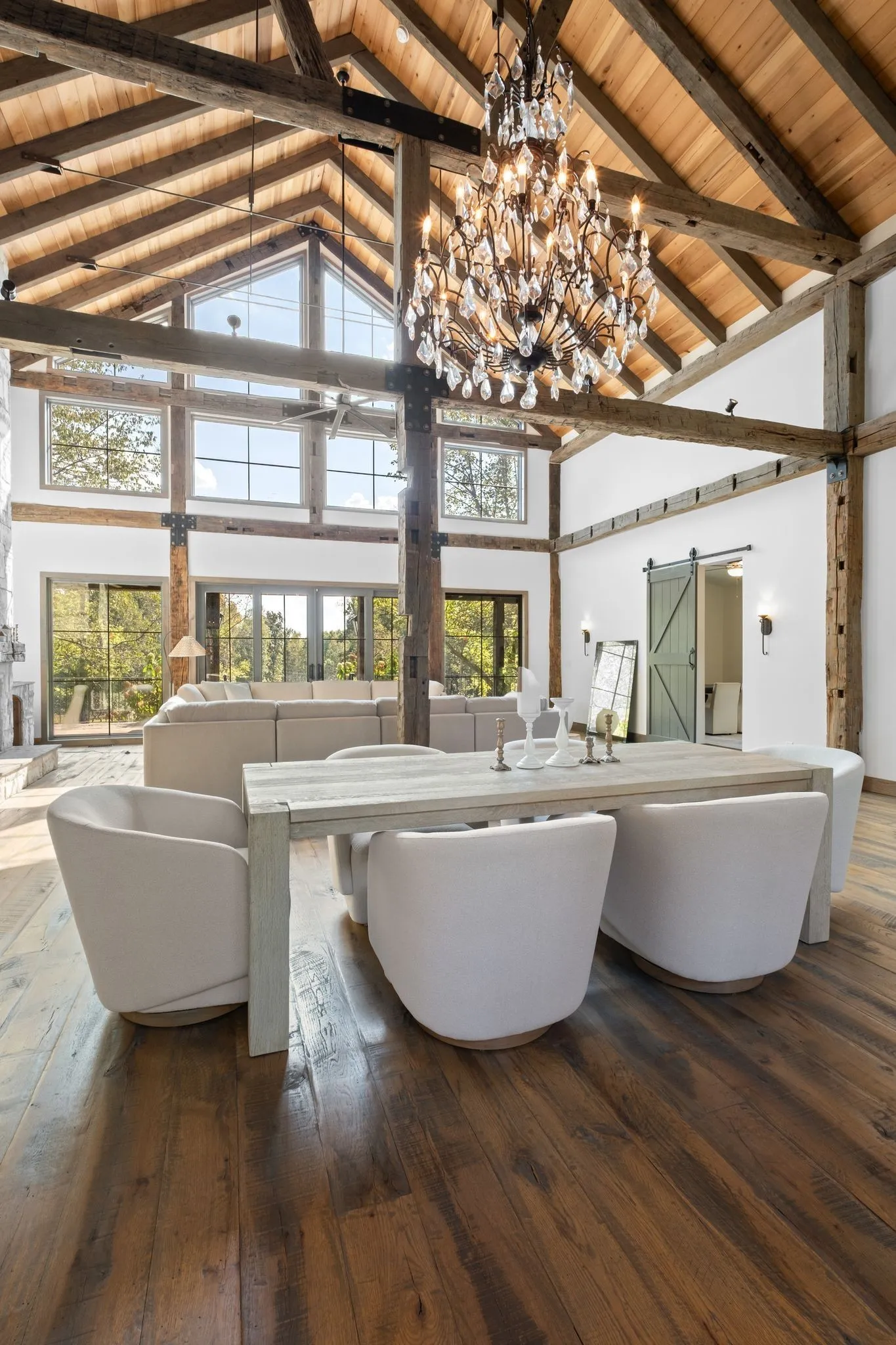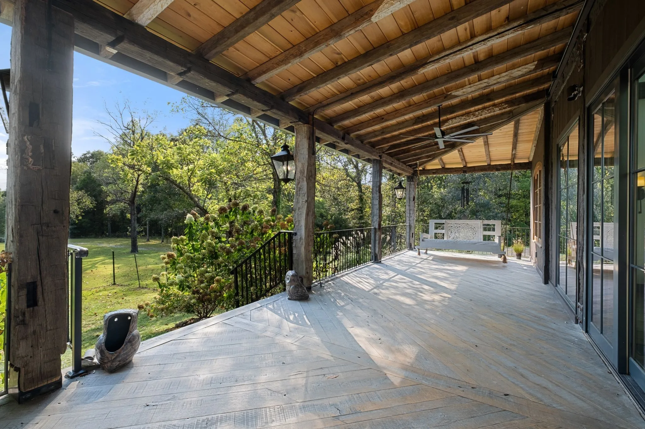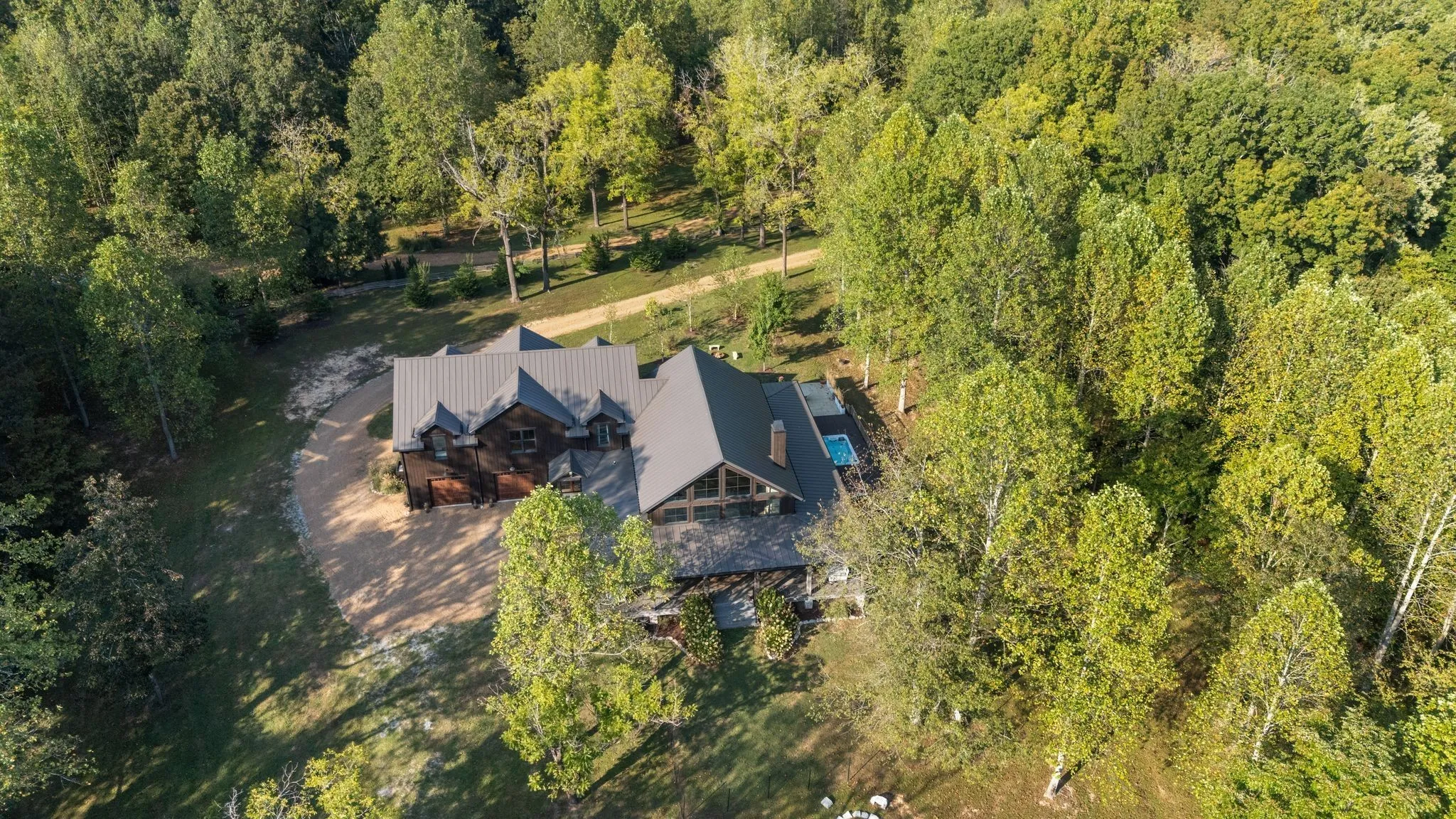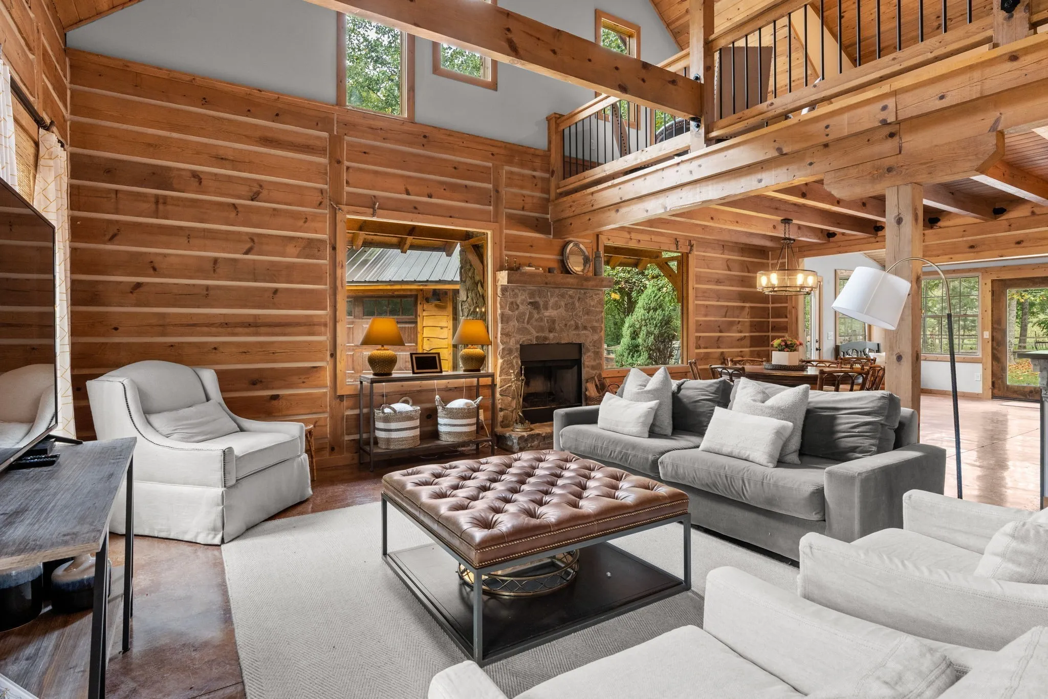 A captivating and remarkable rustic retreat on 13.88 acres in the rolling Tennessee hills, featuring two beautifully crafted homes with a combined 7,975 square feet of refined living. A rare opportunity for multigenerational living, guest accommodations or a tranquil personal escape. The 5,371 square foot primary residence welcomes you into a breathtaking ballroom style great room with soaring 28 foot ceilings, 150 year old Montana timber beams and sunlight pouring in from every angle. The chef’s kitchen with Bertazzoni appliances and a thoughtfully designed scullery makes entertaining feel effortless as gatherings flow out to the terraces. Terracotta stone and Restoration Hardware chandeliers elevate the home with understated elegance. The main level offers a serene primary suite framed by century old Indian teak doors and a spa inspired bath. A second bedroom on this level is ideal for guests or a dedicated office. Upstairs, three spacious bedrooms including an additional suite are complemented by a large studio filled with natural light that can serve as a creative space, lounge, office, or extra bedroom. Outdoor living shines with generous porches and terraces totaling 1,500 square feet, complete with a relaxing swim spa that overlooks the wooded landscape and starry skies. Across the property, a charming 2,604 square foot second residence rests on its own 6.88 acres. It features a sunlit morning room, a commercial Wolf kitchen, a main floor suite, and peaceful views of open meadows protected by the Tennessee Land Trust, ensuring lasting privacy and quiet. Together, these homes create a private sanctuary where thoughtful design, comfort, and nature come together. Every corner invites you to slow down, breathe deeply and enjoy the beauty of peaceful living.