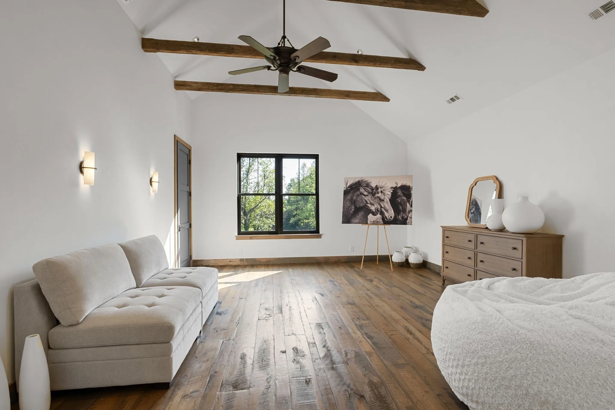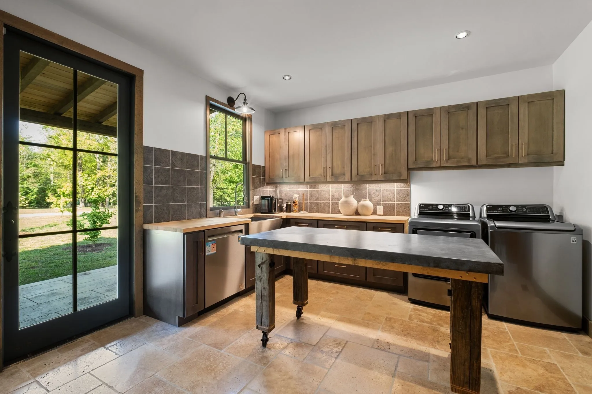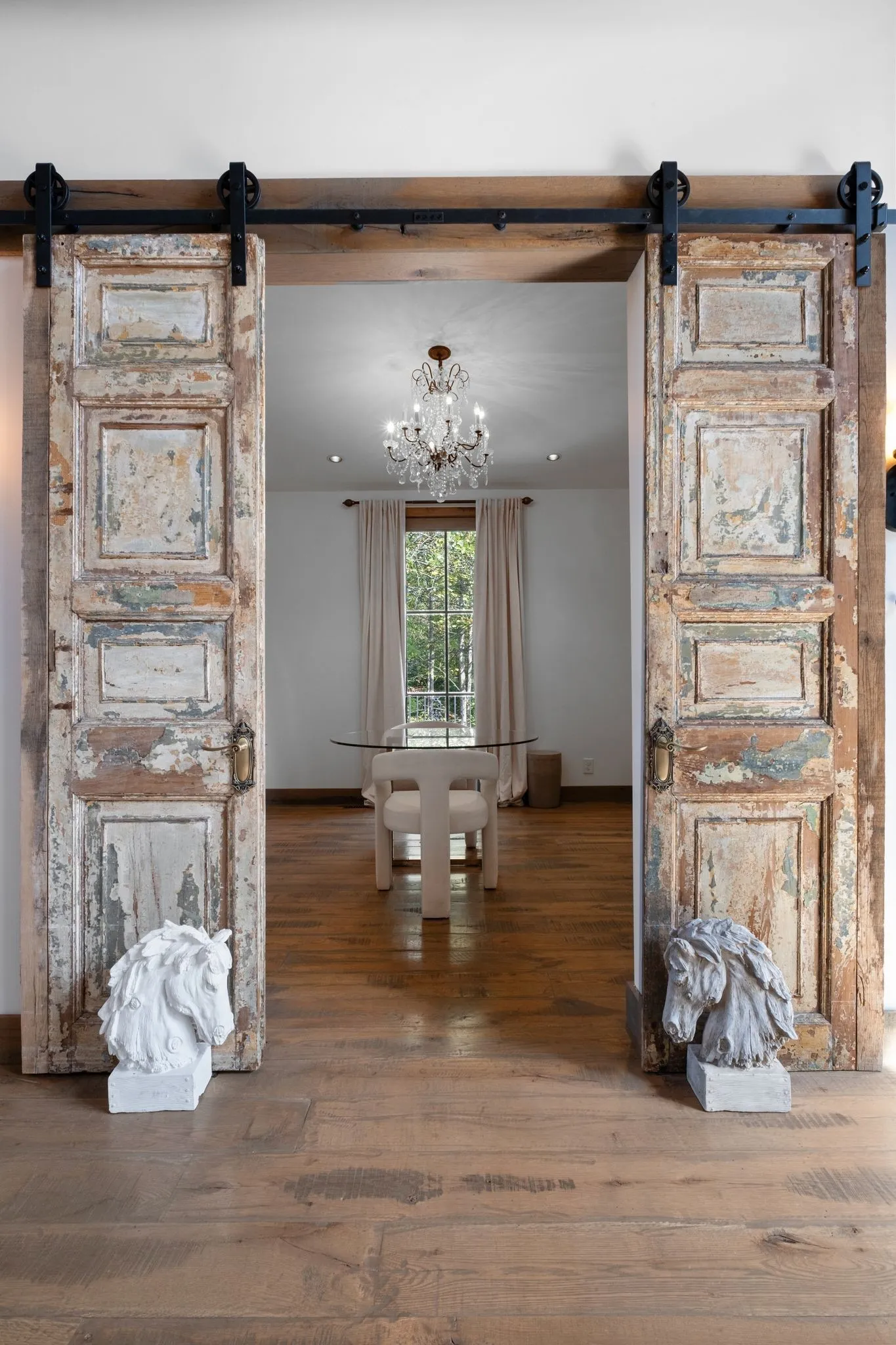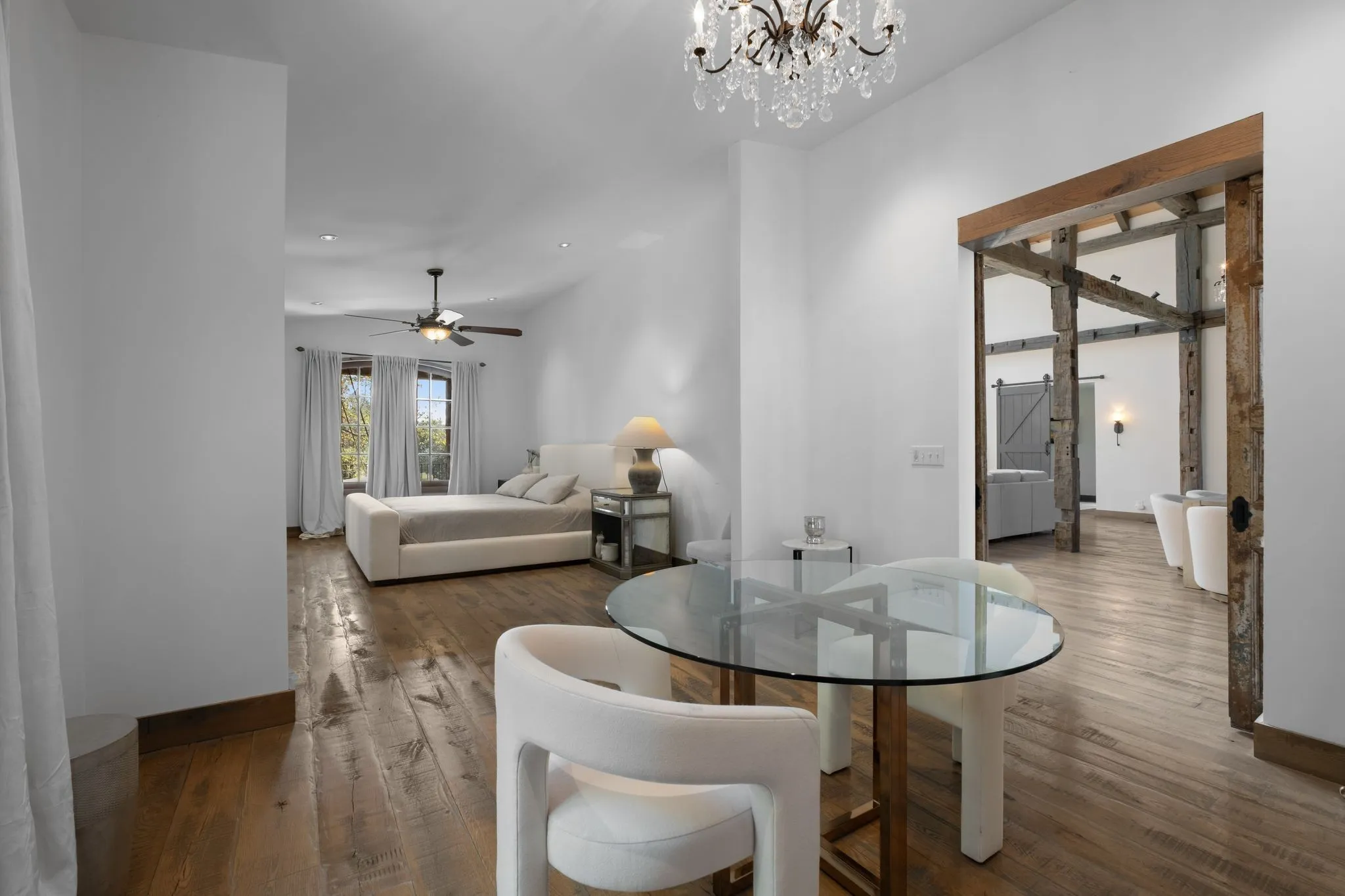 A captivating and remarkable rustic retreat on 13.88 acres in the rolling Tennessee hills, featuring two beautifully crafted homes with a combined 7,975 square feet of refined living. A rare opportunity for multigenerational living, guest accommodations or a tranquil personal escape. The 5,371 square foot primary residence welcomes you into a breathtaking ballroom style great room with soaring 28 foot ceilings, 150 year old Montana timber beams and sunlight pouring in from every angle. The chef’s kitchen with Bertazzoni appliances and a thoughtfully designed scullery makes entertaining feel effortless as gatherings flow out to the terraces. Terracotta stone and Restoration Hardware chandeliers elevate the home with understated elegance. The main level offers a serene primary suite framed by century old Indian teak doors and a spa inspired bath. A second bedroom on this level is ideal for guests or a dedicated office. Upstairs, three spacious bedrooms including an additional suite are complemented by a large studio filled with natural light that can serve as a creative space, lounge, office, or extra bedroom. Outdoor living shines with generous porches and terraces totaling 1,500 square feet, complete with a relaxing swim spa that overlooks the wooded landscape and starry skies. Across the property, a charming 2,604 square foot second residence rests on its own 6.88 acres. It features a sunlit morning room, a commercial Wolf kitchen, a main floor suite, and peaceful views of open meadows protected by the Tennessee Land Trust, ensuring lasting privacy and quiet. Together, these homes create a private sanctuary where thoughtful design, comfort, and nature come together. Every corner invites you to slow down, breathe deeply and enjoy the beauty of peaceful living.
