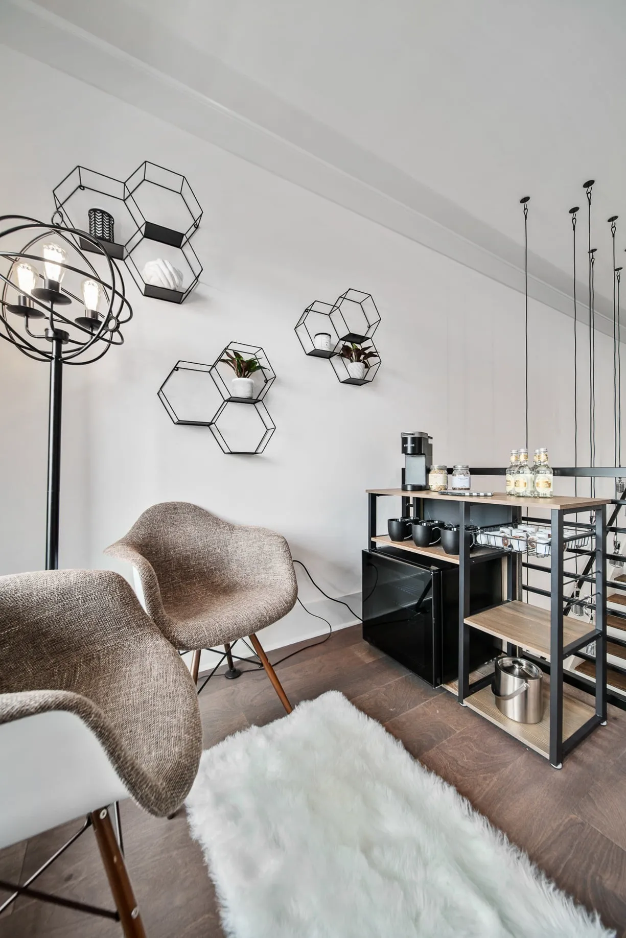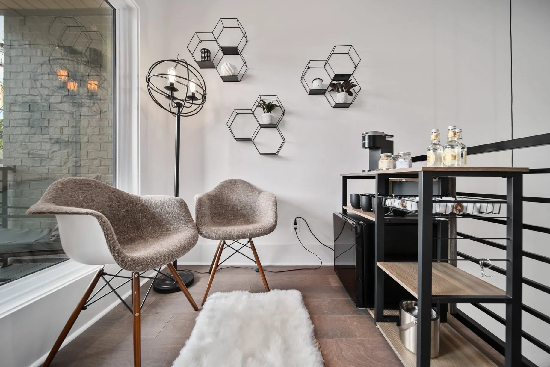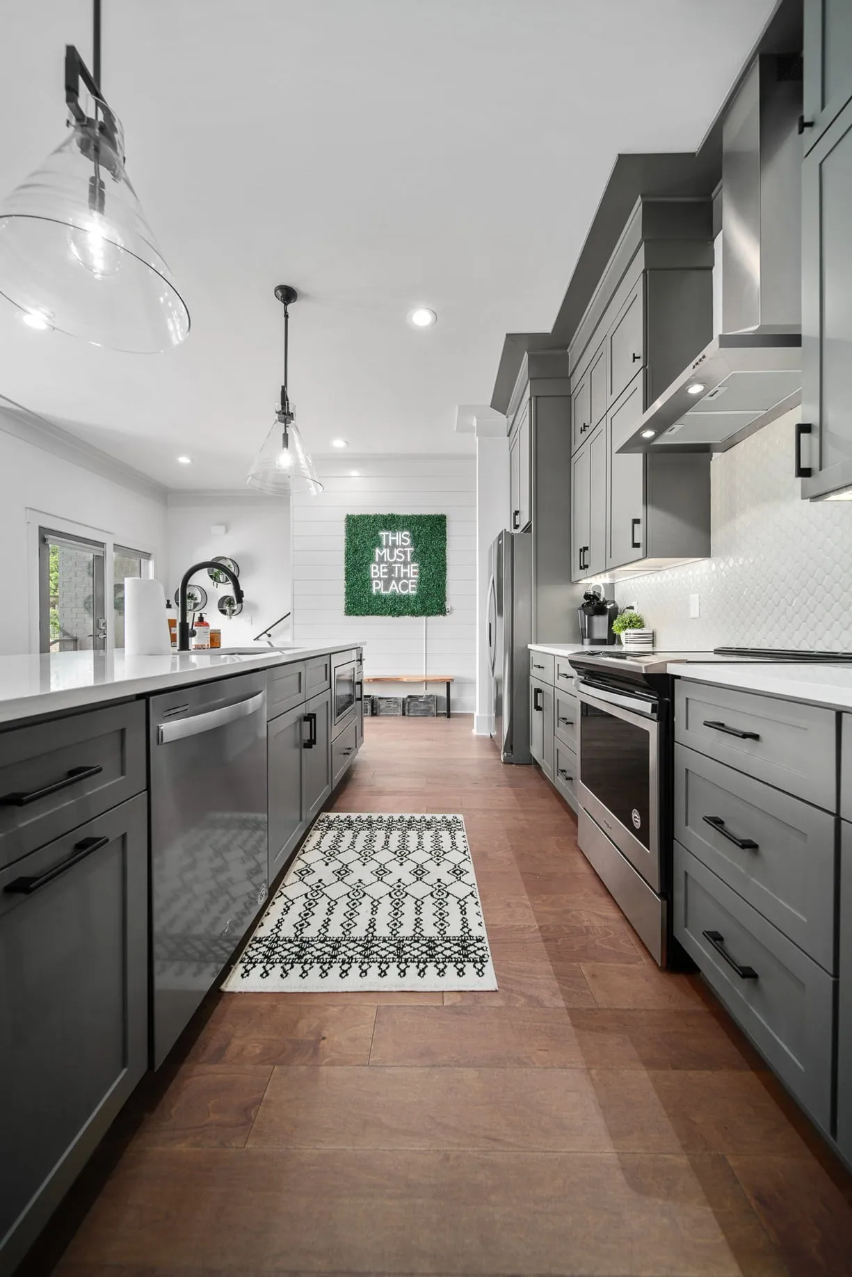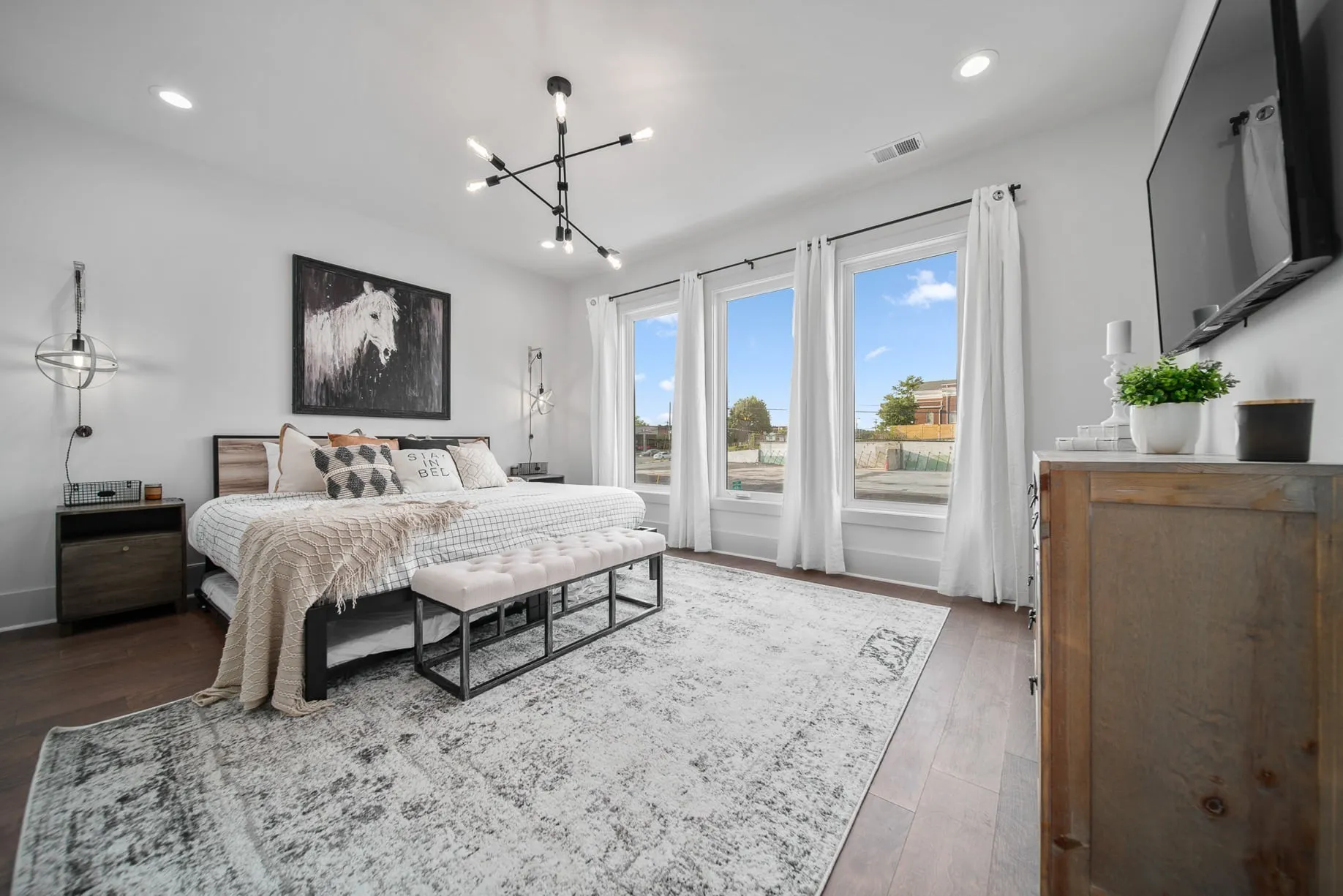 Inside, the home was curated with a modern California contemporary aesthetic that captures attention online and lives effortlessly in person. The open concept layout is bright and inviting, anchored by a chef’s kitchen with a dual fuel range, oversized island, and generous cabinetry built for entertaining. Quartz countertops and durable LVT flooring create a refined, low maintenance backdrop. High efficiency systems, LED lighting, and a tankless water heater enhance guest comfort while supporting operational efficiency.