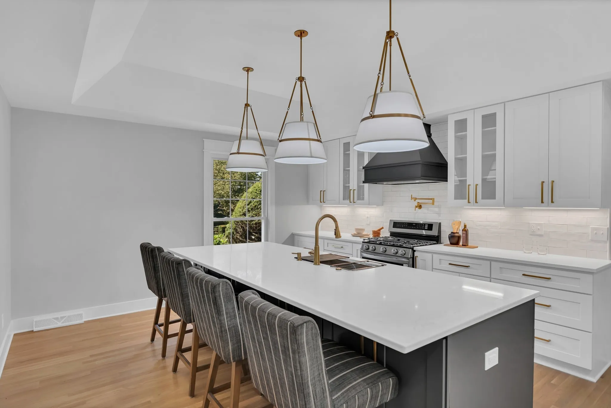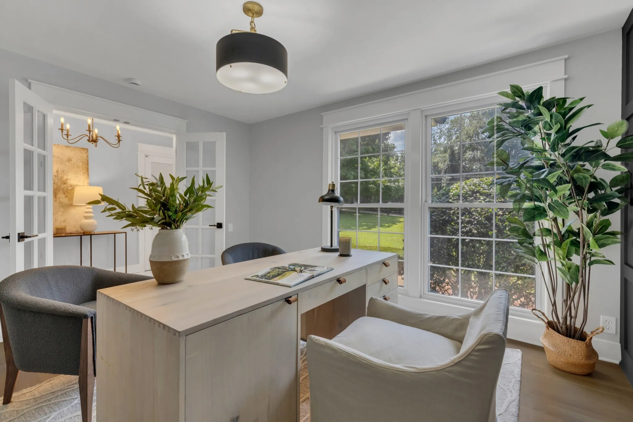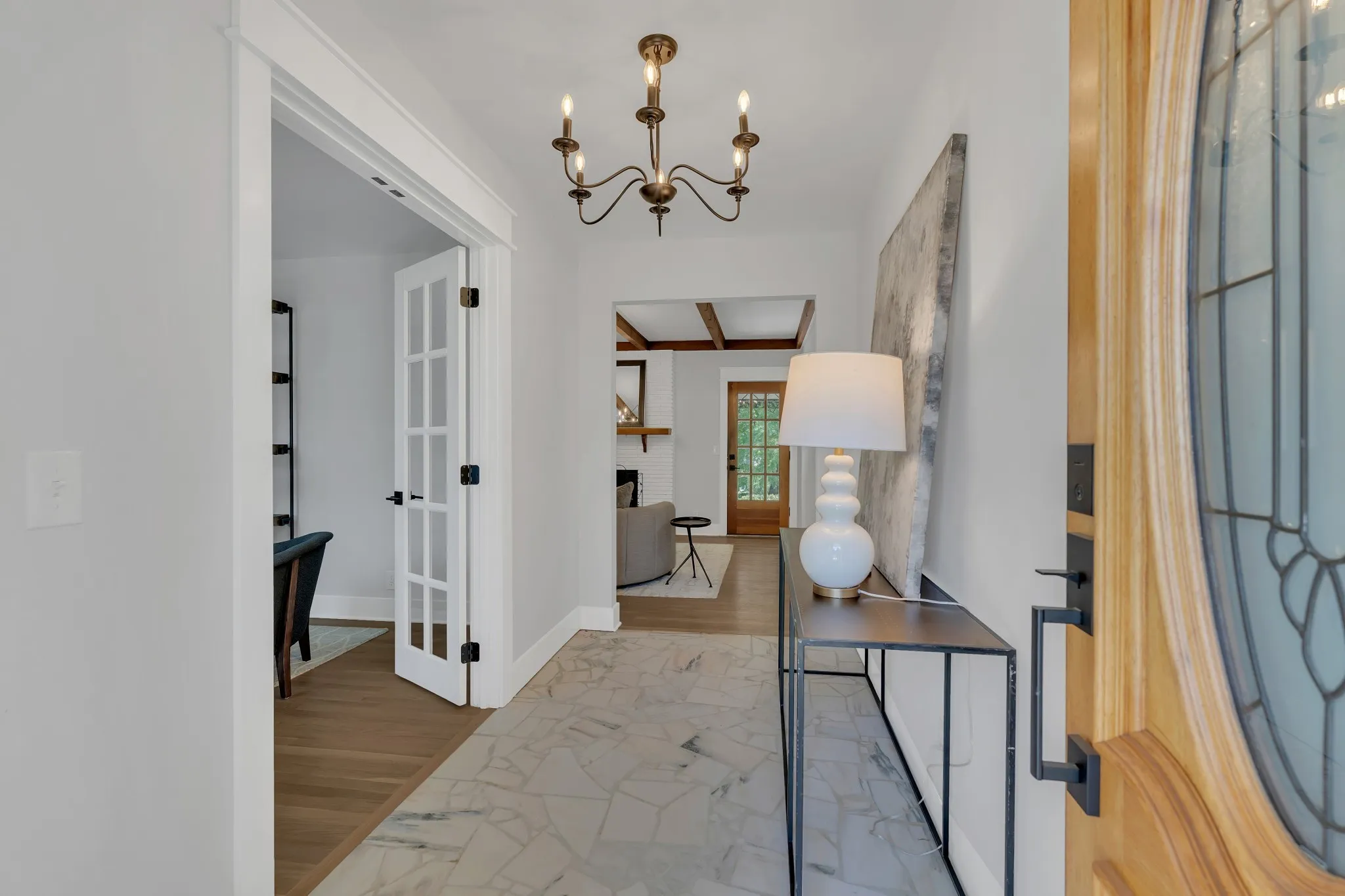 Elegantly Renovated Brentwood Home on Over an Acre — with 3-Car Garage & Basement! Discover timeless style and modern luxury in this beautifully renovated Brentwood home, perfectly situated on a lush, tree-lined corner lot. With 3 bedrooms, 2.5 baths, and an abundance of natural light, this home blends comfort, sophistication, and functionality at every turn. Step inside to a welcoming entryway adorned with marble flooring, French doors, and a designer accent wall framing the adjacent home office with floor to ceiling windows — a serene, light-filled space ideal for remote work, quiet reflection, or even a dining area. The fireside room offers a warm, inviting atmosphere with exposed ceiling beams, rich hardwoods, built-ins, and a gas fireplace, creating the perfect setting for relaxed evenings or entertaining guests. Flow seamlessly into the gourmet kitchen, where a large island, quartz countertops, stainless appliances, gas range, and striking gold-and-black fixtures define a true culinary centerpiece. Other features include a wet bar and a walk-in pantry that doubles as a laundry room with a third sink for added convenience. Enjoy movie nights in the versatile bonus/media room with an unexpected nook ideal for gaming or other hobbies – easily convertible into a 4th bedroom. Retreat to the spacious primary suite that boasts two separate walk-in closets and unwind in the luxury of a spa-inspired bathroom showcasing a freestanding soaking tub, double vanity, and a walk-in shower with dual shower heads. Step outside to the covered patio and experience the serenity of your park-like backyard, perfect for morning coffee or outdoor gatherings. Additional highlights: 3-car garage, partial basement, New HVAC and newer roof, Hardwood floors throughout. The rare combination of modern updates, elegant design, and expansive outdoor living – just minutes to retail, restaurants or a hike around Radnor Lake and steps away from Granbery Park tennis courts! Staging removed.