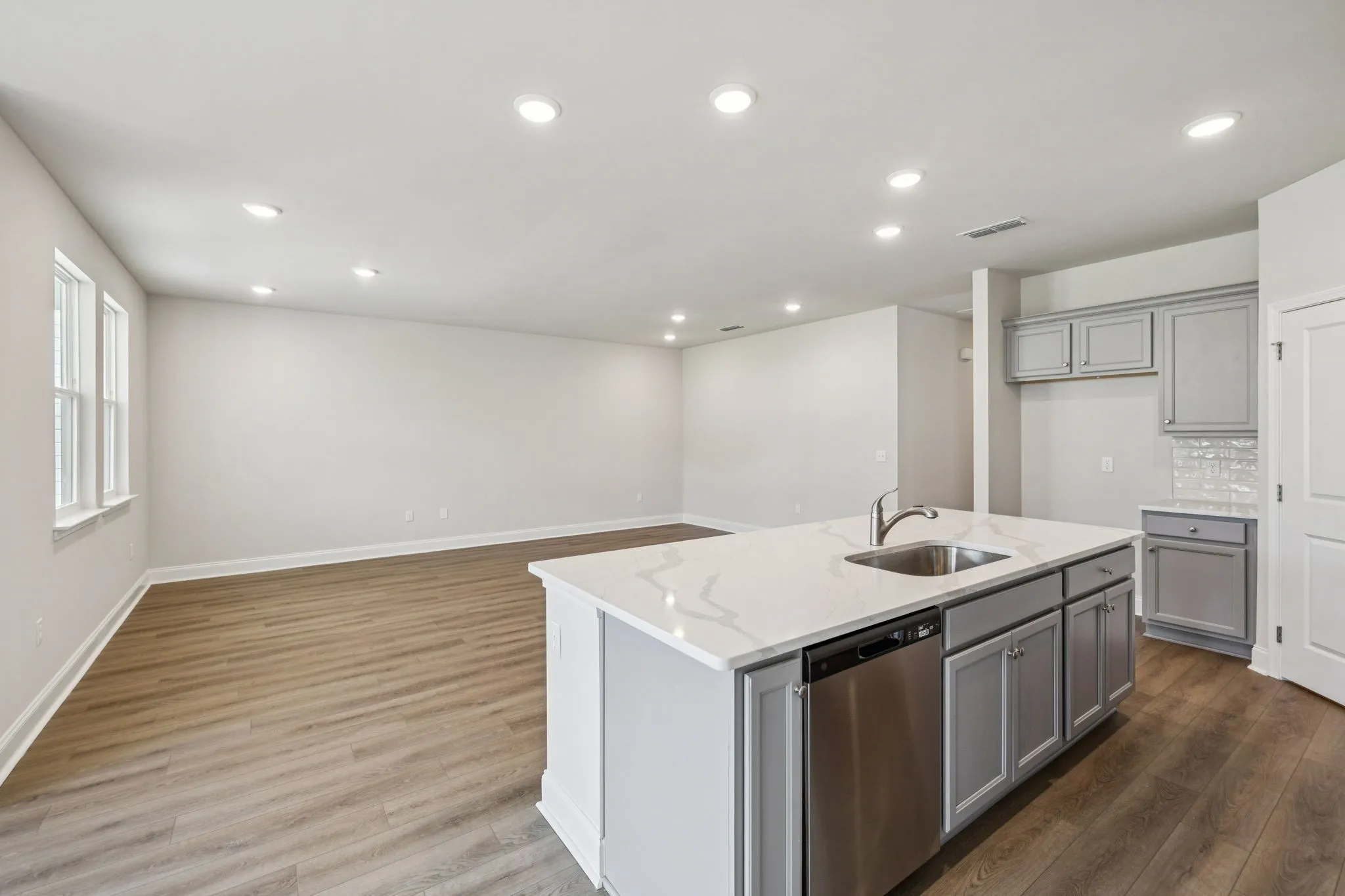 The kitchen shines with quartz countertops, light gray cabinetry, stainless accents, and a clean, timeless design that feels both elegant and inviting. Enjoy coffee at the island, dinner in the sunlit dining area, or relaxing evenings on the covered patio.