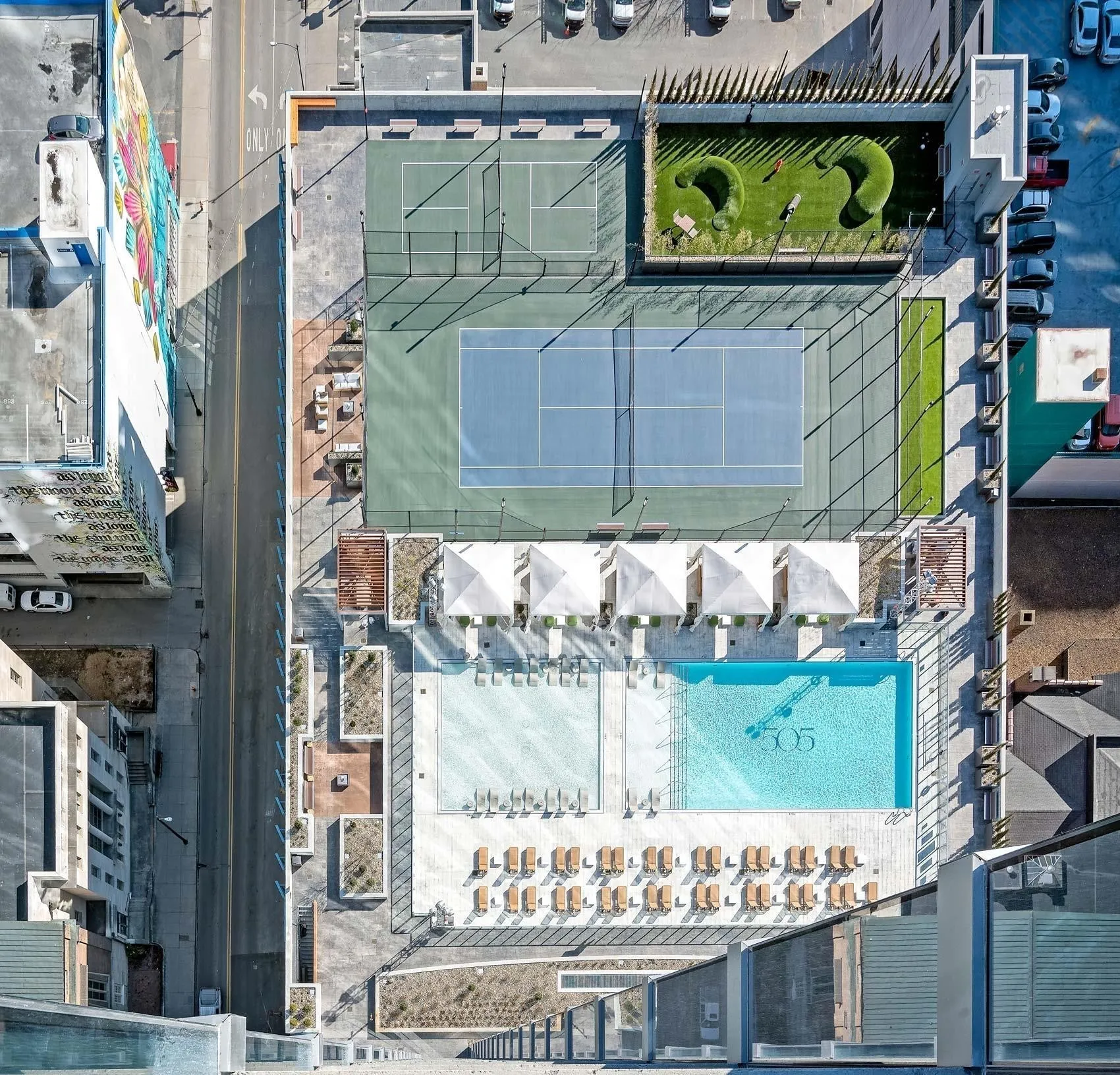 Residents enjoy secure access and exceptional local resources, all within walking distance to dining, entertainment, and the business district. The building offers an unrivaled amenity experience with a rooftop saltwater pool and cabanas, tennis and pickleball courts, fire pit and grilling lounges, an extensive dog park, premier fitness center and multiple indoor social and entertainment spaces, including “Wine Down Wednesdays”!