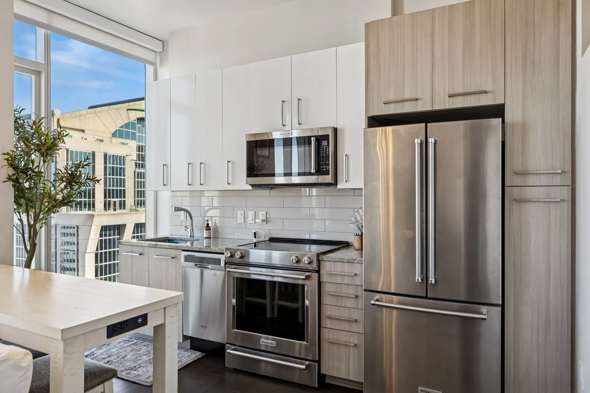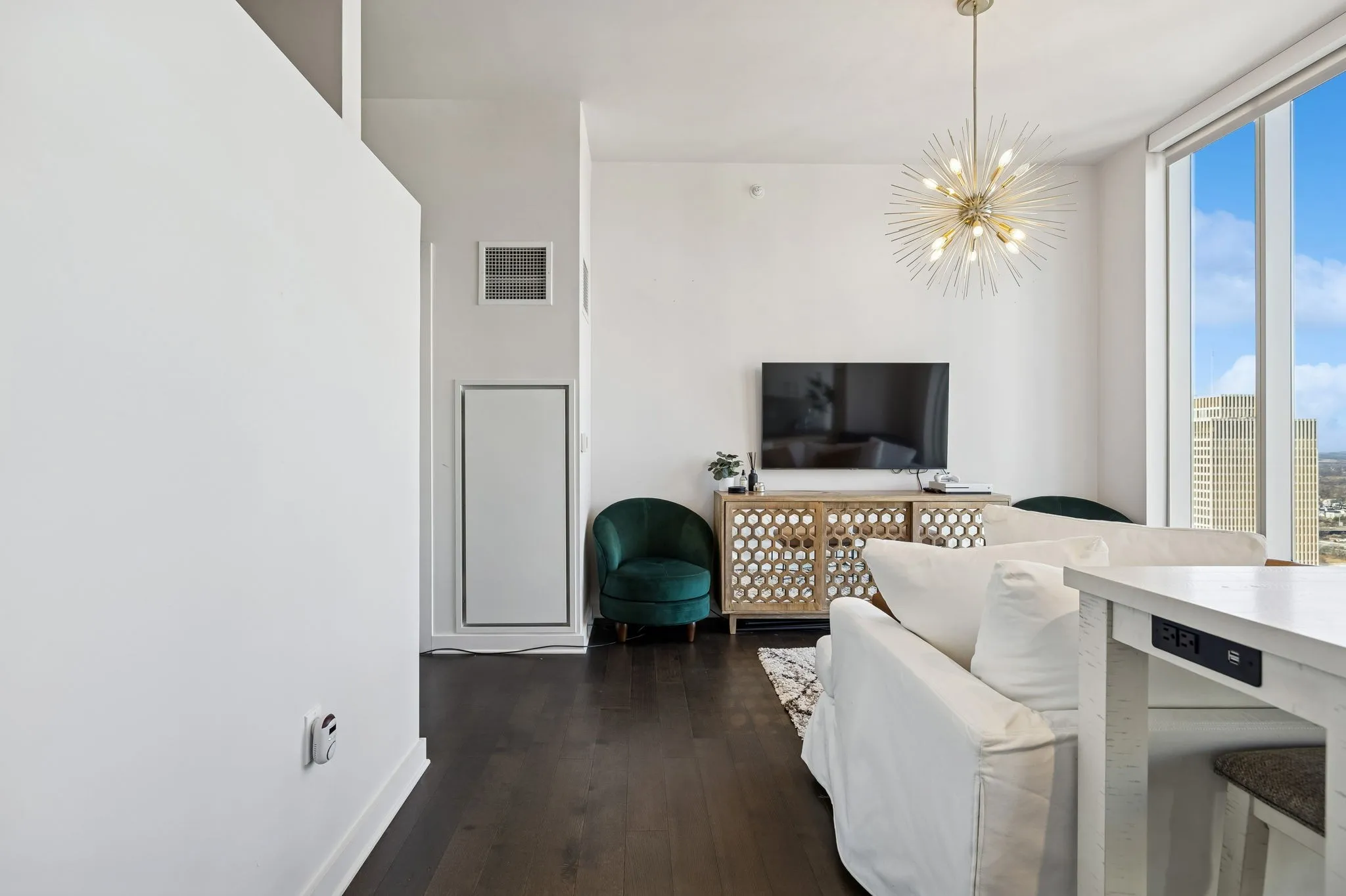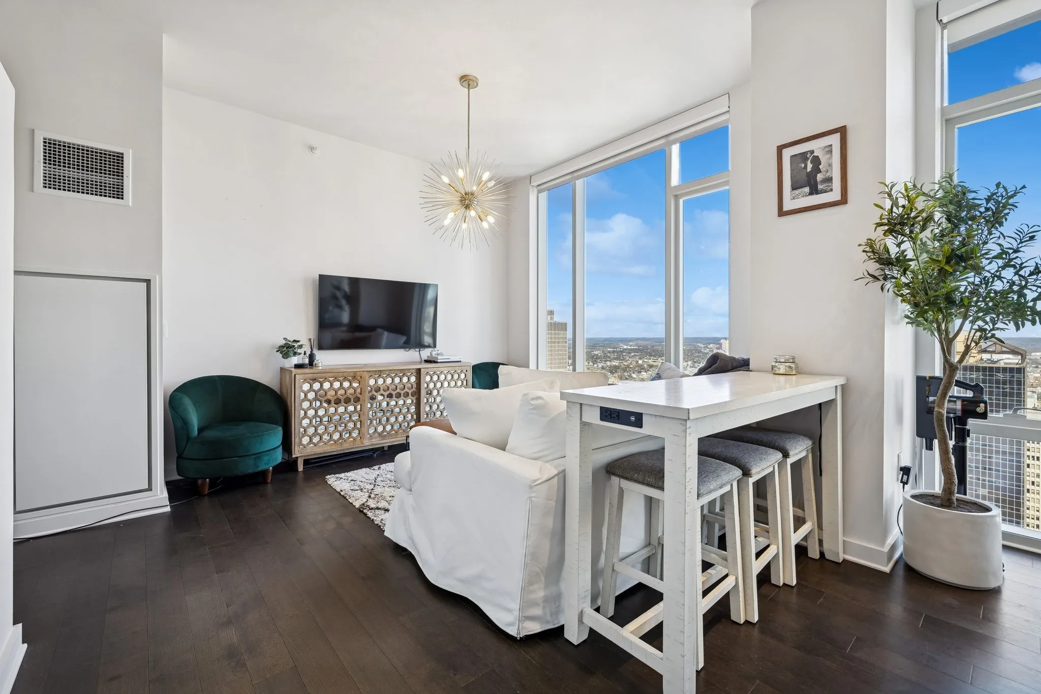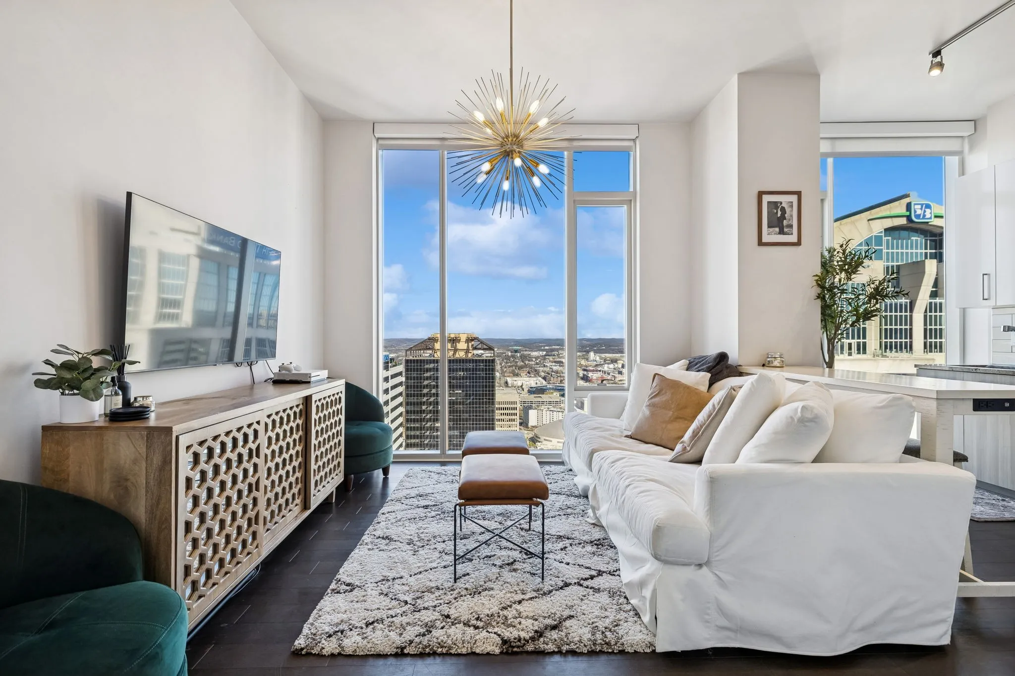Perched on the 33rd floor, this north facing residence captures sweeping skyline views with a direct look over First Horizon Park and the Nashville Sounds stadium. Floor to ceiling windows frame the city beautifully, filling the space with natural light and showcasing unforgettable sunsets and evening lights.