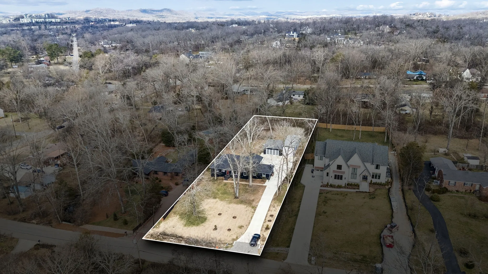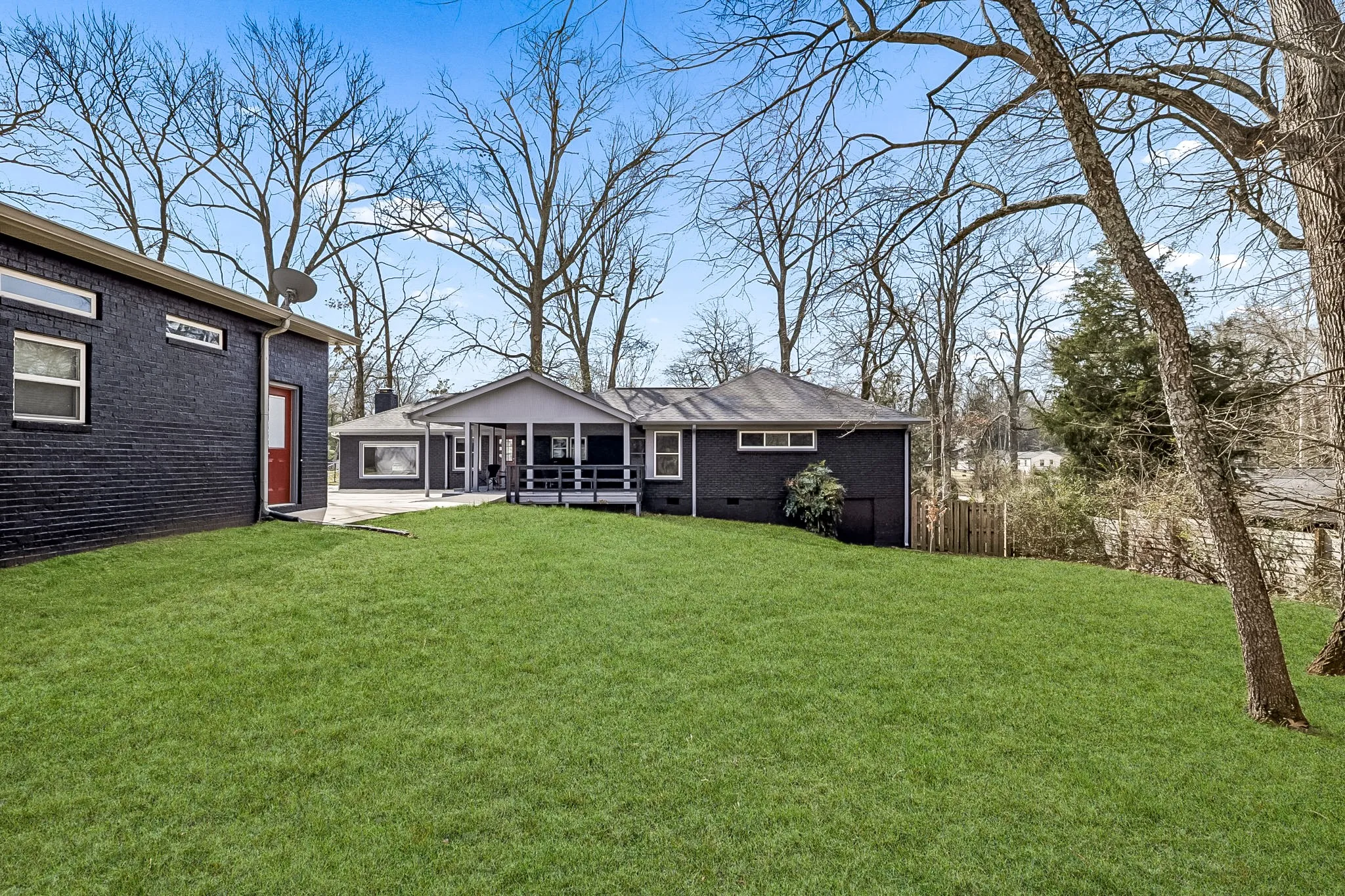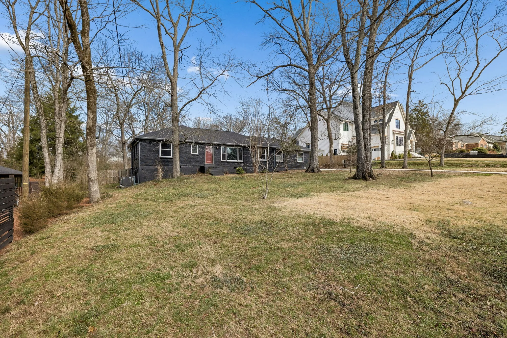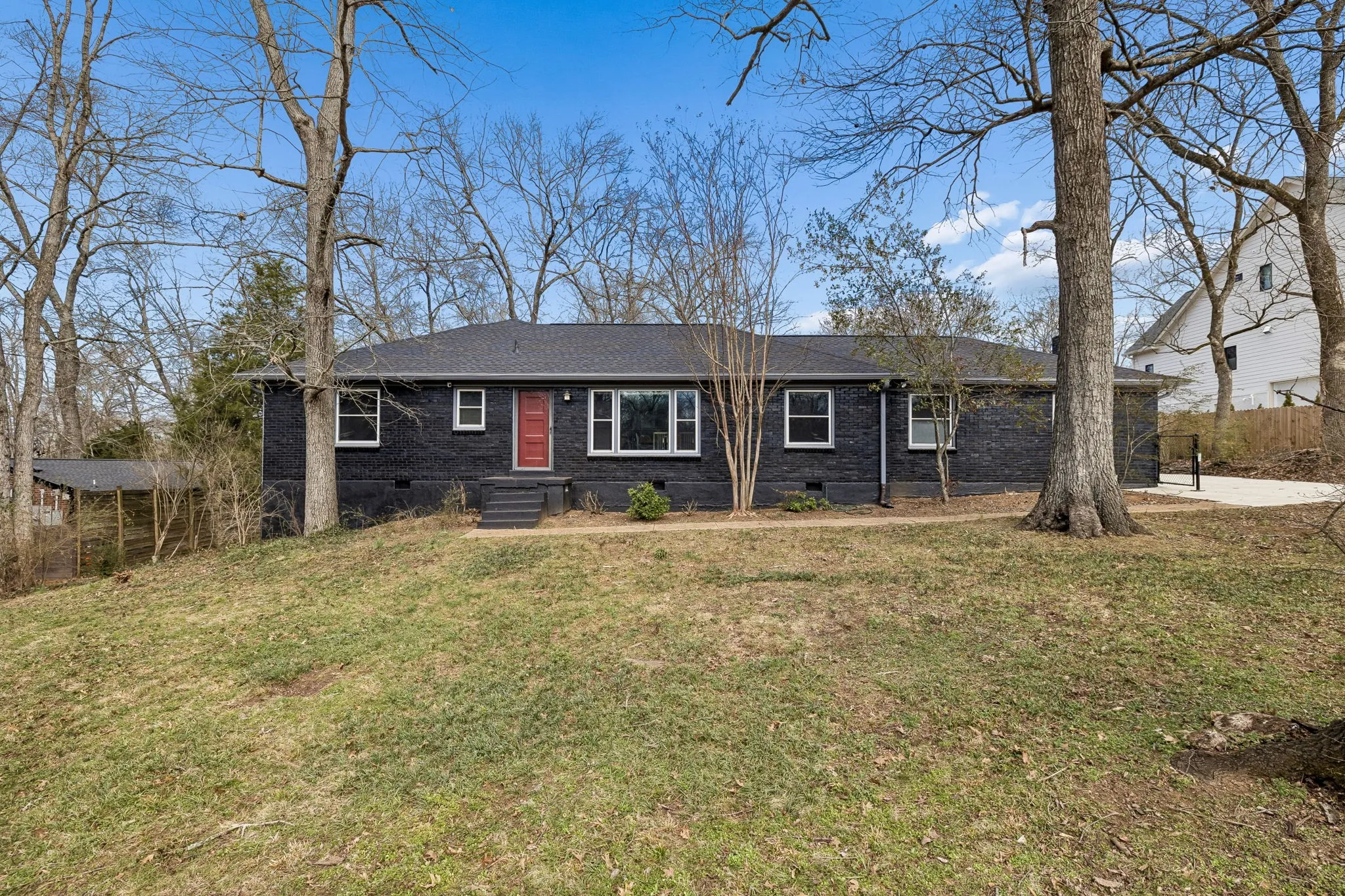 Tucked away in the highly sought-after Hillwood Estates/Brook Meade community of West Nashville, this well-maintained single-story ranch home sits on just under an acre minutes from shopping, dining, and all that West Nashville has to offer. Inside, you’ll find 3 bedrooms (with 2 primary suites) and 2 bathrooms thoughtfully arranged around an easy, flowing floor plan. Upon entering the home, the spacious living room is filled with natural light and can easily accommodate both a lounge area and dining room. Adjacent to the living room is a bright kitchen featuring a breakfast bar, granite countertops and pantry. The family room located just off the kitchen showcases warm Saltillo terracotta title floors, period piece wood paneling, built in bookcases and wood burning fireplace. Two doors lead to the backyard, one of which there is an oversized covered patio with natural gas hookups for a BBQ. The space overlooks a private wooded fully fenced backyard including an electric driveway gate. The oversized primary suite with new cherrywood oak floors serves as a true retreat, filled with natural light and a door to the covered patio the room comes complete with a generous en-suite bath which was remodeled in the last six months. The primary bathroom features heated floors, a large walk in shower, separate soaking tub, a sink vanity area and a large walk-in closet. Direct access to the laundry room is off the primary bedroom but an additional door from the hallway could be easily added. There is a 720 square foot detached garage/workshop area that is temperature-controlled (heated and cooled) and has a sink with a dedicated water heater for quick cleanups. The property also features 2 separate storage areas for an RV or trailer storage. With a new roof, new plumbing, new water heater and a prime West Nashville location less then 2 miles to Nashville West Shopping Center, Costco, and dining don’t miss this rare opportunity to own a private acre sought-after neighborhood.