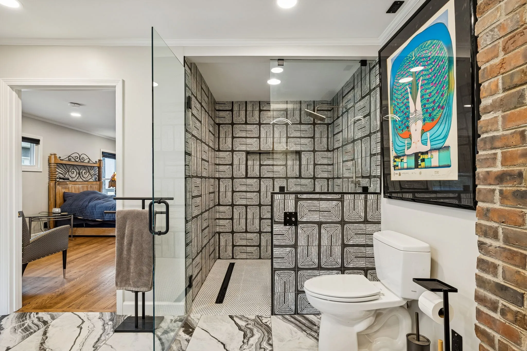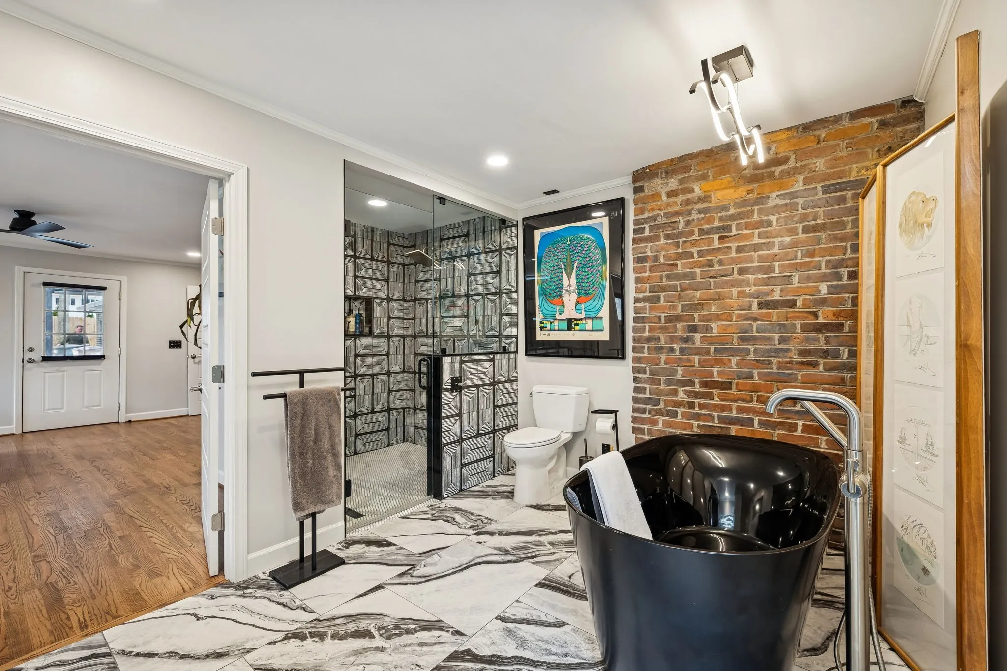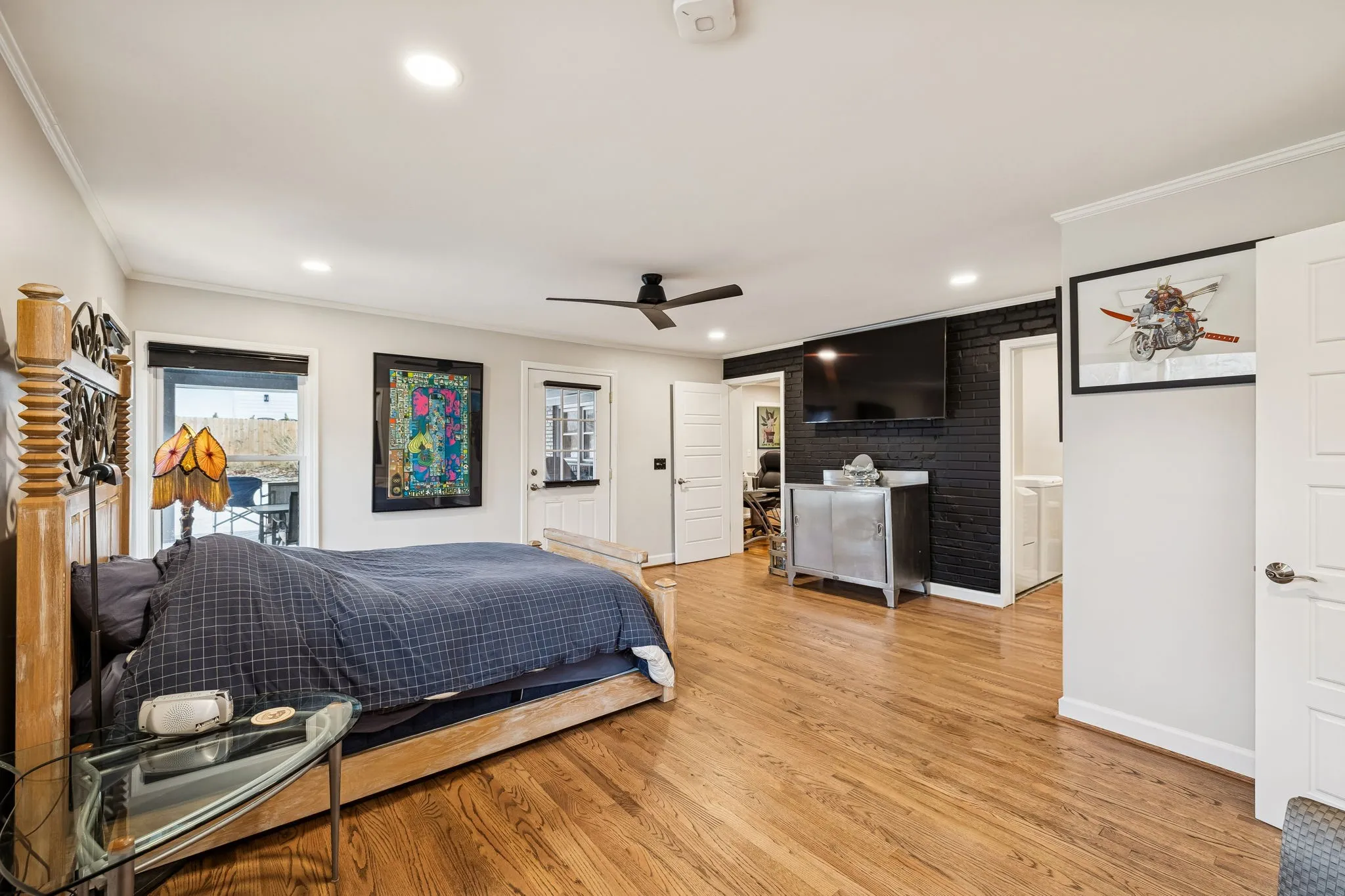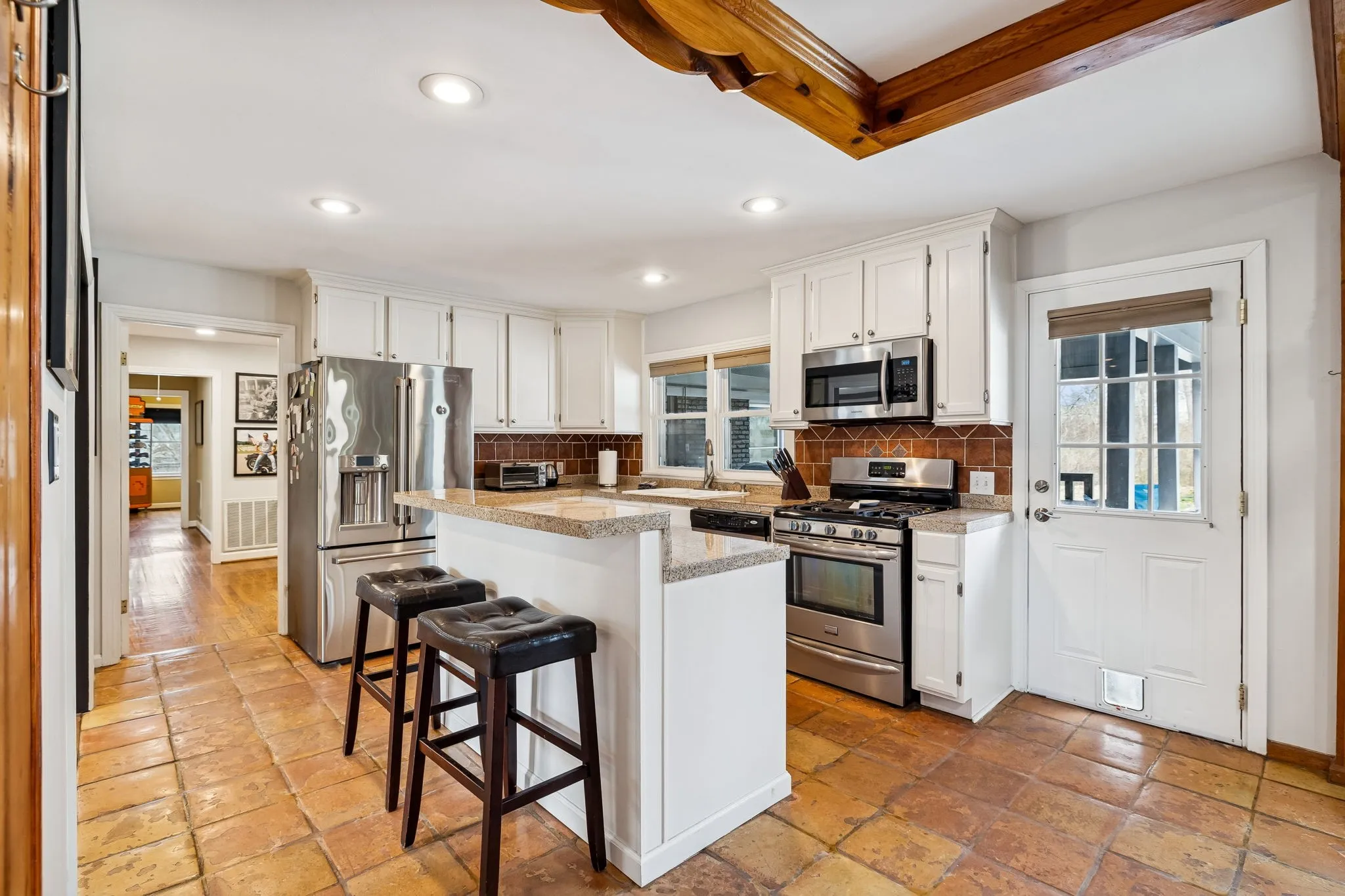 Tucked away in the highly sought-after Hillwood Estates/Brook Meade community of West Nashville, this well-maintained single-story ranch home sits on just under an acre minutes from shopping, dining, and all that West Nashville has to offer. Inside, you’ll find 3 bedrooms (with 2 primary suites) and 2 bathrooms thoughtfully arranged around an easy, flowing floor plan. Upon entering the home, the spacious living room is filled with natural light and can easily accommodate both a lounge area and dining room. Adjacent to the living room is a bright kitchen featuring a breakfast bar, granite countertops and pantry. The family room located just off the kitchen showcases warm Saltillo terracotta title floors, period piece wood paneling, built in bookcases and wood burning fireplace. Two doors lead to the backyard, one of which there is an oversized covered patio with natural gas hookups for a BBQ. The space overlooks a private wooded fully fenced backyard including an electric driveway gate. The oversized primary suite with new cherrywood oak floors serves as a true retreat, filled with natural light and a door to the covered patio the room comes complete with a generous en-suite bath which was remodeled in the last six months. The primary bathroom features heated floors, a large walk in shower, separate soaking tub, a sink vanity area and a large walk-in closet. Direct access to the laundry room is off the primary bedroom but an additional door from the hallway could be easily added. There is a 720 square foot detached garage/workshop area that is temperature-controlled (heated and cooled) and has a sink with a dedicated water heater for quick cleanups. The property also features 2 separate storage areas for an RV or trailer storage. With a new roof, new plumbing, new water heater and a prime West Nashville location less then 2 miles to Nashville West Shopping Center, Costco, and dining don’t miss this rare opportunity to own a private acre sought-after neighborhood.