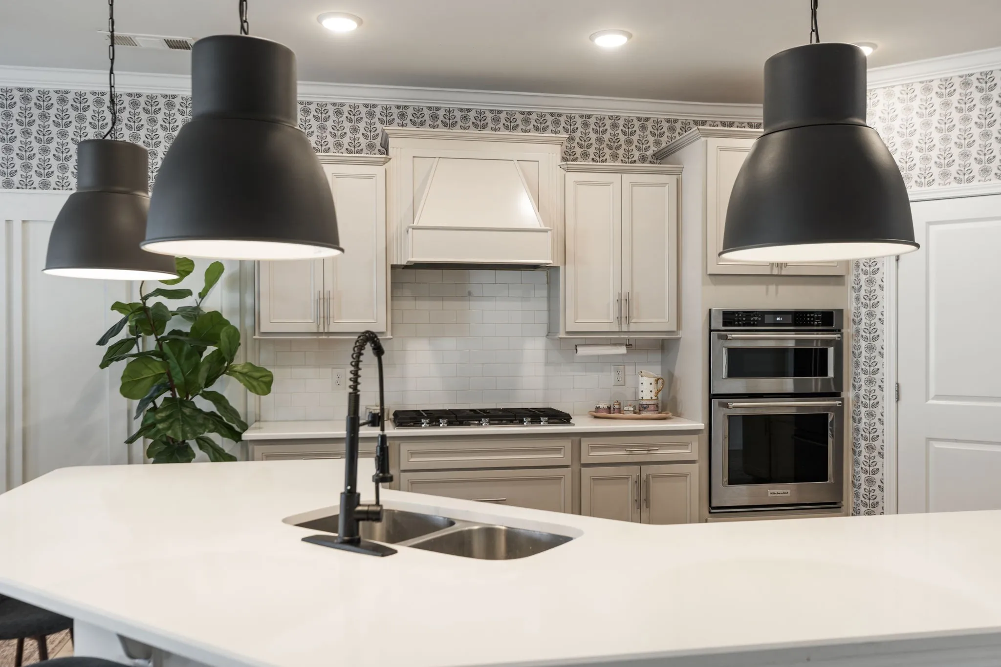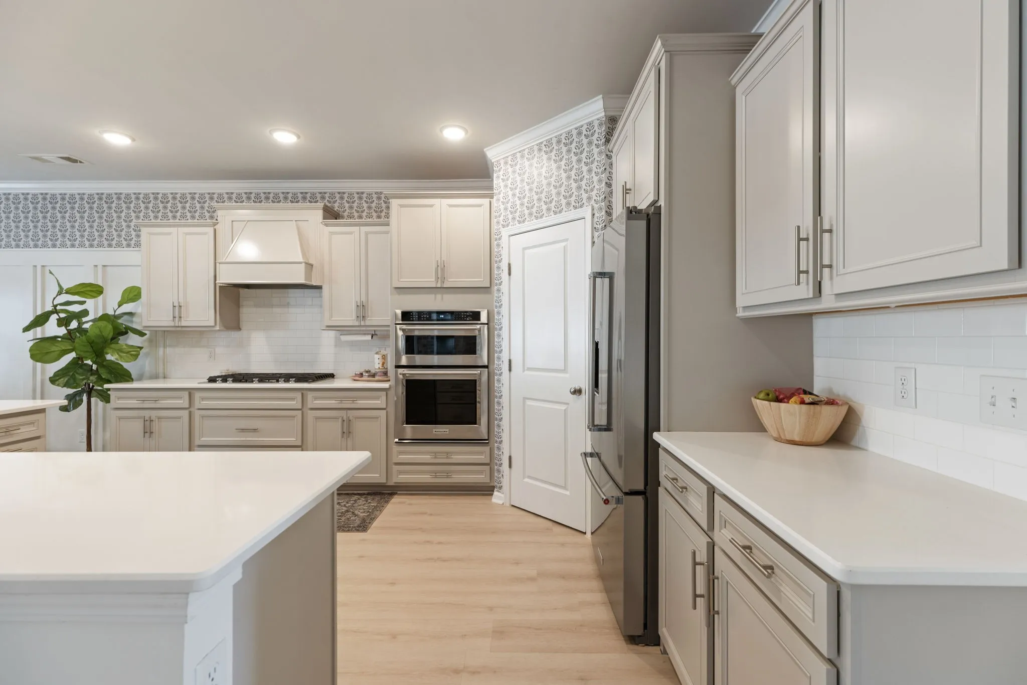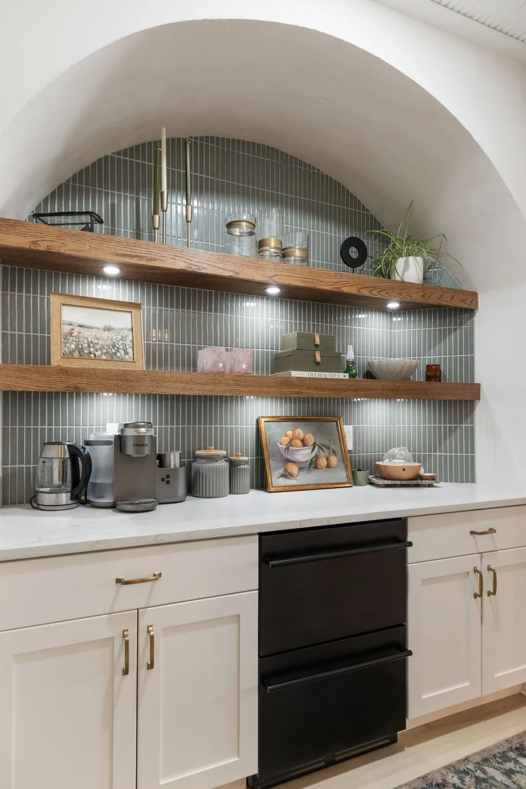 The updated kitchen includes quartz countertops, a gas cooktop, stainless steel appliances, and a newly added coffee or cocktail bar with built-in refrigerated beverage drawers and a custom brick accent wall. Recent improvements include new flooring, fresh interior paint throughout, Roman shades, a fully replaced lighting package, and a fenced backyard.