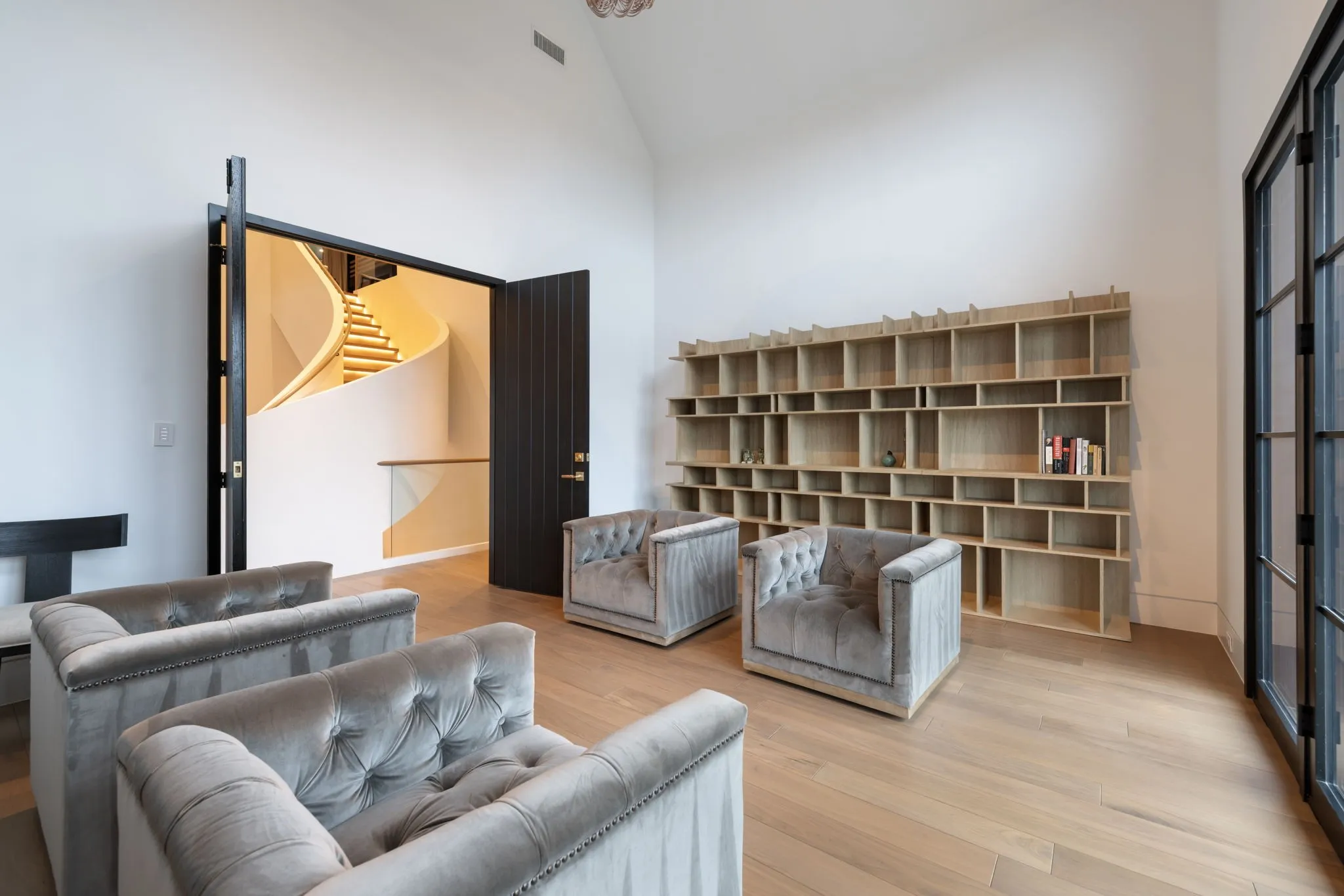 A masterfully designed luxury residence where architecture, technology, and craftsmanship converge. This extraordinary home offers a 3-car attached garage with a professionally epoxied floor, elevator access to the main level, a private lock-off bay, and a heated mudroom with custom storage, sink, and laundry hookup.Throughout, solid slab oak doors, integrated baseboards, inset TVs, and Weathershield VUE triple-pane windows set a refined tone, complemented by Lutron and Control4 automation, Luma security, Toto fixtures, designer plumbing finishes, and whole-home water softening. The lower level welcomes with herringbone flooring, limestone walls, and a grand plaster staircase illuminated by gallery-style lighting. Two thoughtfully designed guest suites feature Roman clay finishes, Neolith vanities, and flexible layouts ideal for office or gym use. A striking theater boasts tiered seating, Wolf projection, Origin Acoustics, acoustic ceiling clouds, and a brass-accented serving bar with Calacatta Monet marble—perfect for entertaining. The main level is anchored by a serene primary suite with steam shower, Taj Mahal slabs, heated bidet, two-sided fireplace, stone walls, and enhanced insulation with integrated shades. A junior suite, refined powder room, and a chef’s kitchen complete the level, featuring Gaggenau column refrigeration, Ilve 60” dual-fuel range, Bertazzoni appliances, hidden pantry, steel hood with brass strapping, and Zip hot/cold system. An expansive laundry room offers walnut cabinetry and abundant workspace. Outdoor living rivals resort accommodations with a two-sided fireplace, automated screened enclosure, EVO grill, gas fire pit, prep station, and patio heaters. The top floor features a loft bunk retreat, balcony with fireplace and heaters, a full bath, and a private bedroom with a hidden music room—an exceptional finale to a truly one-of-a-kind home.