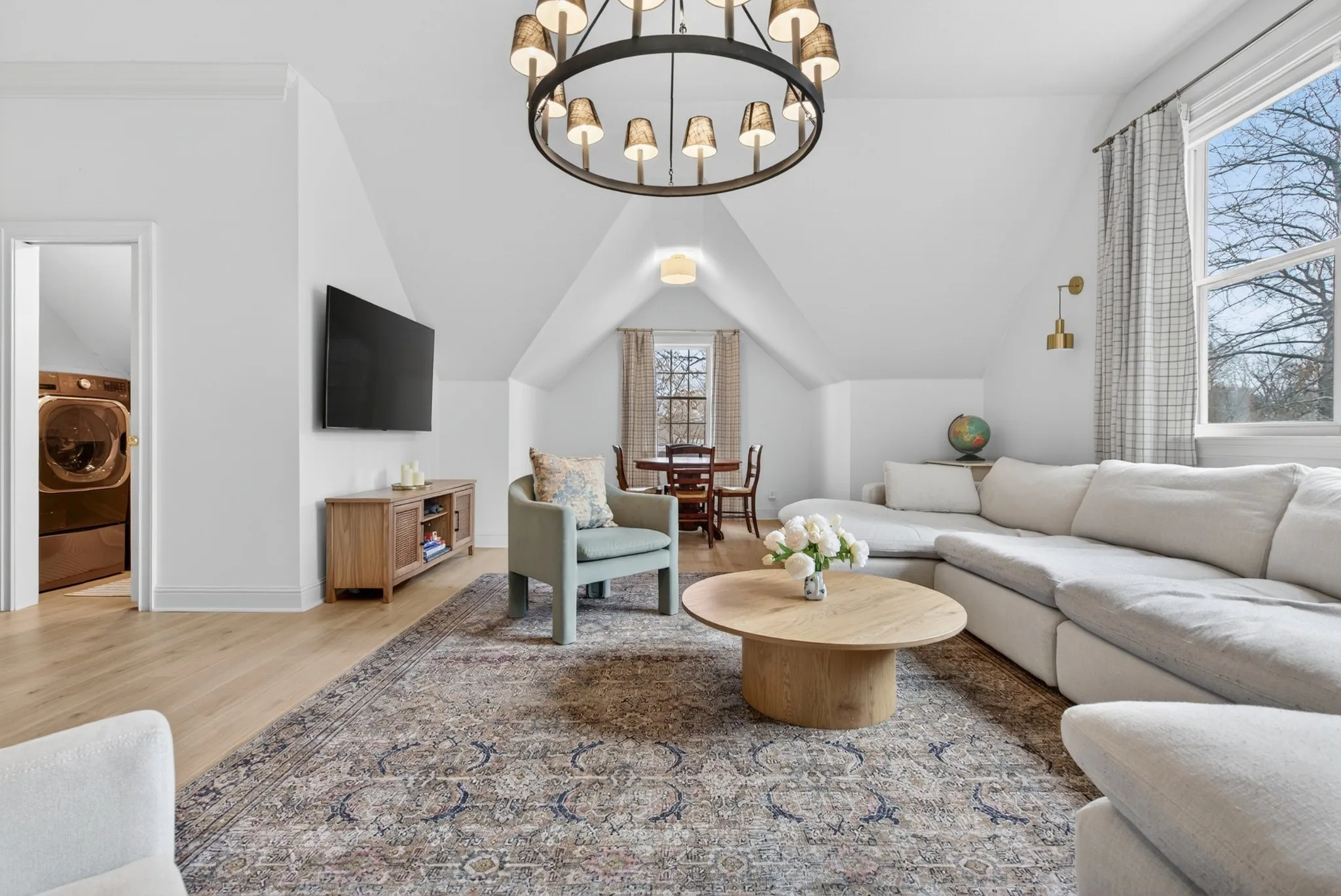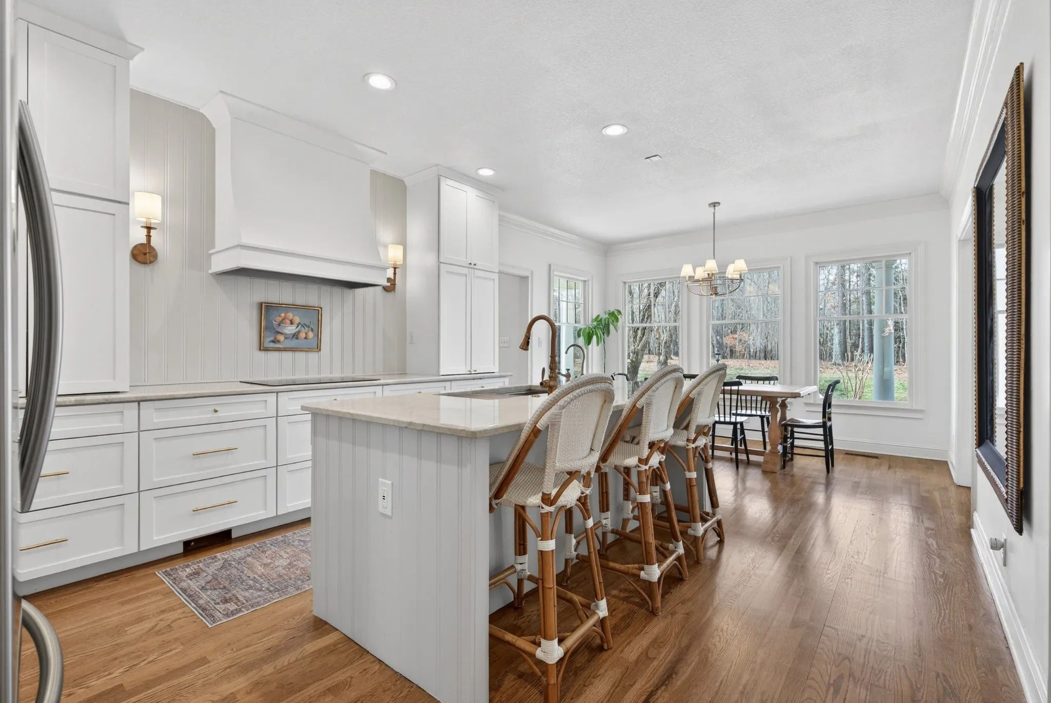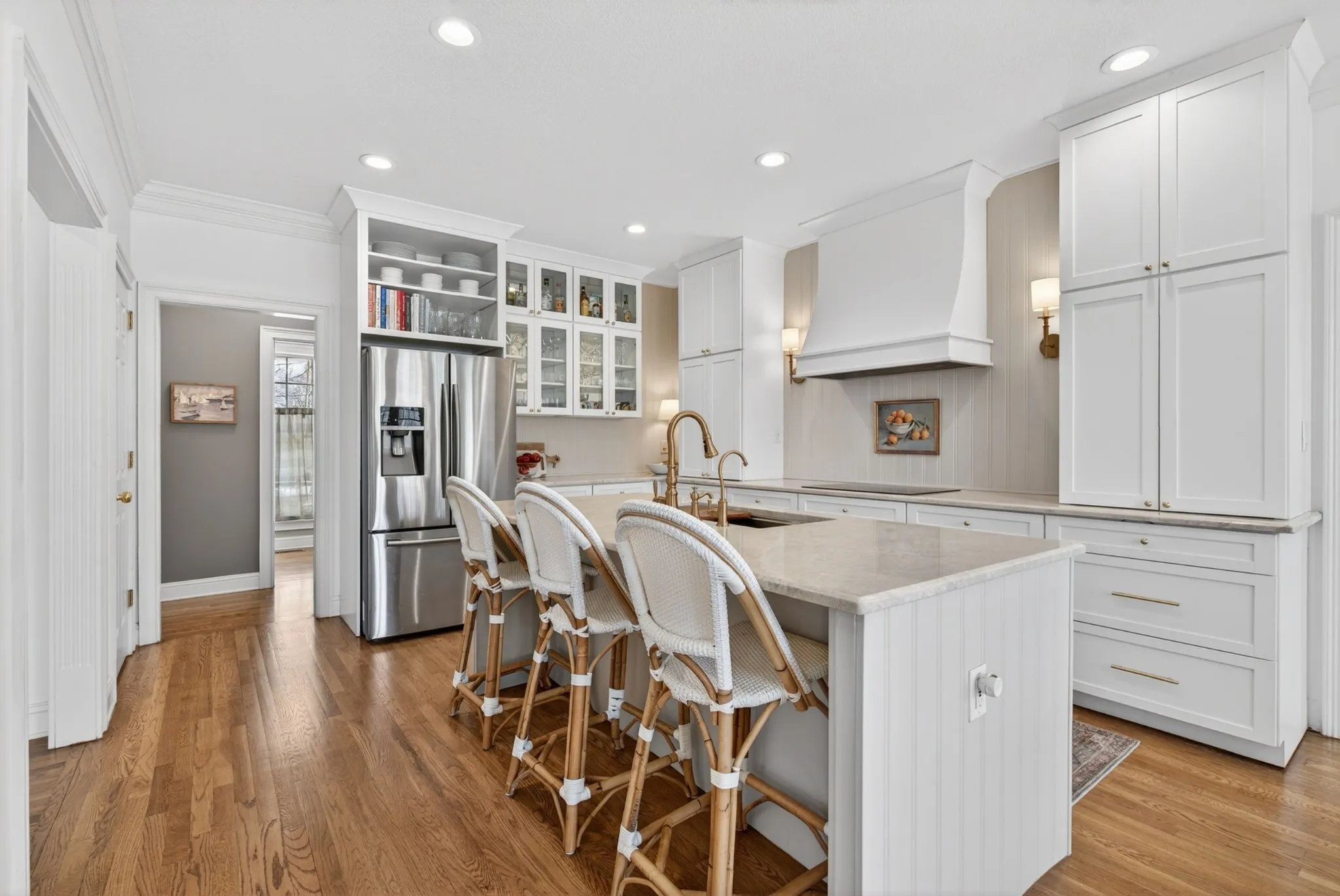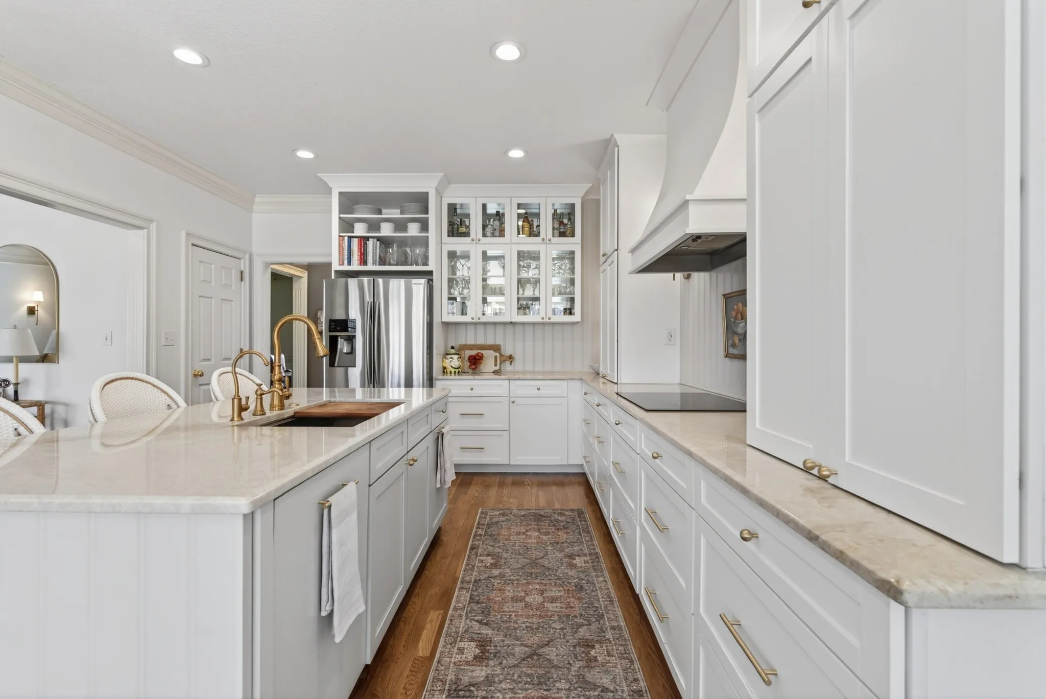 The expansive floor plan is designed for versatility, featuring **dual primary suites**—one on the main level and one upstairs—making it ideal for multigenerational living. At the heart of the home, the chef’s kitchen underwent a massive renovation, featuring an induction cooktop, natural stone counters, and a secondary scullery equipped with double ovens and an oversized pantry.