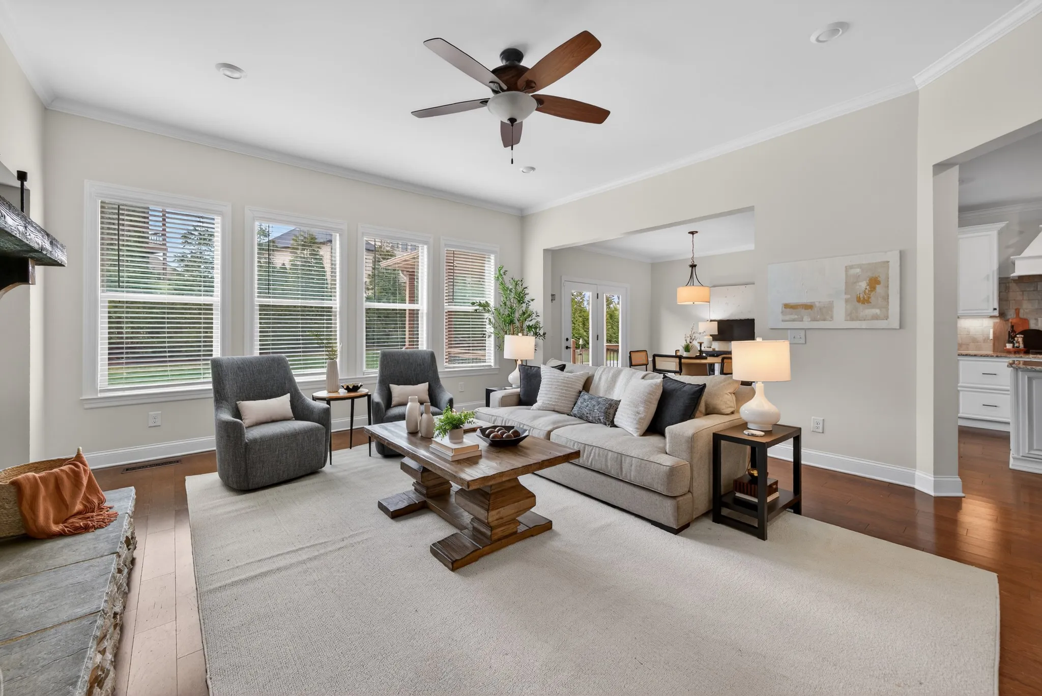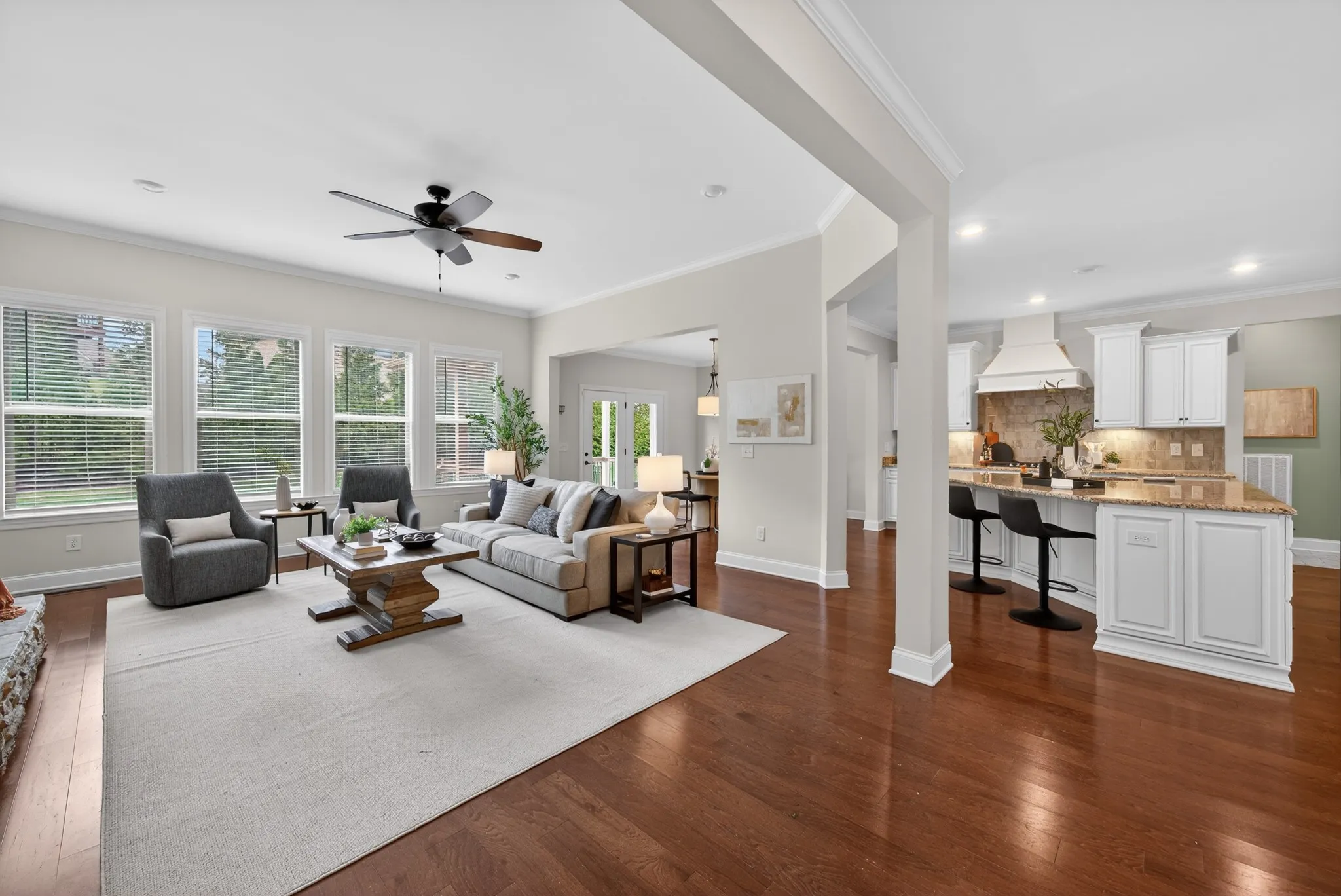 From the moment you enter, the home makes a statement. A gracious foyer is anchored by a dedicated executive office, while formal and informal dining spaces provide versatility for intimate gatherings and elegant hosting alike. The open-concept living area flows seamlessly into a chef’s kitchen—creating a refined yet welcoming atmosphere ideal for both everyday living and large-scale entertaining.