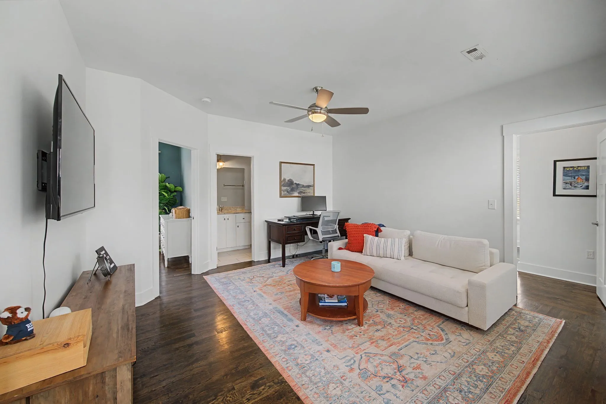 The brand-new kitchen features classic white shaker cabinets, quartz countertops, handcrafted zellige tile backsplash, stainless steel appliances, and designer lighting. Thoughtful finishes and curated wallpaper throughout create a warm, elevated aesthetic. Upstairs, a versatile bonus room provides the ideal flex space for a home office, playroom, media room, or workout area.