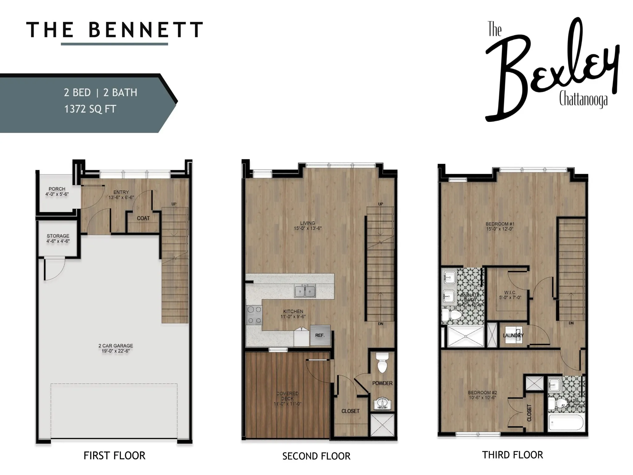 Featured floor plan, The Bennett, offers a timeless design ideal for both everyday living and entertaining. This is the only layout that includes a spacious covered deck off the main living area–perfect for outdoor dining, relaxing, or working from home. The third floor features two private ensuite bedrooms, while the main living level includes a convenient powder room for guests. With multiple professionally curated interior finish packages available, The Bennett delivers both functionality and elevated style.