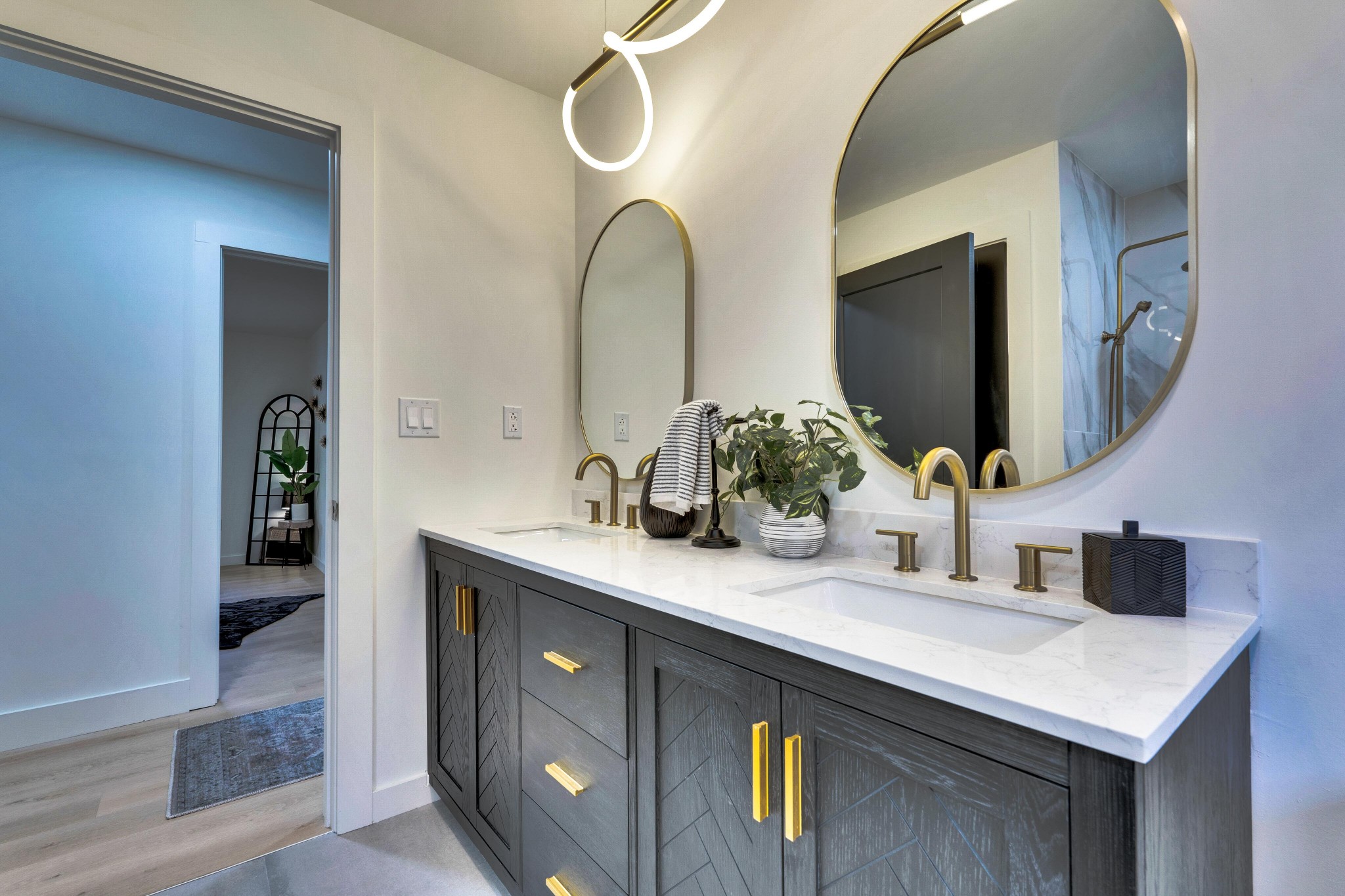 "LongDescription" => "Custom inset vanity with full doors, heavy-duty brass hardware, soft-close, all wood, dual vanity with LED mirrors and options for color lighting!"