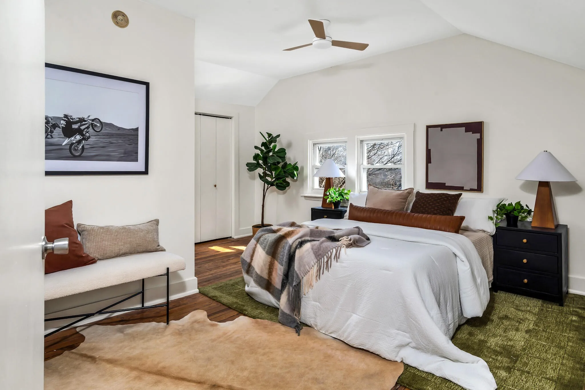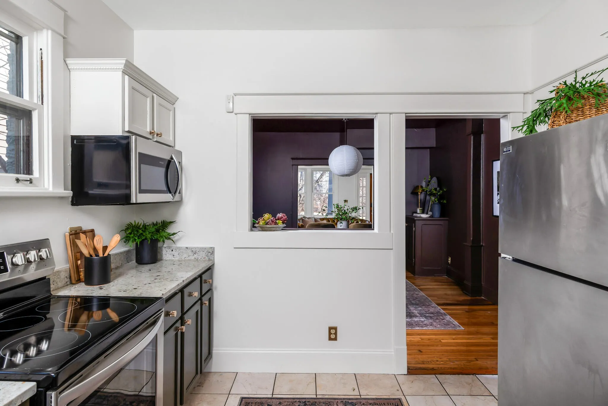 The light-filled living spaces create a warm and welcoming feel throughout. The kitchen features new countertops installed last year and newer appliances, including a refrigerator, dishwasher, and microwave all less than three years old. The upstairs right bedroom includes a recently replaced shower, adding modern appeal.