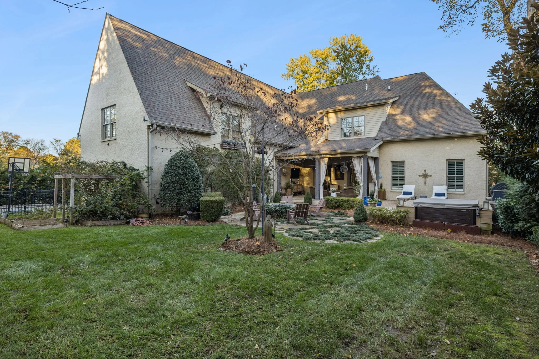 Welcome to this gorgeous family home with a sumptuous master suite downstairs and four additional family bedrooms up, all with full private bathrooms. Fantastic Jenn-Air, stainless and marble kitchen with icemaker and large island, Unfinished expansion area over the three-car garage. Private and secluded rear covered patio with grilling area, built in hot tub and firepit,