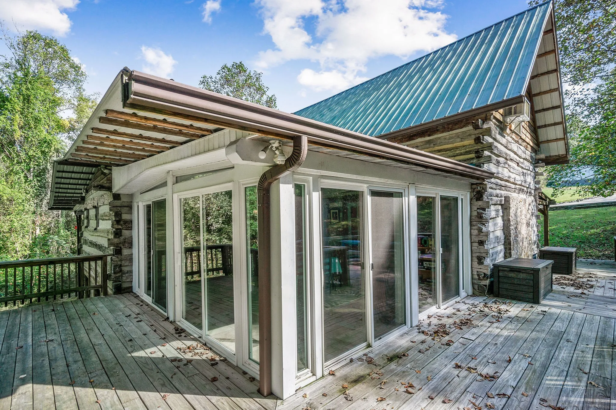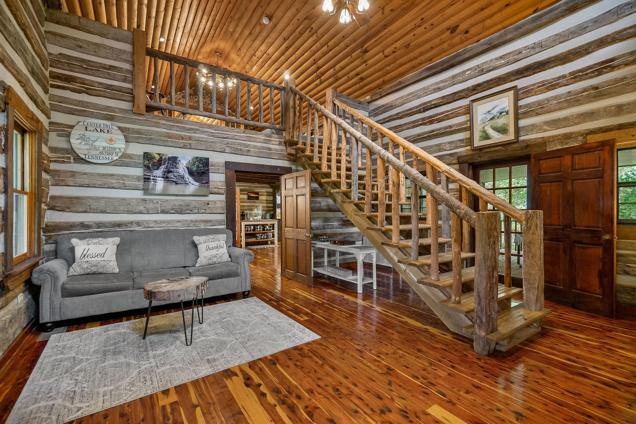 Timeless craftsmanship and modern comfort meet in this remarkable 2,444 sq ft log home, originally built from two authentic mid-1800s log cabins relocated from Kentucky and thoughtfully reconstructed in 2006. Rich in history and character, the home blends true rustic charm with modern conveniences. The exterior features upgraded Poly-Crete chinking with natural quartz aggregate, providing a self-leveling finish that resists cracking, improves durability, and adds additional insulation. A sandstone rocking chair front porch welcomes you home, complemented by a screened-in porch and a heated and cooled sunroom with four sliding doors for year-round enjoyment. Inside, rustic finishes and the romantic fireplace create warmth and charm, while updated plumbing, electrical, and central heat and air ensure comfort. The main-floor bathroom features stone tile floors and a beautiful antique clawfoot tub. Situated on two parcels totaling nearly 14 acres, the property offers privacy, open space, and hunting potential. A circular concrete driveway adds convenience, and a horse barn plus enclosed storage under the deck provide functionality. Behind the home, a small spring-fed creek flows toward Center Hill Lake, creating a peaceful soundtrack you can hear from the back deck or sunroom. In summer, a cool breeze rises from the lake, making outdoor evenings especially enjoyable. Located about one mile from Cookeville Boat Dock and Marina with boat ramp access, just 20 minutes to Cookeville and approximately one hour to the airport, this home offers seclusion without isolation. Set well off the road with plenty of yard space for children to play, it’s ideal as a family home, private retreat, or inspiring getaway for writers, musicians, hunters, and lake lovers alike.