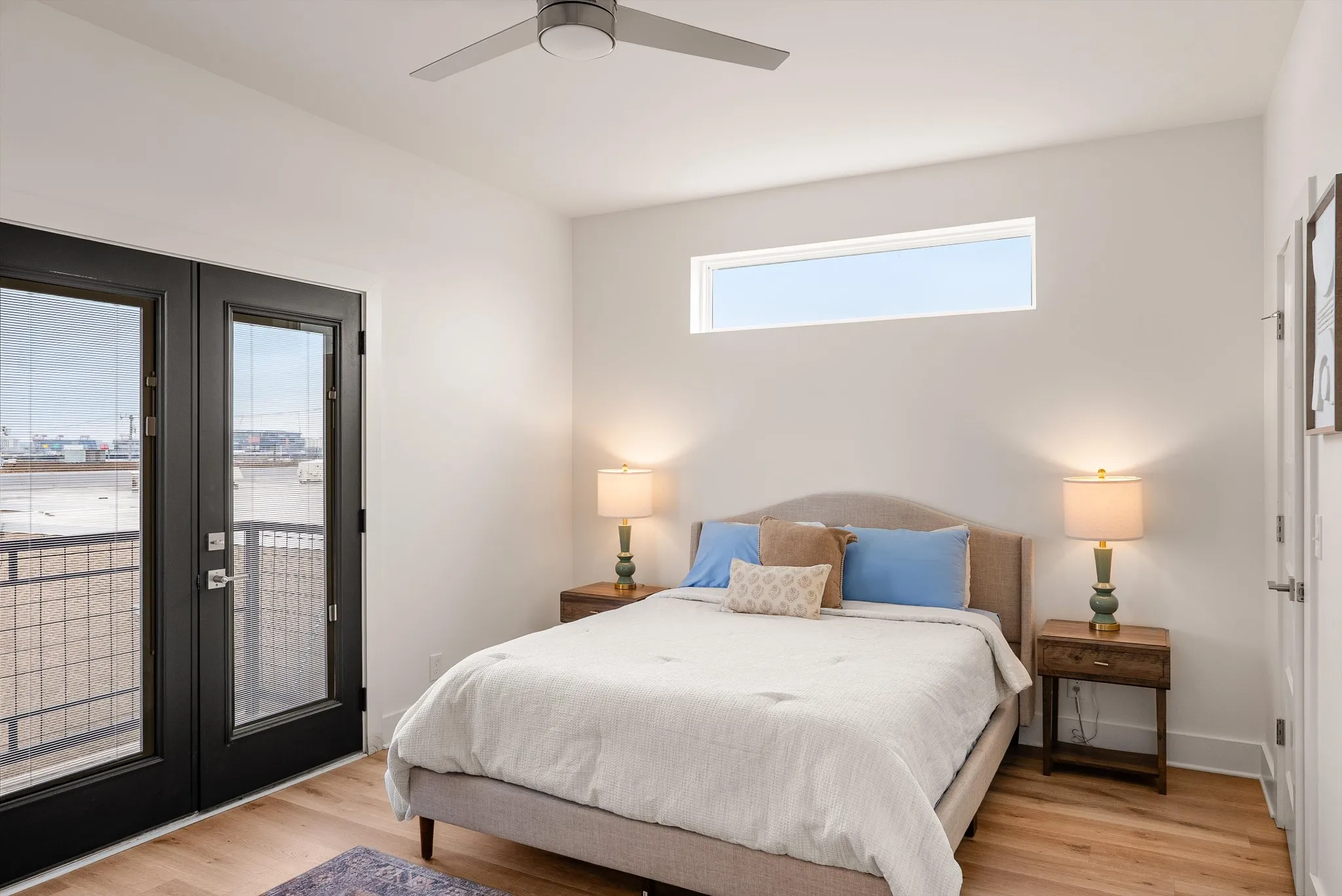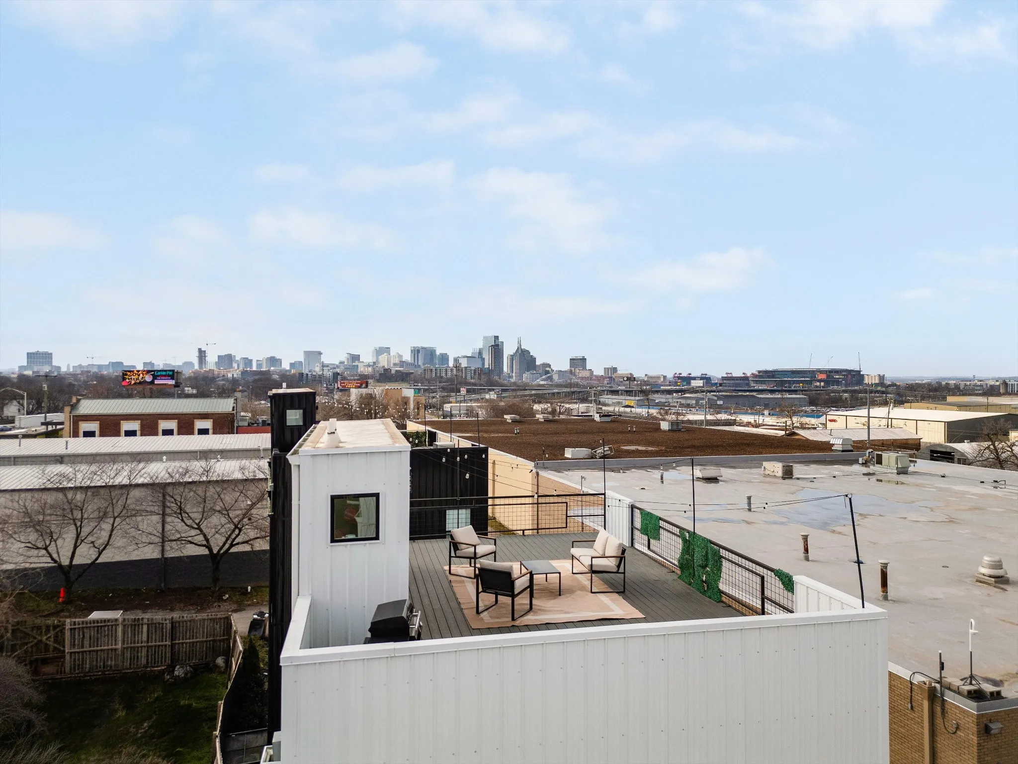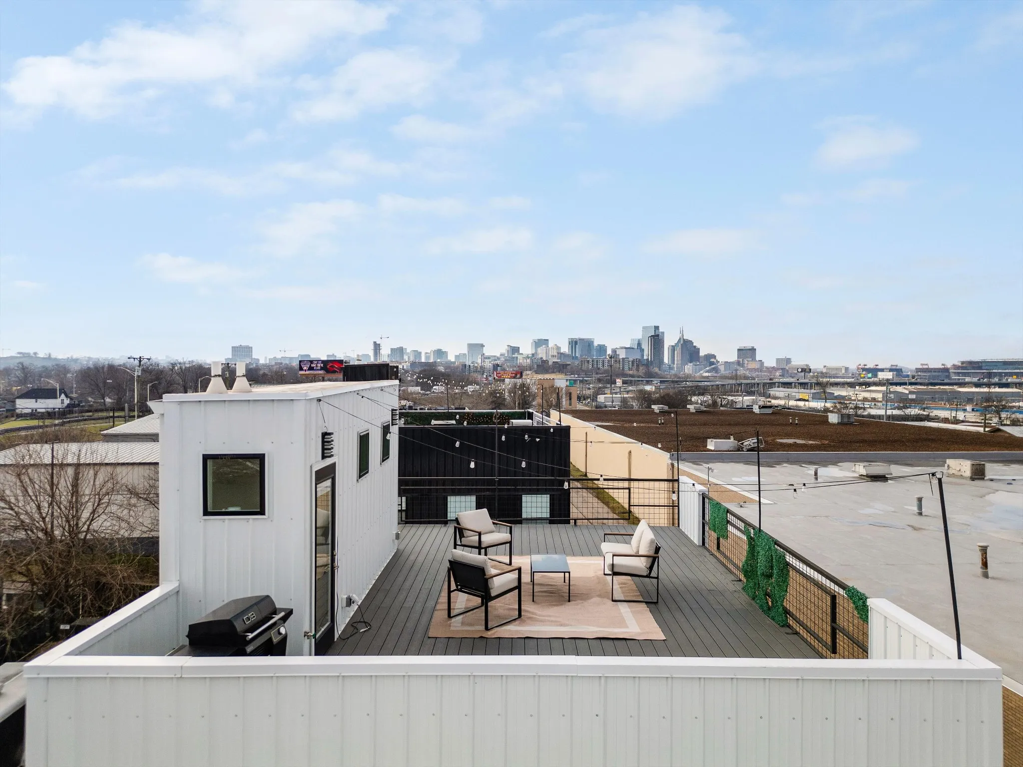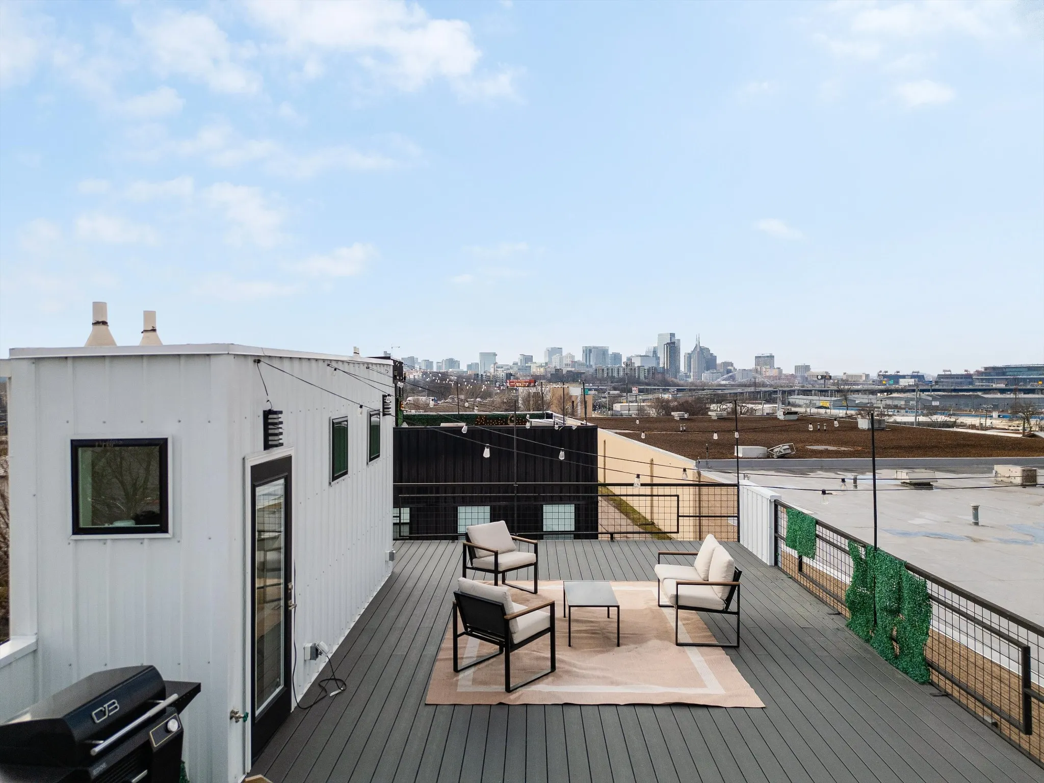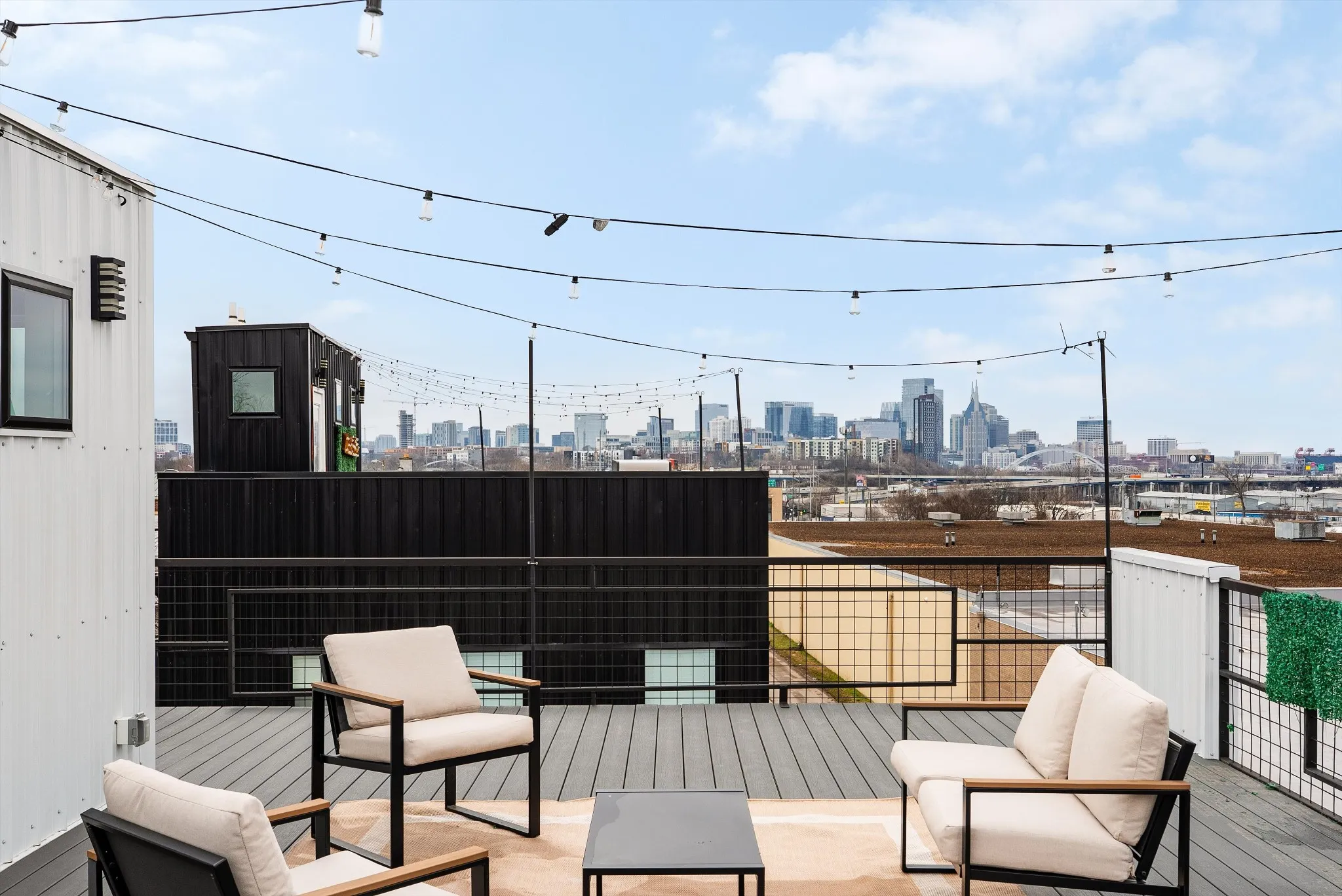 A standout feature is the rooftop deck with views of the Nashville skyline and Nissan Stadium—a major draw for guests and a rare find this close to downtown.