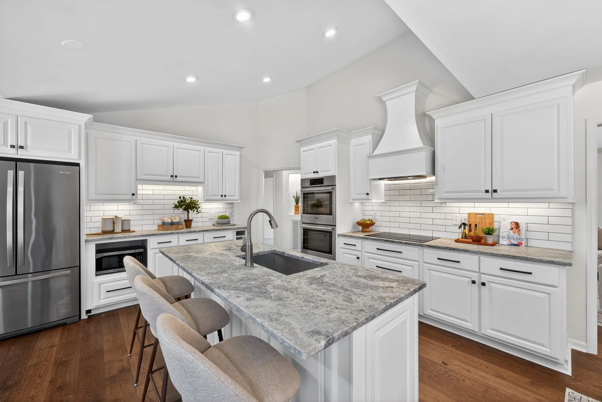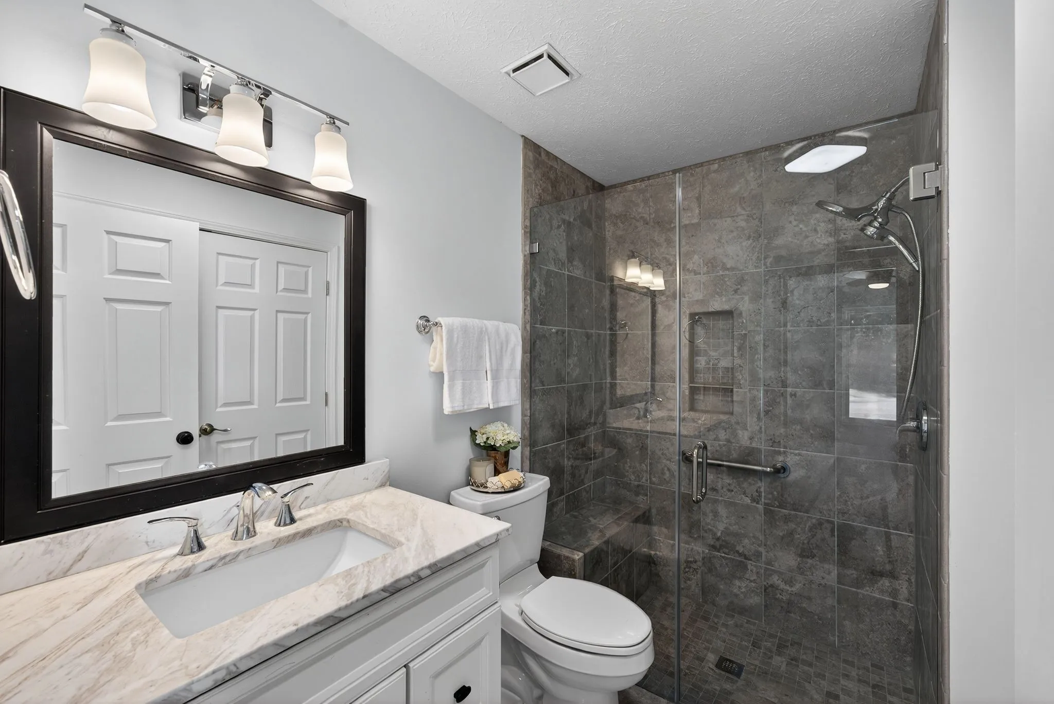 Extensive recent updates include a fully renovated primary bathroom with new fixtures, shower, tub, vanity, accessories, paint, and frameless glass shower door. New wood flooring in the living room, kitchen, primary bedroom/closet, and hallway. The kitchen features new granite countertops and backsplash along with an inductive cooktop. Additional improvements include a new exterior deck door, new granite fireplace hearth, new window in the bonus room (with warranty), new light fixtures, added LED can lights throughout, new tile floors in the primary bath and garage entry, new door hinges and stops, new floor vents, freshly painted exterior siding and trim (including the storage barn), new exterior LED light fixtures, and smooth ceilings in the living room and main hallway.