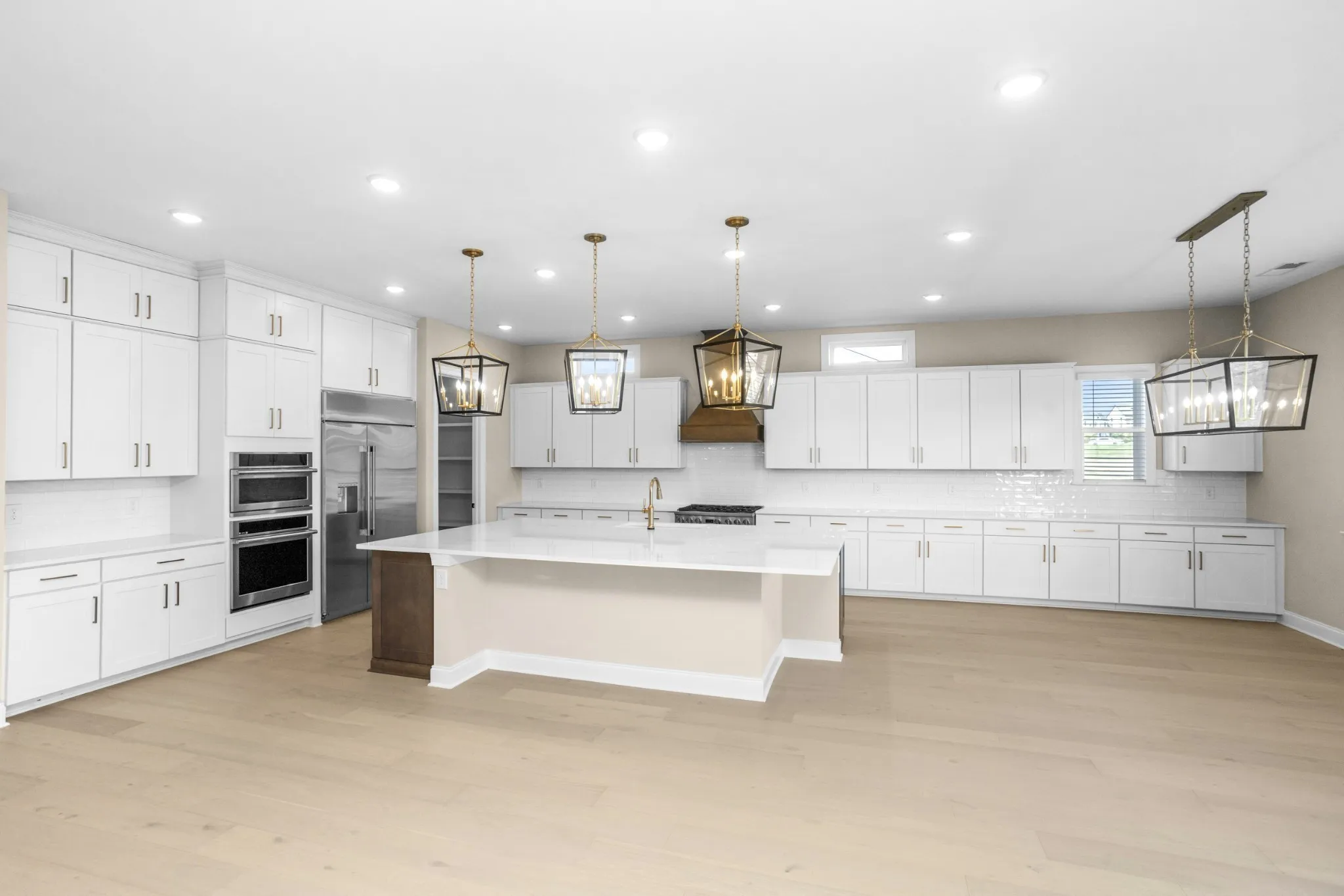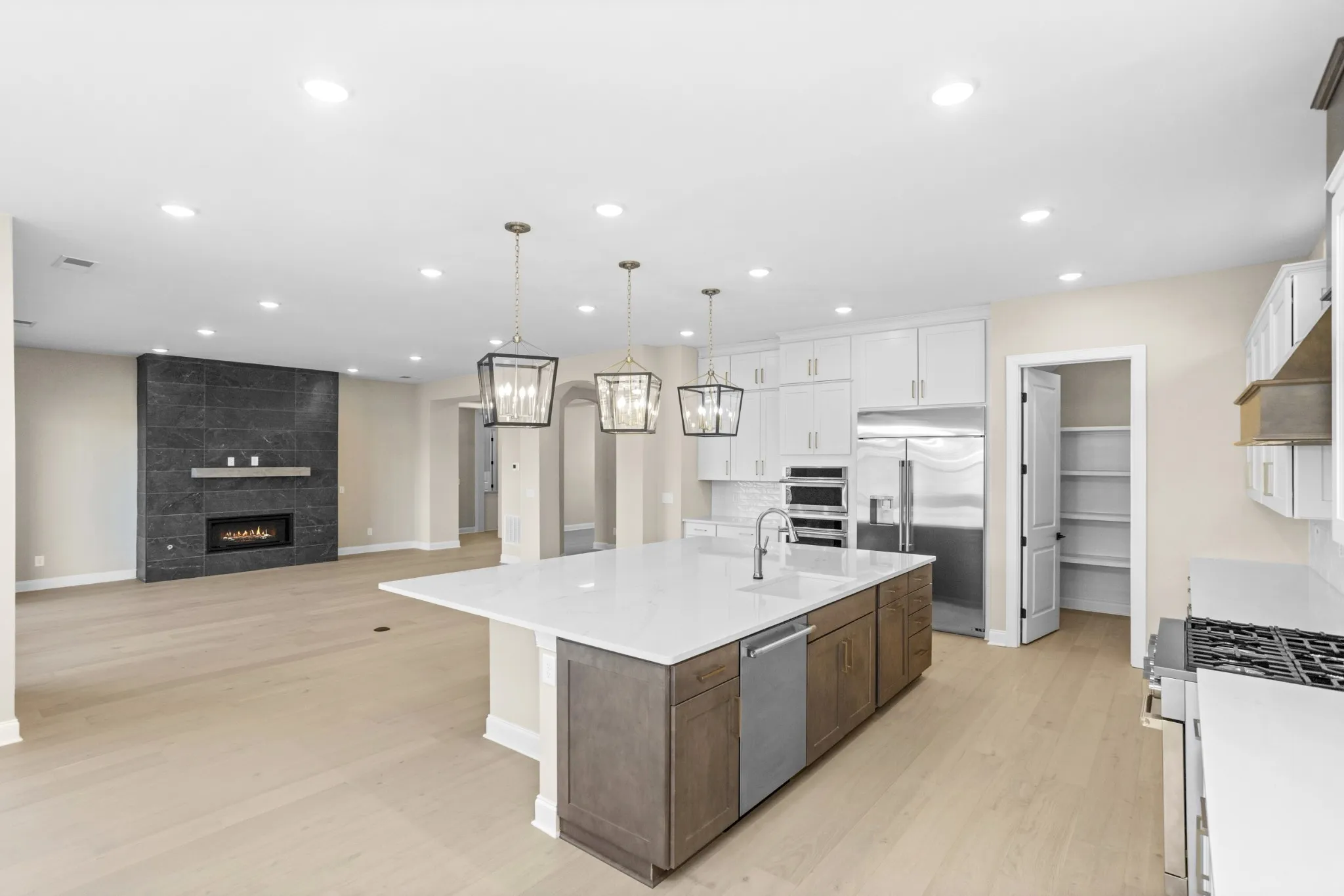 At the heart of the home, the gourmet kitchen—with oversized island, Monogram stainless appliances, and abundant storage—sets the stage for holiday entertaining. The living area extends to a covered porch through dramatic slide-away glass doors, creating seamless indoor-outdoor celebrations.
