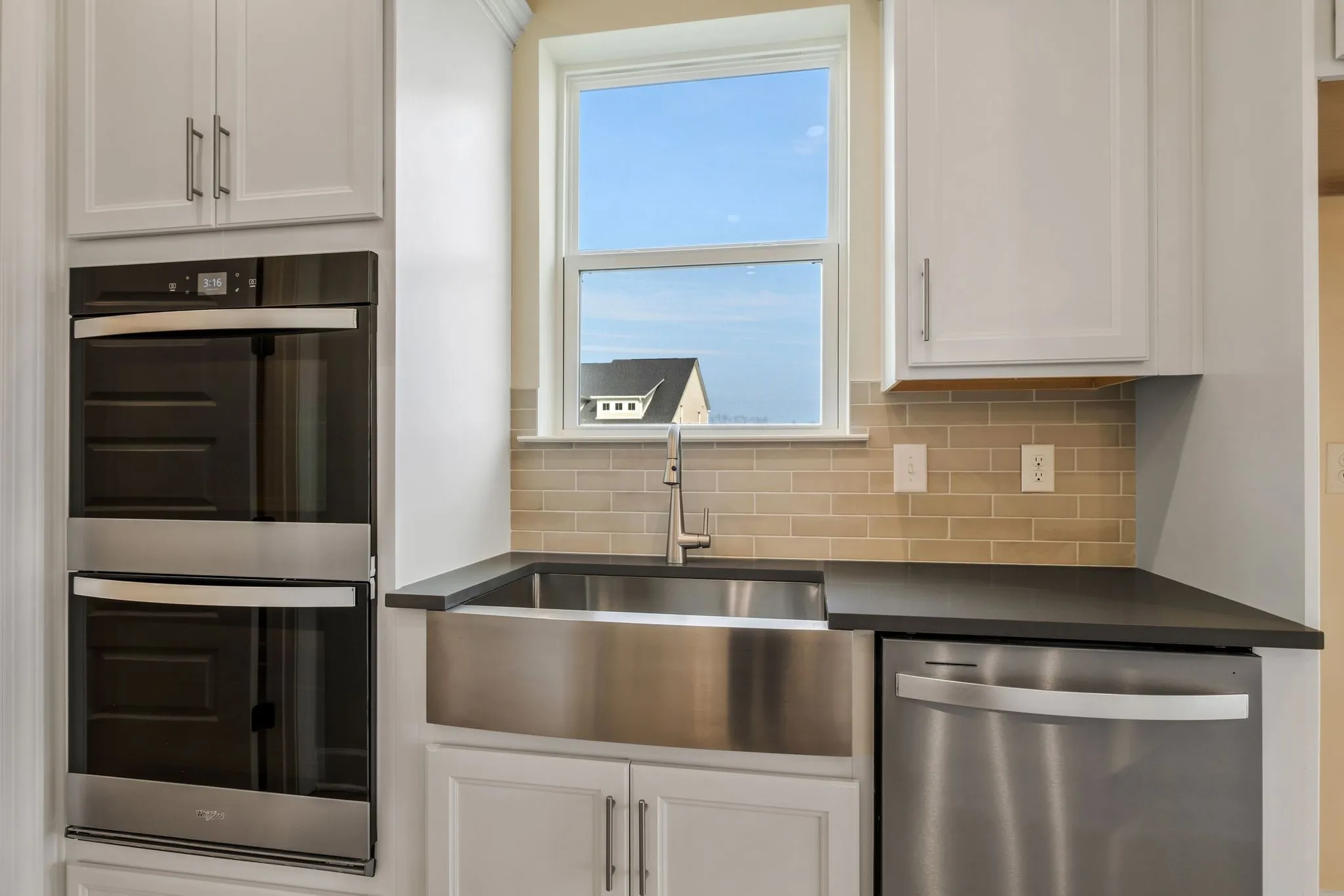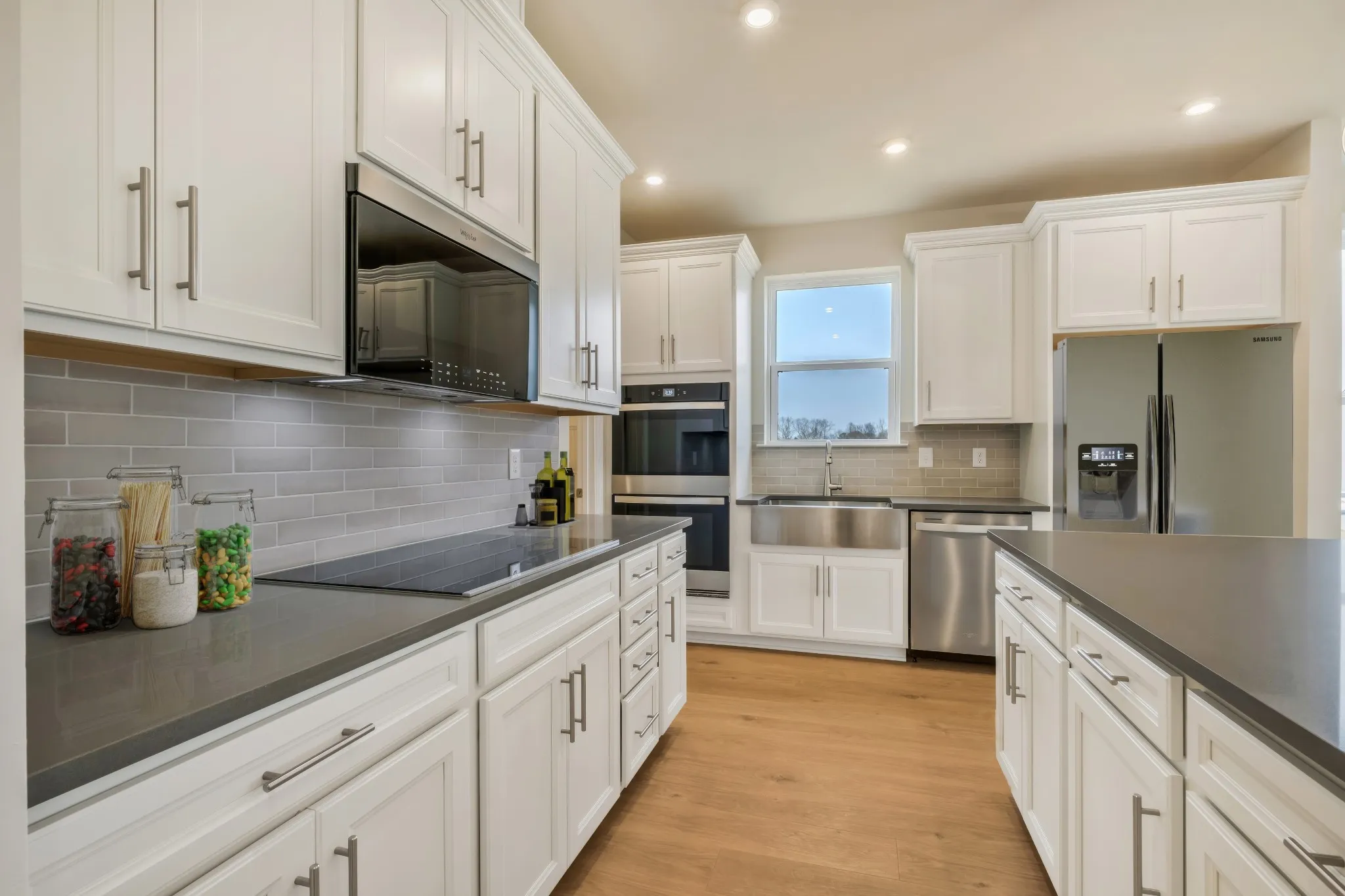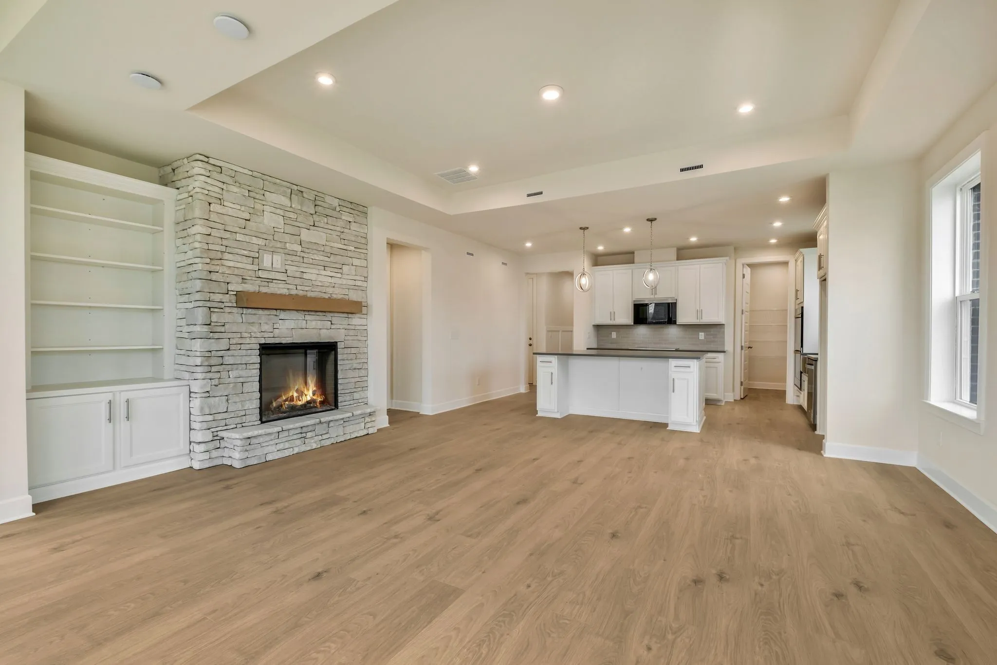 The kitchen is beautifully appointed with white cabinetry, quartz countertops, a stainless steel apron-front farmhouse sink, double wall ovens, and an electric cooktop. The Great Room showcases a cozy stacked-stone fireplace with a cedar-style mantle, creating a warm and inviting focal point. Hard-surface flooring flows throughout the main level.