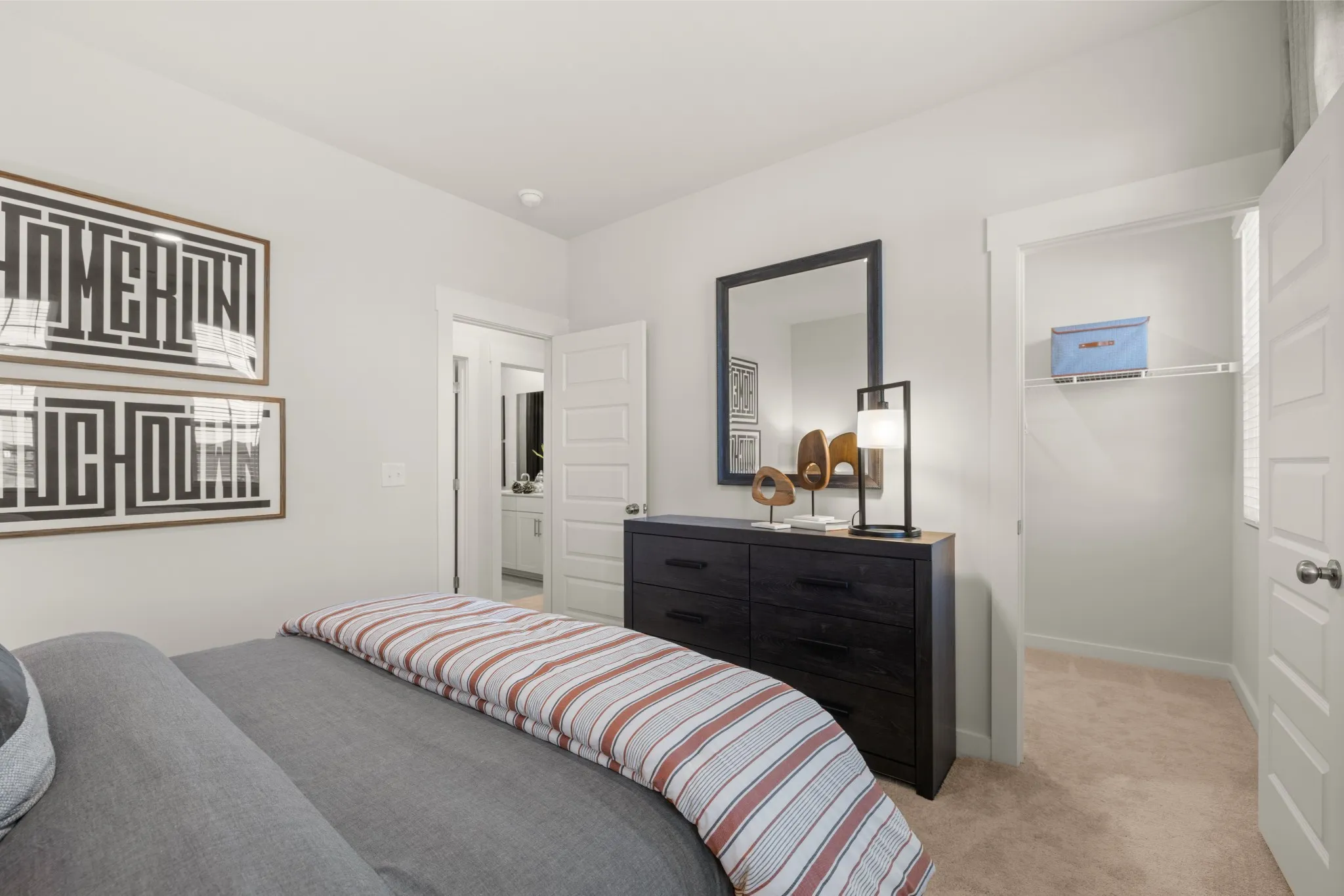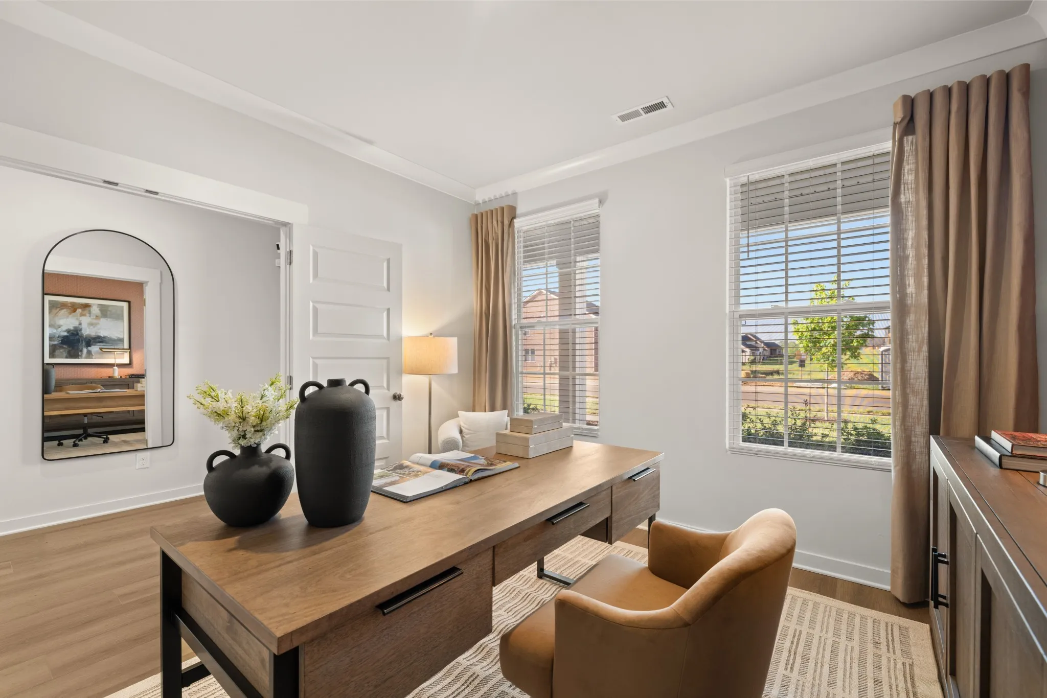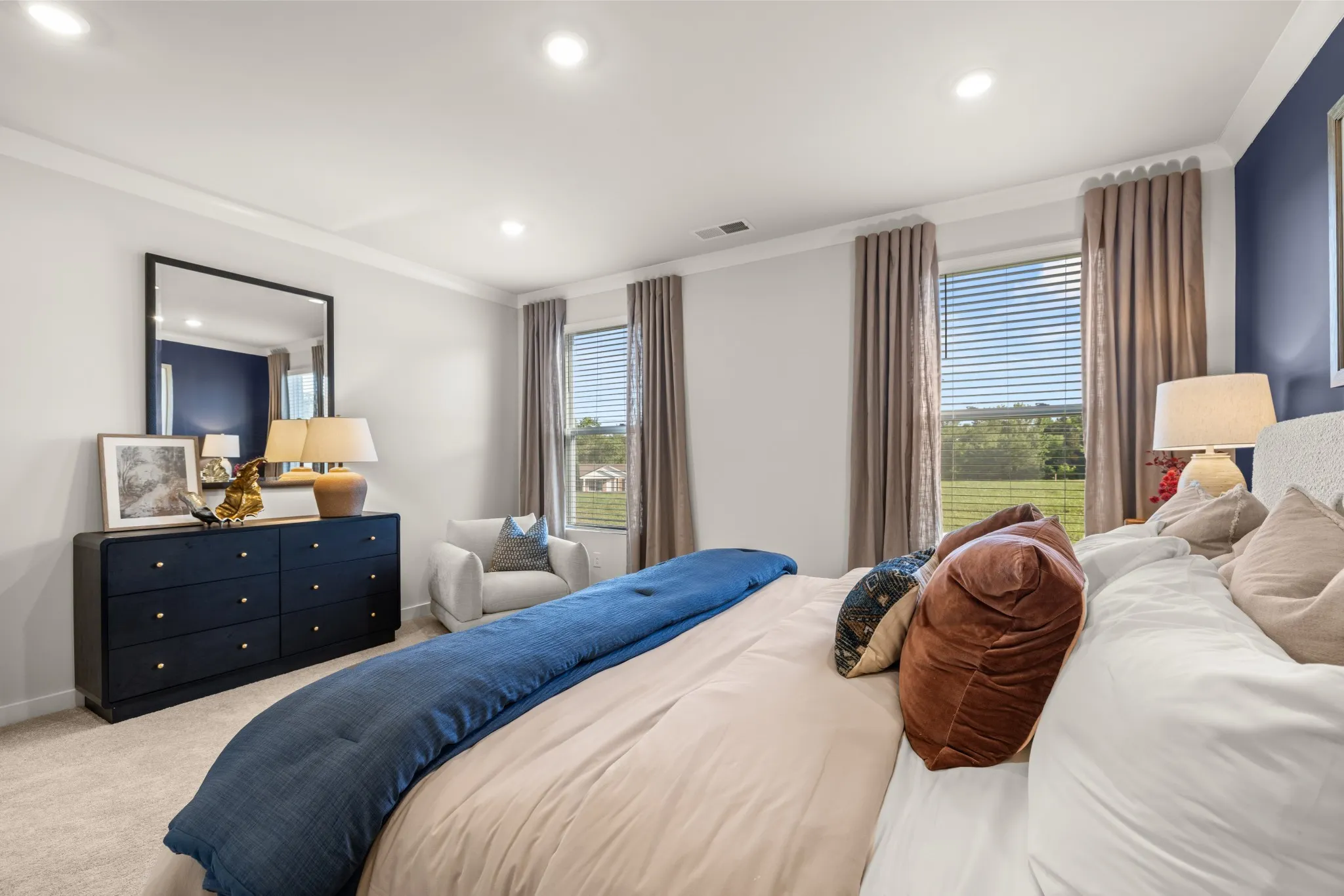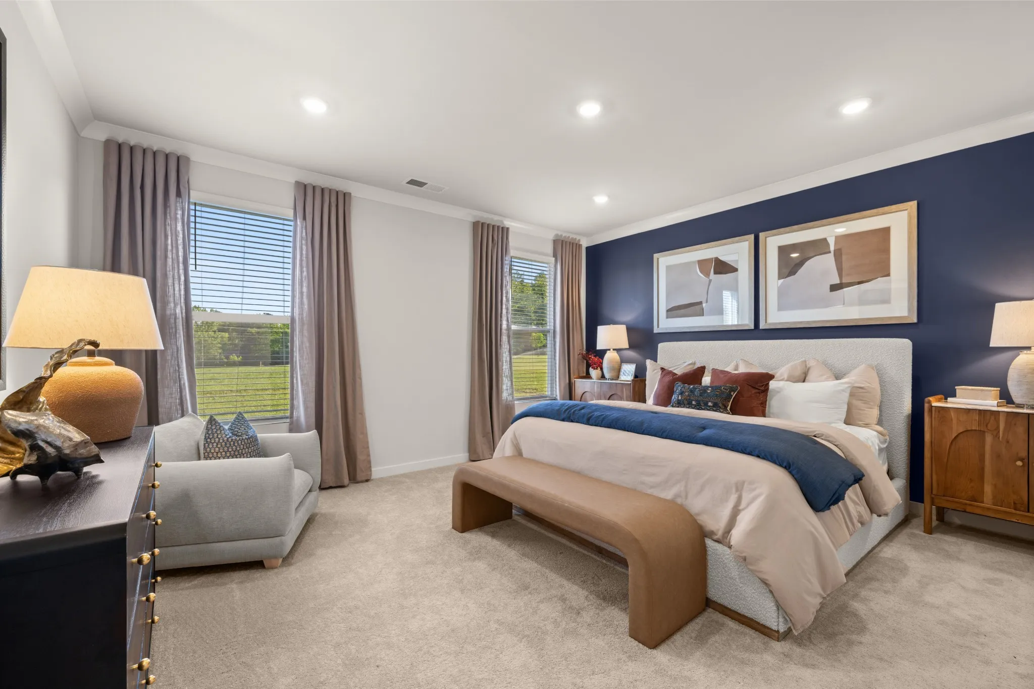 The first floor of this two-story home shares an open layout between the kitchen, nook and family room for easy entertaining and access to the patio for outdoor lounging. A more formal dining room is at the front of the home for dinner parties and a study to work from home. Two bedrooms are on the first floor, including a luxe owner’s suite and a secondary bedroom, ideal for overnight guests. Upstairs are three secondary bedrooms, a versatile game room and a media room for added living space. *Images from a furnished model of this home. Actual configuration and features may vary.