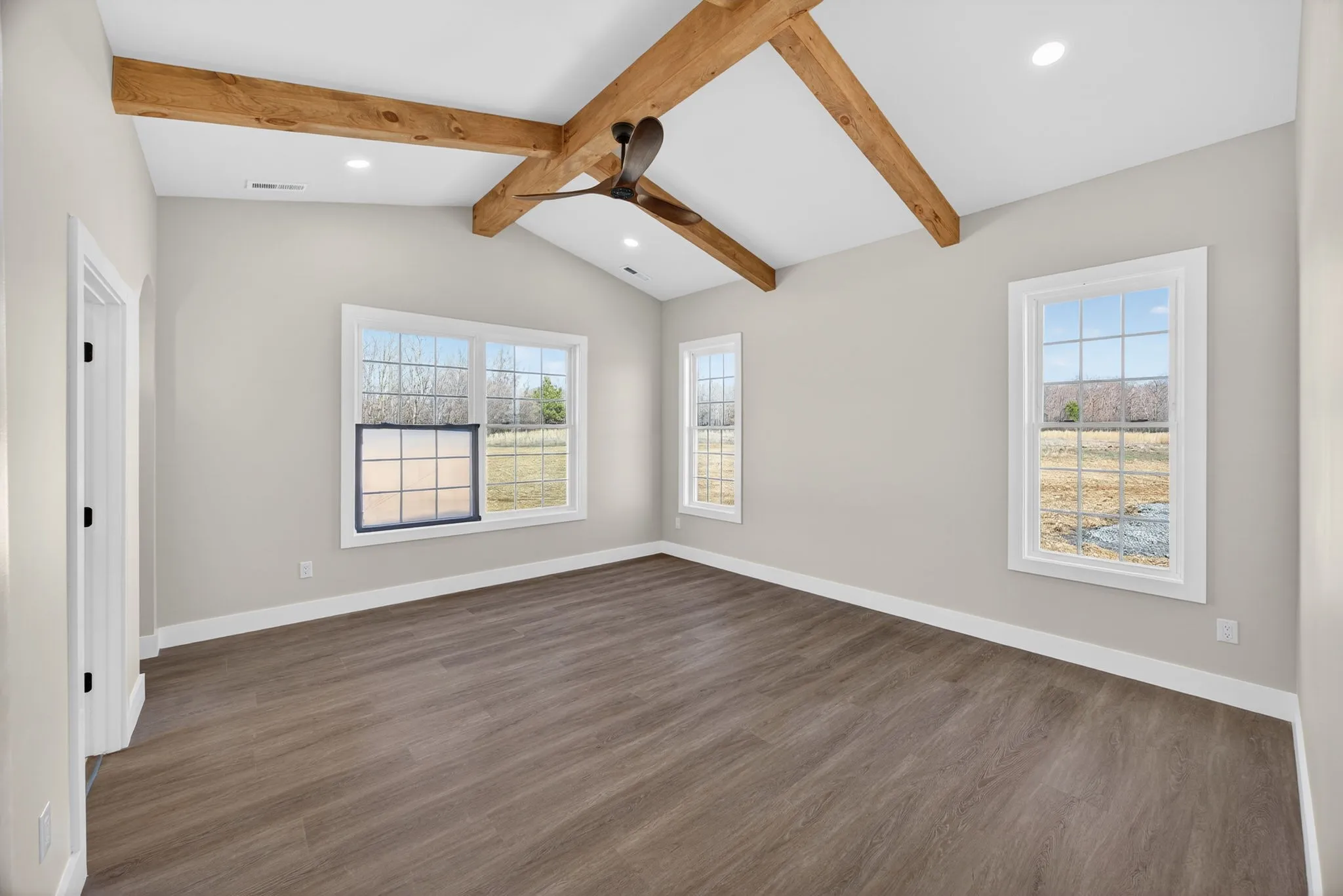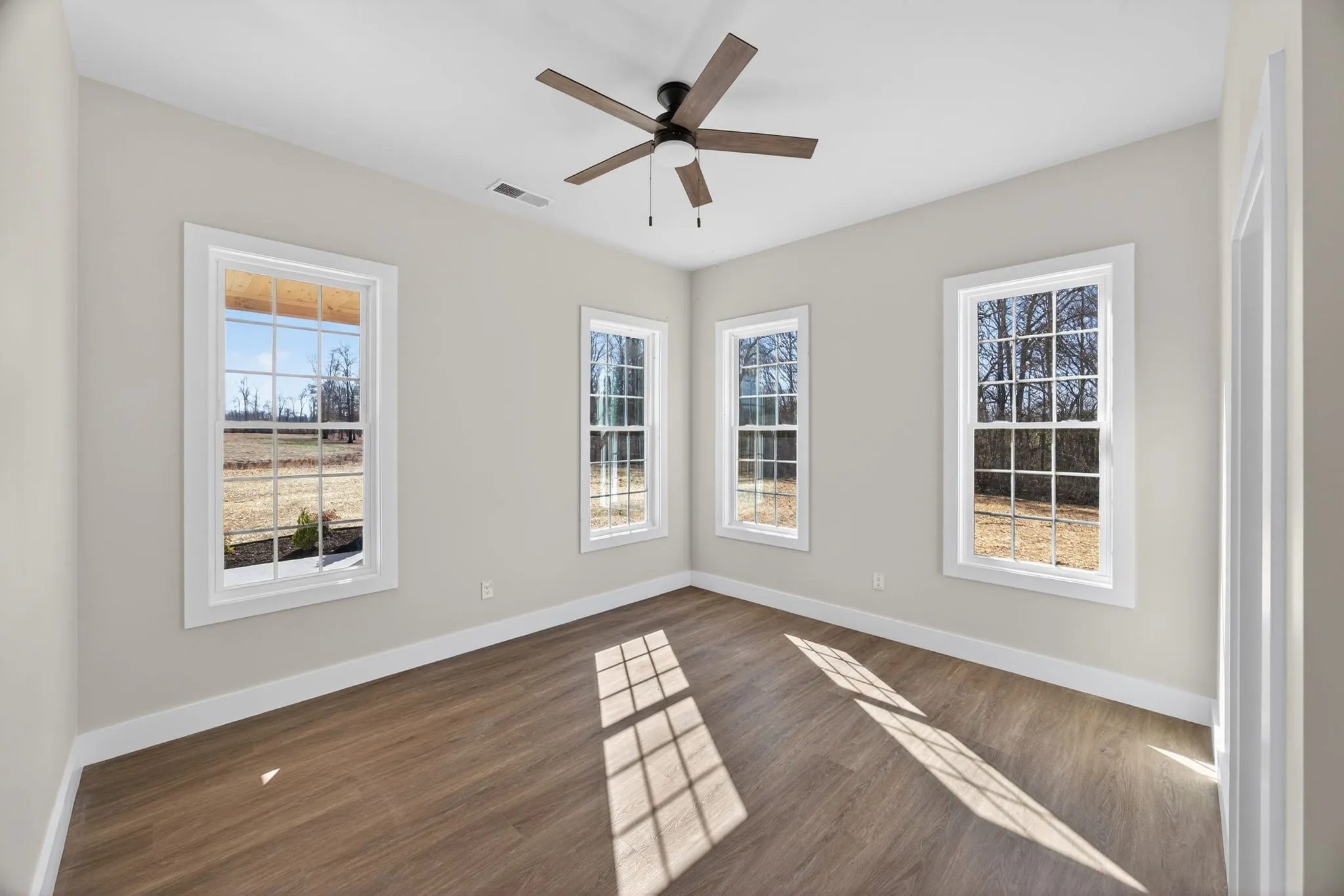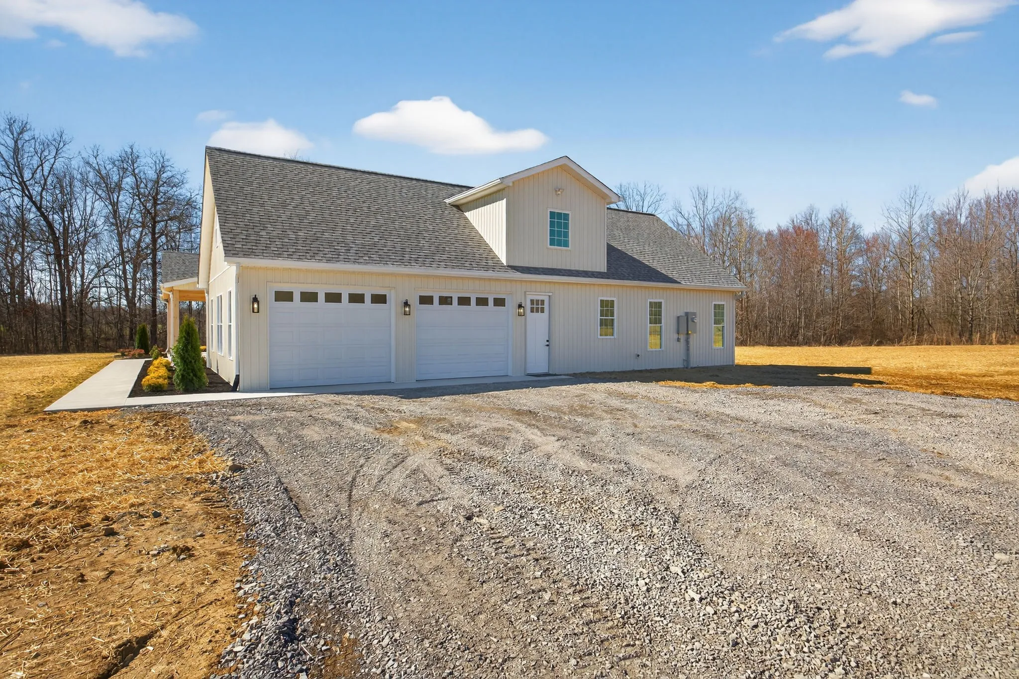 Nestled on 5 serene acres, this newly built home encourages a slower, more intentional lifestyle. The exterior showcases a fresh yet timeless white modern farmhouse design, complemented by warm wood accents that welcome you inside. Sunlight dances across the wide-plank floors, illuminating an open living area anchored by a cozy fireplace.