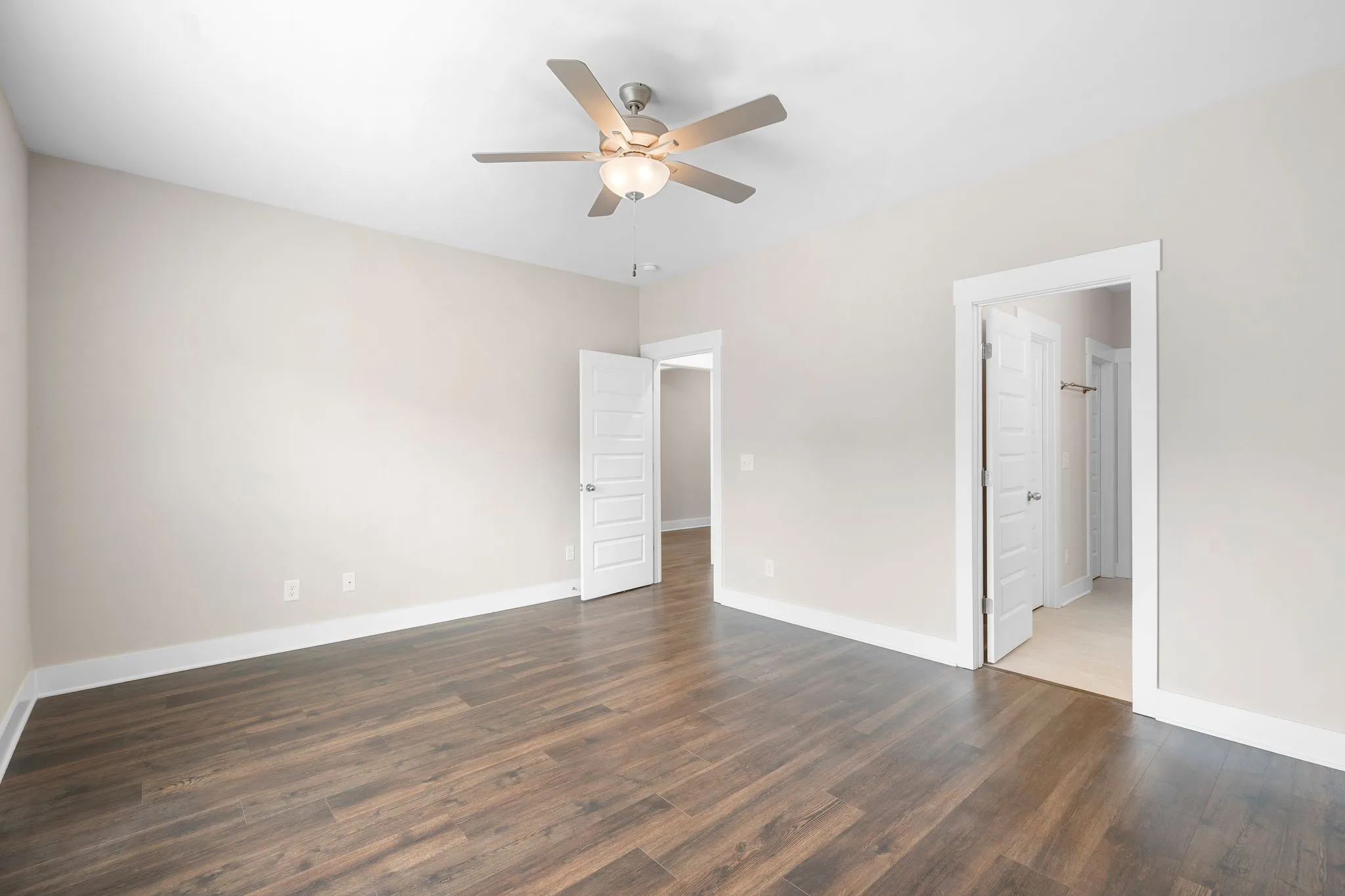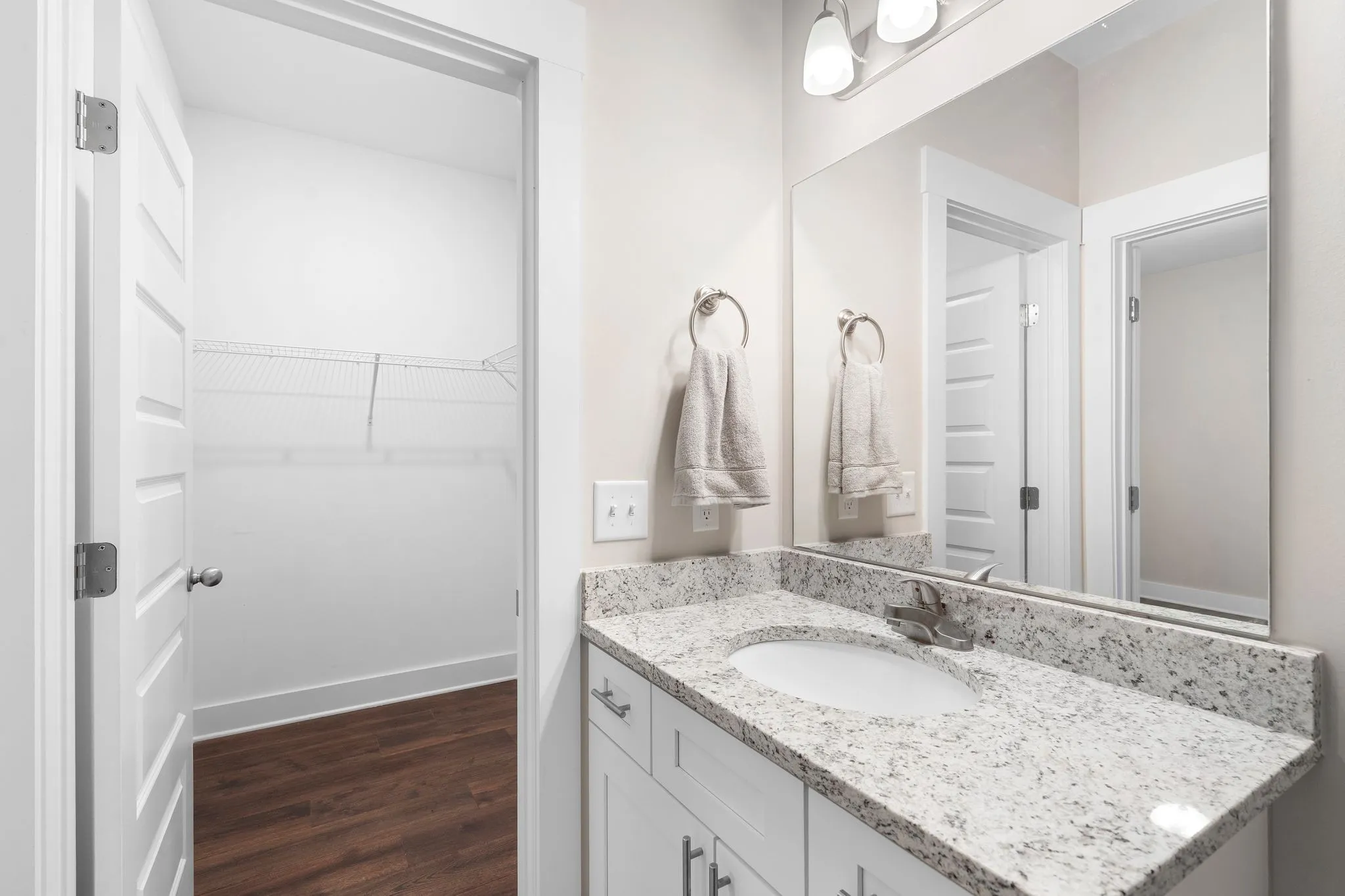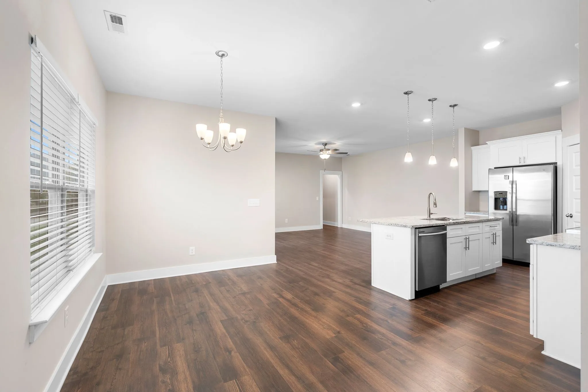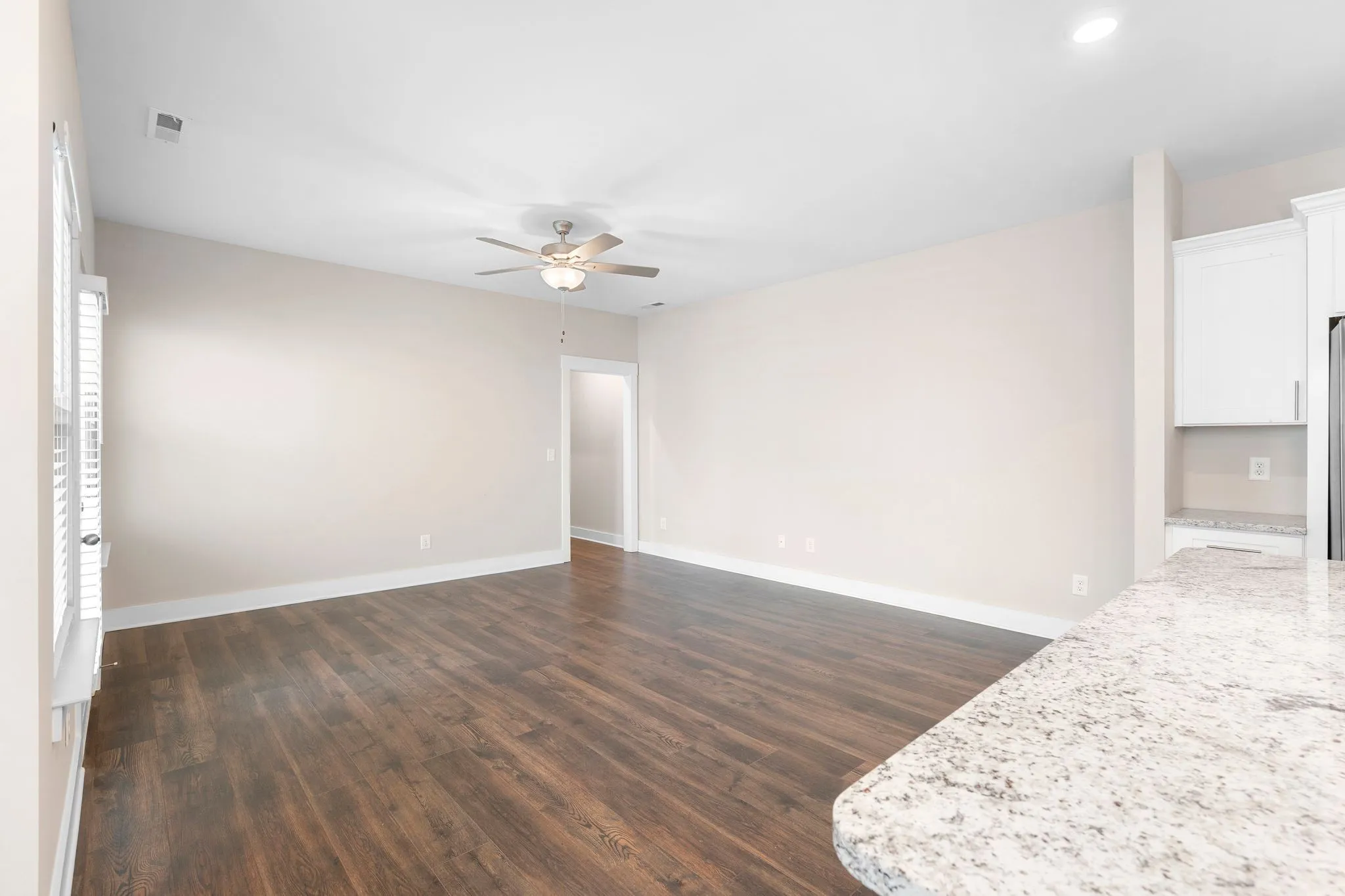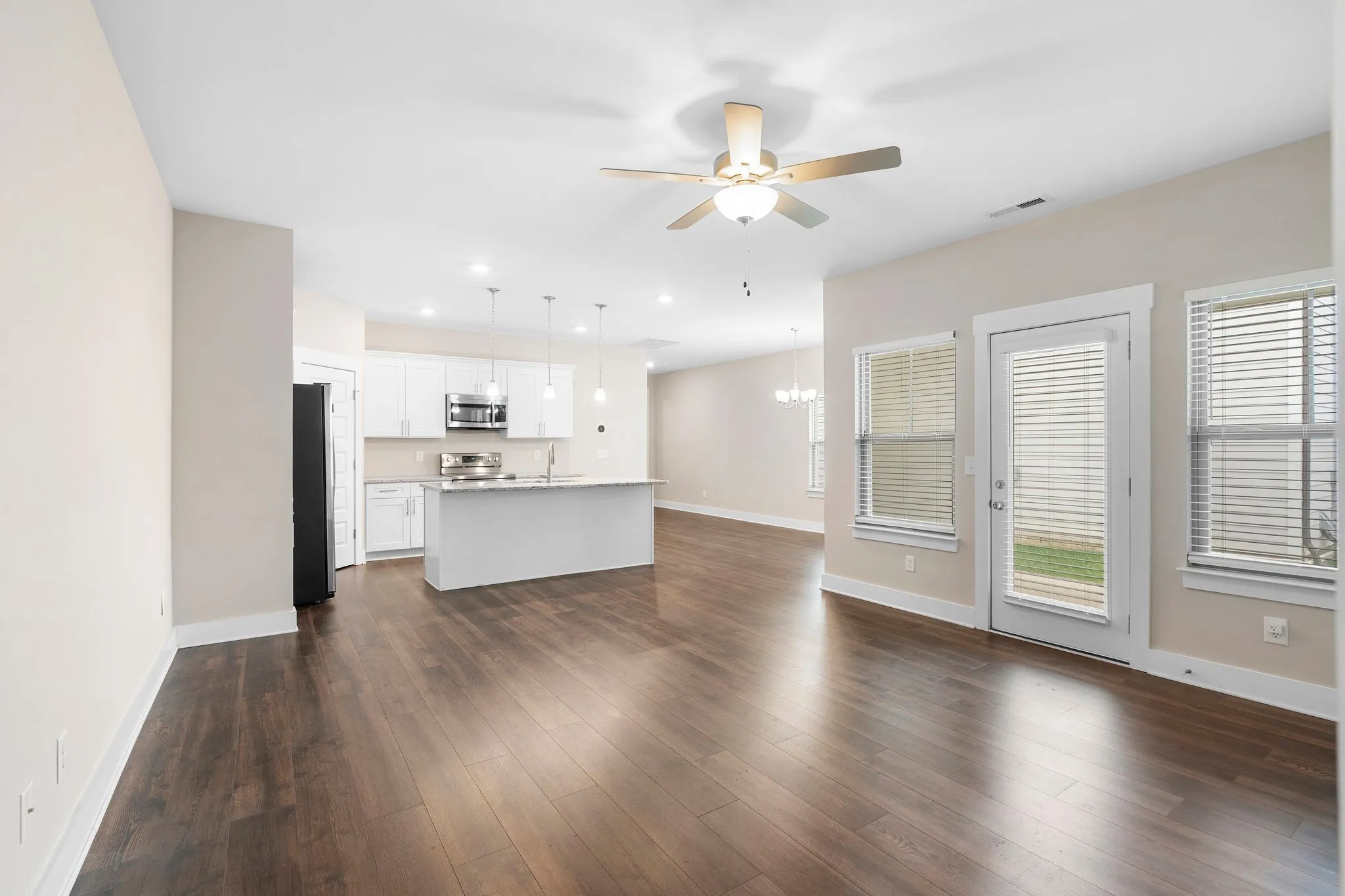 Beautiful newer construction end-unit duplex located on a quiet street in a prime Murfreesboro location. This home offers an open-concept layout with durable laminate flooring throughout and stunning white cabinetry that brightens the entire space. The kitchen features granite countertops, a spacious pantry, and includes the refrigerator. It flows seamlessly into the main living area, creating an ideal space for entertaining or everyday living.