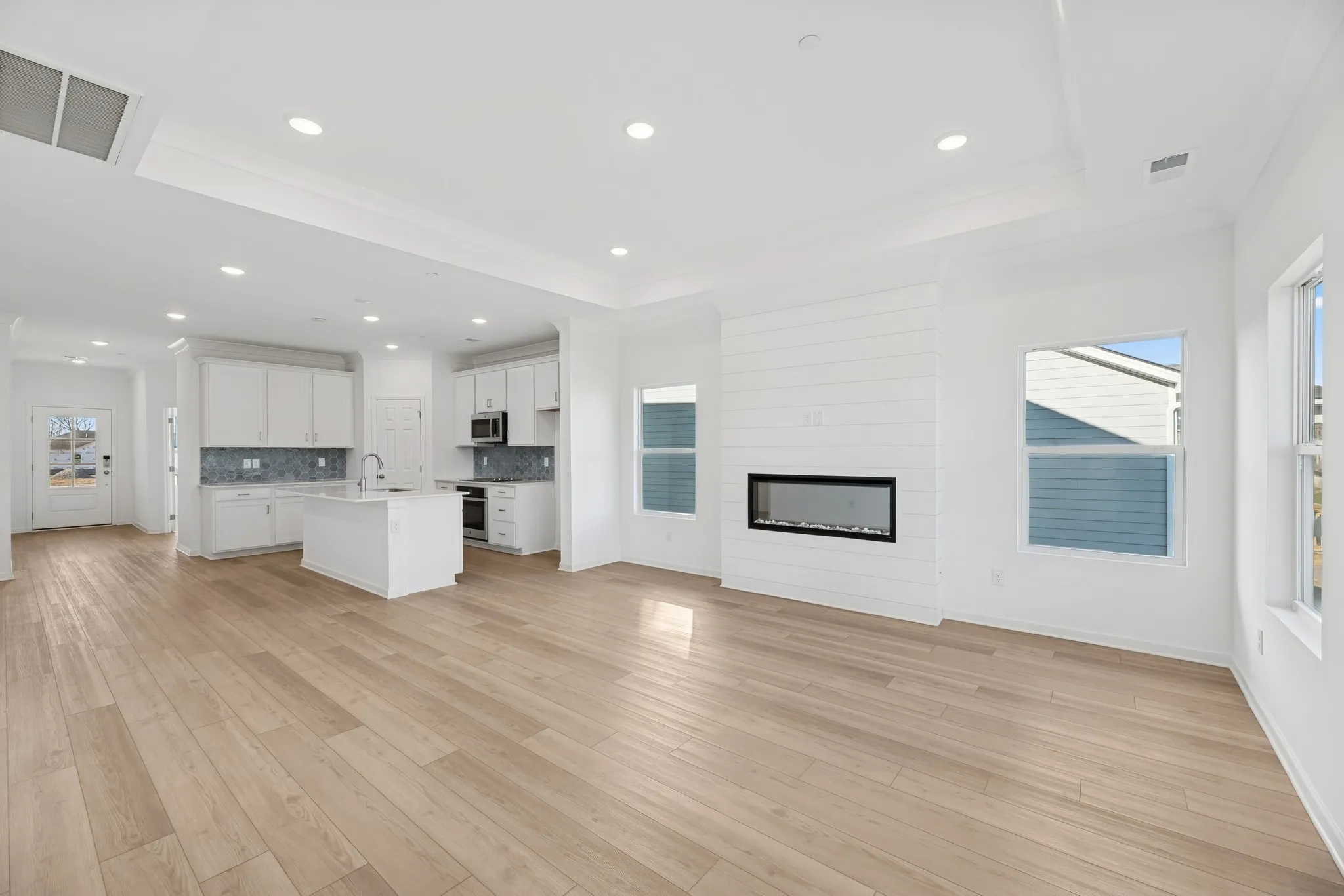 • Cozy fireplace with shiplap surround