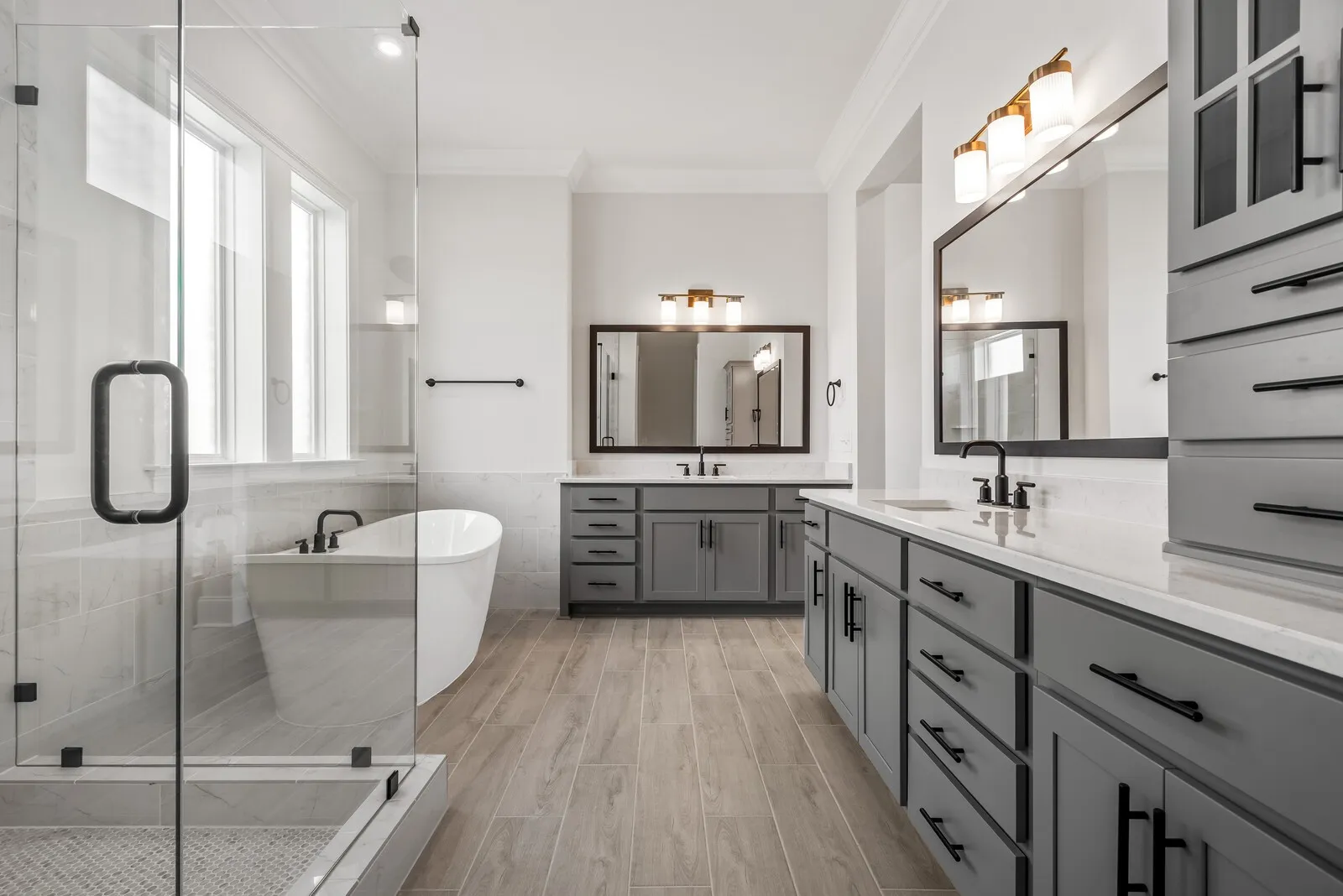 The primary suite is located on the main level and is complemented by soaring ceilings, creating a spacious and luxurious private retreat. A guest suite on the main level adds flexibility for visitors or multigenerational living, while a dedicated home office provides an ideal work‑from‑home environment.