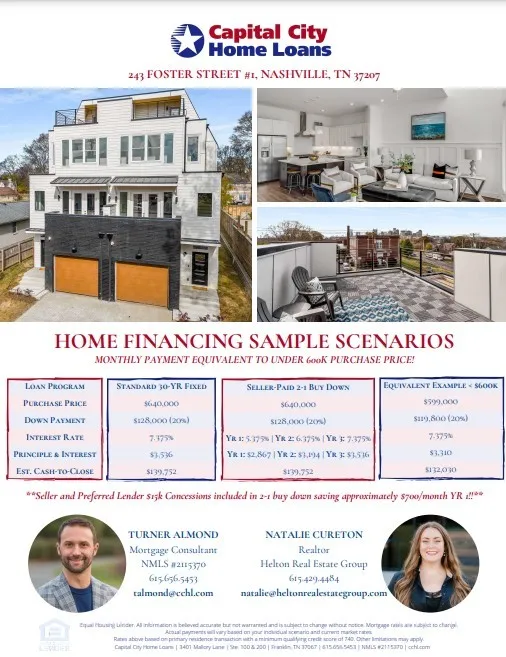 Monthly payment equivalent to UNDER 600k Price! Seller/preferred lender to buy down rate projected to SAVE YOU $700/MONTH! New completion 5min to downtown, 5Points, Nissan Stadium, Germantown, TopGolf & the Greenway! UNBEATABLE convenience! Entertain w/style in this 4 bed home w/dynamic rooftop & easy rides to all Nashville has to offer. Whether you’re looking to enjoy sports, music, bars & restaurants or prefer parks, the river & museums, this life is for you. Boasting of views for miles, designer finishes, floor to ceiling windows & bright layout w/sleek & stylish kitchen, you won’t need to venture far. After a fun-filled weekend, relax in the primary w/attached spa-like bathroom w/huge walk-in shower, then head to the cozy living room for much deserved lounging. Step into the future ahead of the game w/upcoming retail across the street, Oracle & the new stadium coming soon. Each unit has a 2-car tandem garage, perfect for storing your car, bike & kayak. Begin this lifestyle today!
