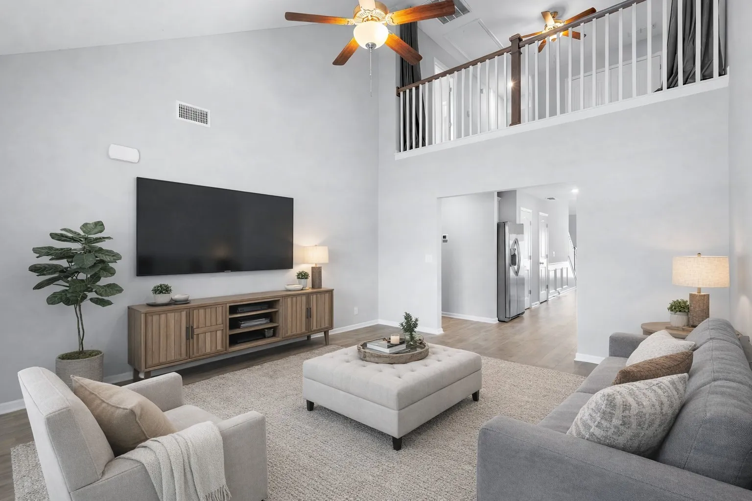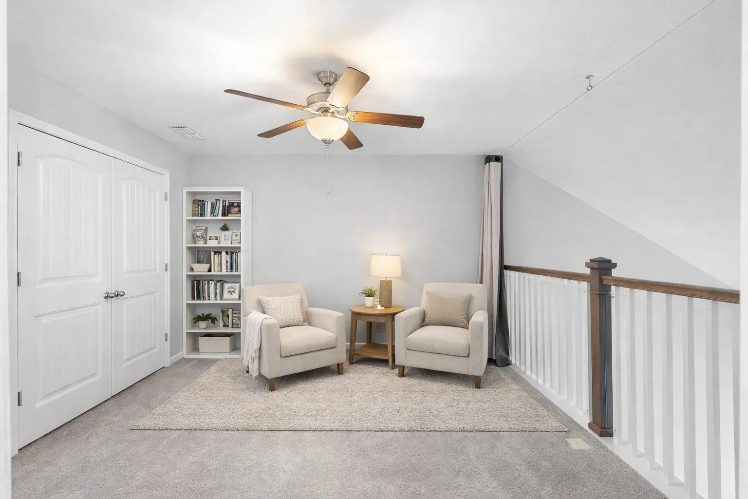 Upstairs, the home offers an additional bedroom, a full bathroom, and a loft area that can be used for a home office, secondary living space, or flexible storage. The separation of living spaces between levels allows for multiple living arrangements.
