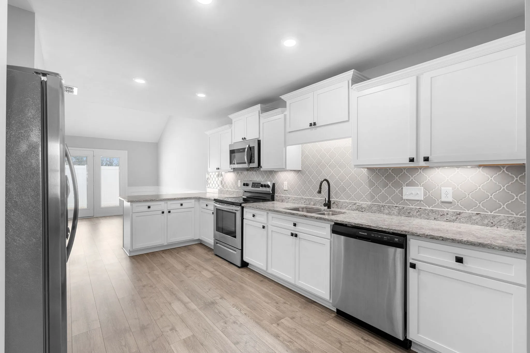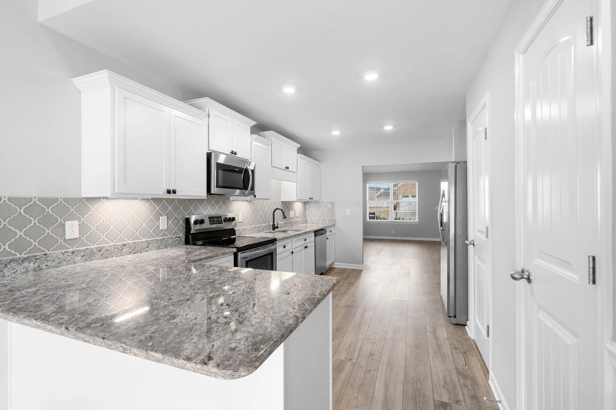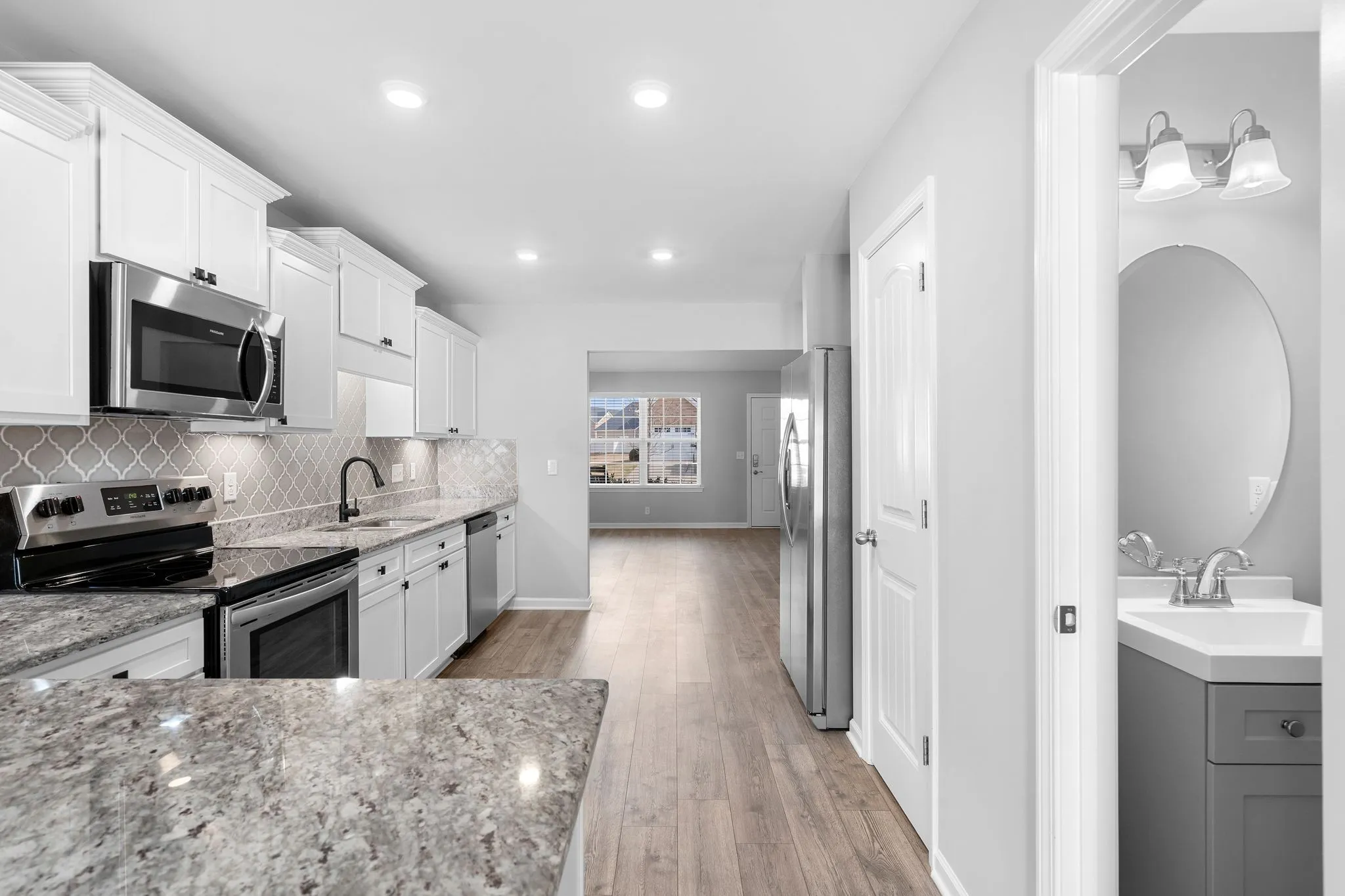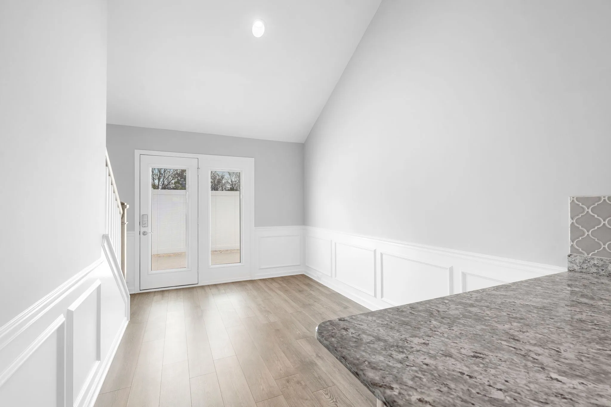 The main level features one bedroom and one full bathroom, along with a half bath for guests. Fresh paint throughout gives the interior a clean, updated feel. The kitchen includes white cabinetry, stone countertops, an upgraded tile backsplash, and the refrigerator remains with the home. The layout is practical, open, and well-suited for everyday living.