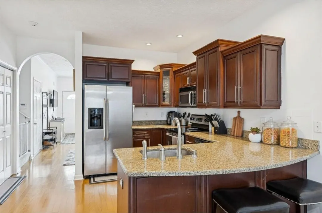 This adorable all-brick end-unit townhome is full of character and ready for your personal touch. Inside, you’ll find real hardwood floors, spacious bedrooms, and two full baths. The primary bedroom is conveniently located on the main floor. An inviting arched doorway leads into the charming eat-in kitchen featuring granite countertops and stainless steel appliances, opening to the dining area and backyard deck, perfect for entertaining friends and family.