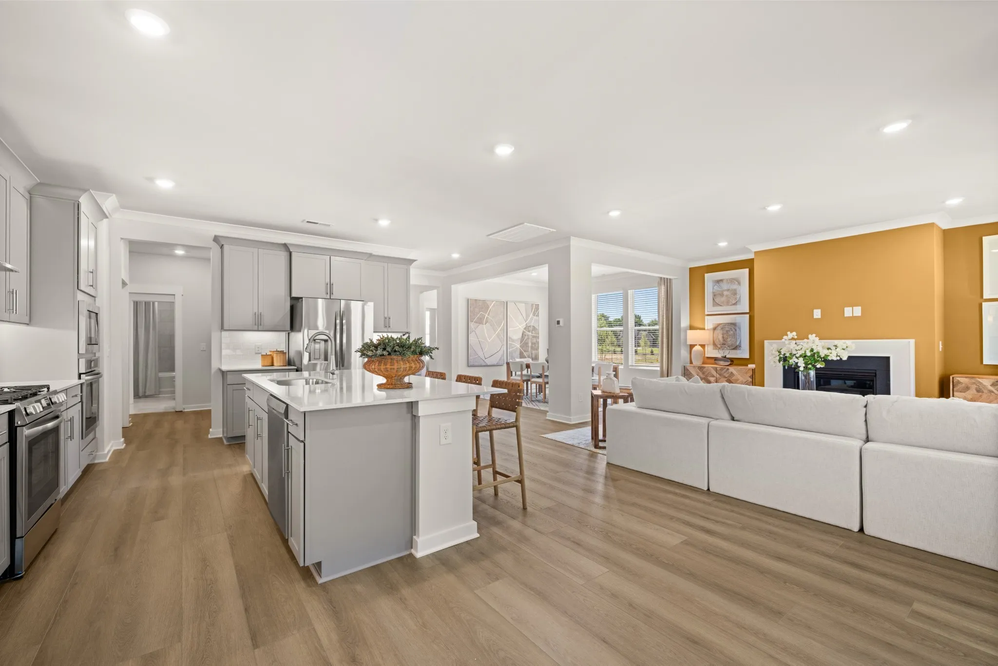 This single-story home shares an open layout between the kitchen, nook and family room for easy entertaining and access to the covered patio for outdoor relaxation. A separate formal dining room is perfect for hosting dinner parties with loved ones. A luxe owner’s suite is in a rear corner of the home with an en-suite bathroom and walk-in closet, while three secondary bedrooms are at the front of the home, one with an en-suite bathroom, ideal for overnight guests. *Images from a furnished model of this home. Actual configuration and features may vary.