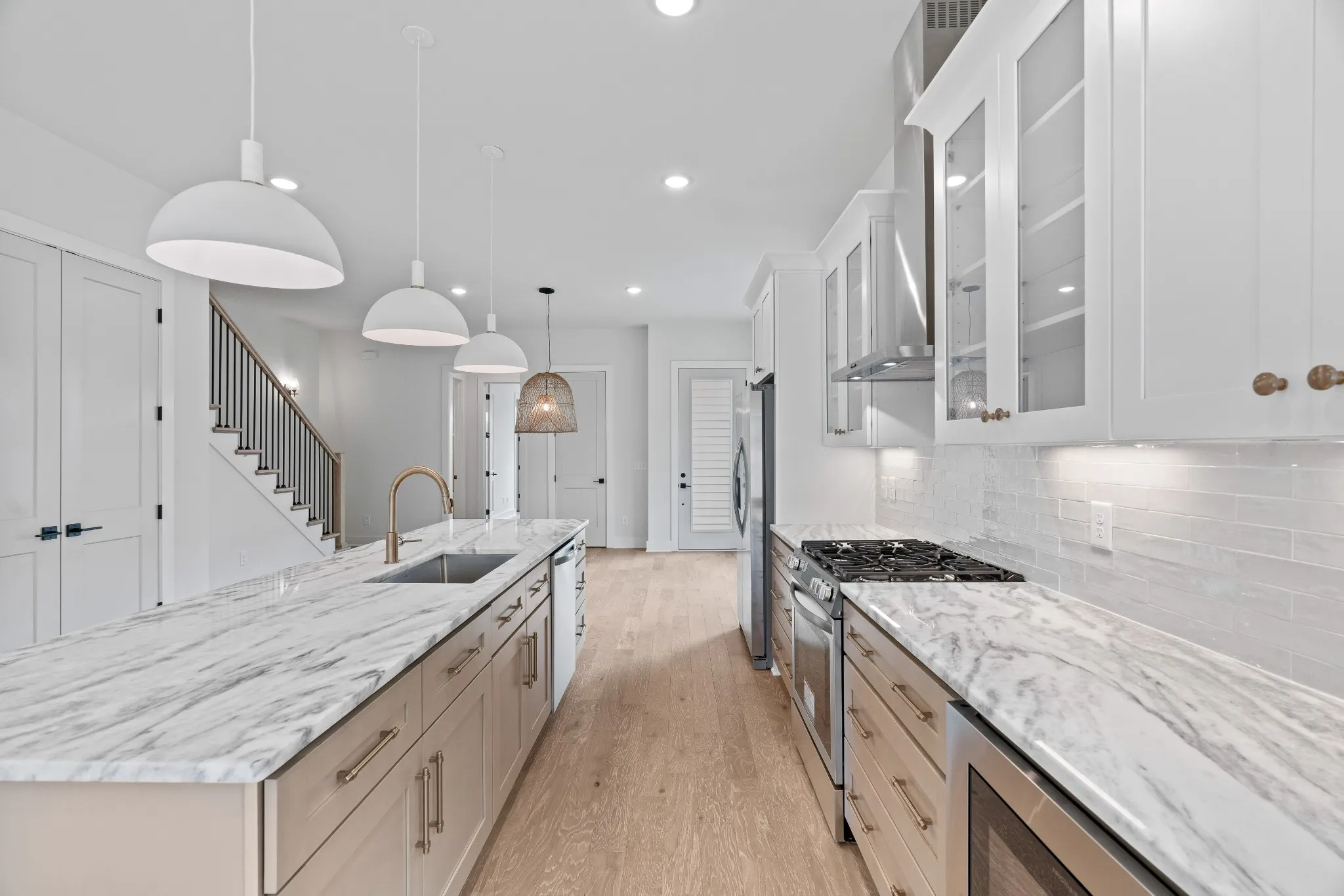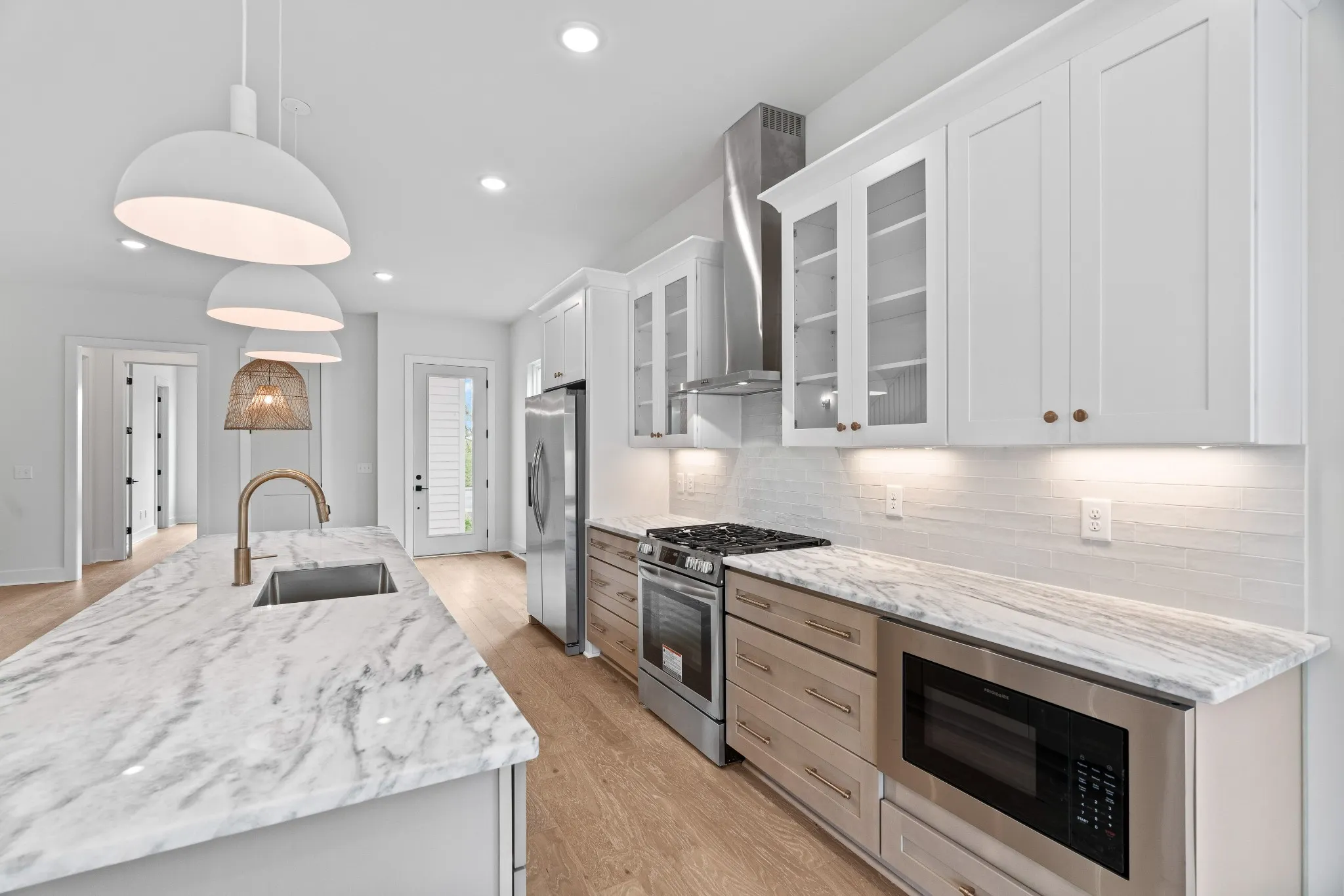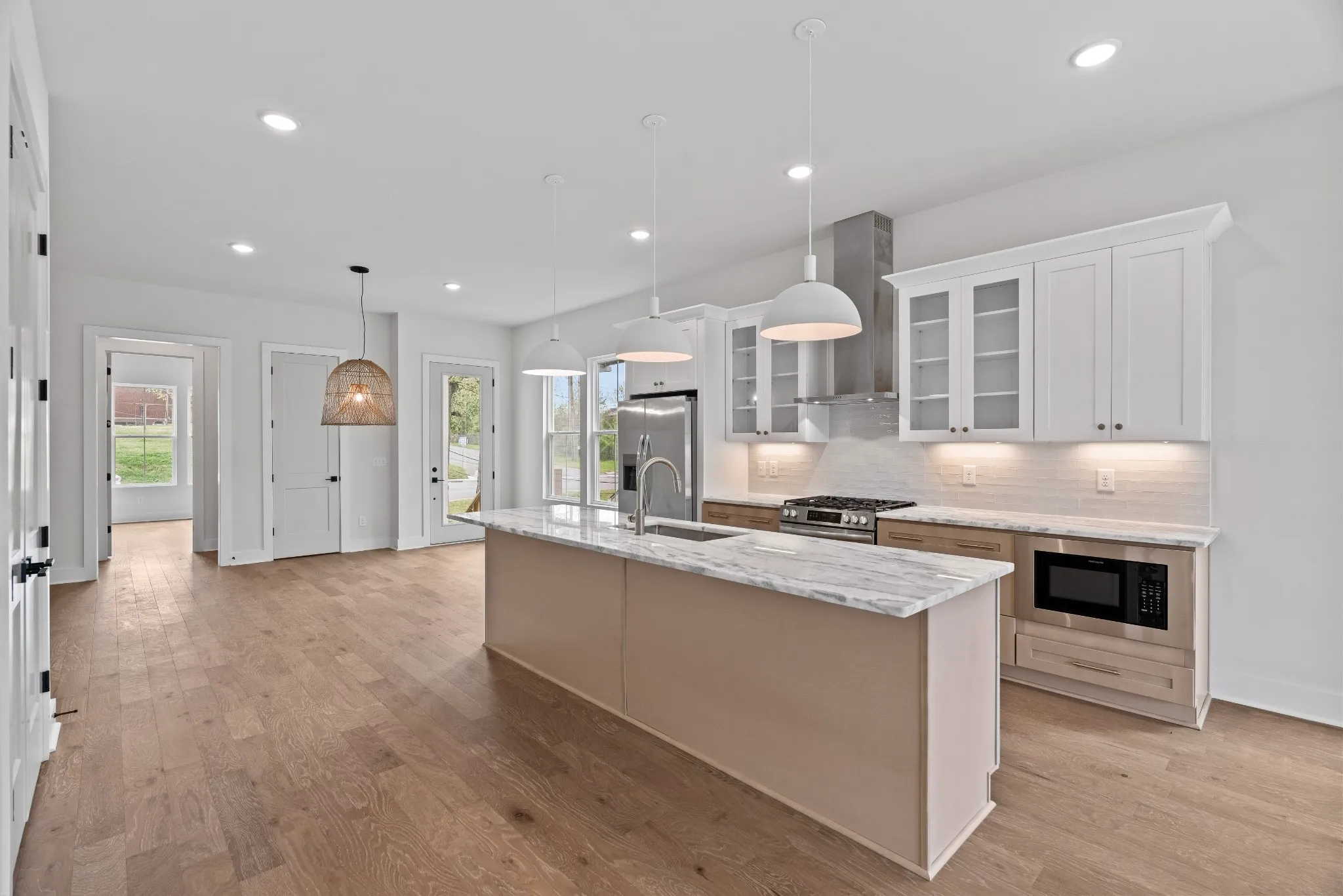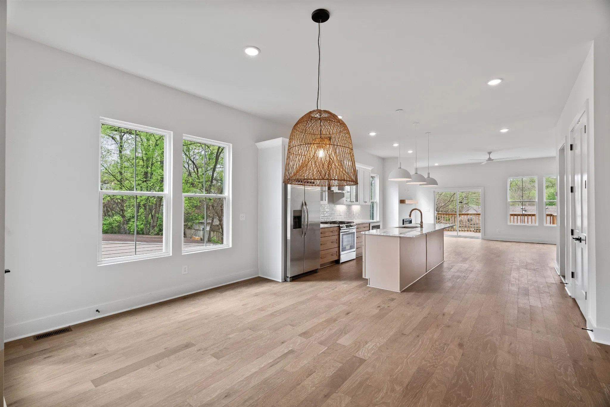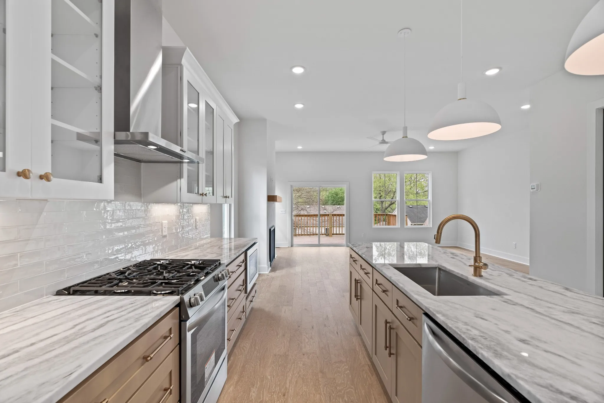 Extreme Value for the Price. Contemporary new build in highly desirable & walkable The Nations. 2-car attached garage, 2+parking pad & abundant storage. Move-in ready. Well-crafted & designed by Jackson Builders for today’s lifestyles. Efficiently utilized & well-thought out, usable spaced house w/ 4 oversized BRs/ 3 BAs. Boasts over 2,600 sf w/engineered hardwood flooring throughout, exceptional interior design choices & accents. Quartzite countertops, tiled back splashes & bath walls; gas range w/four burners, vent-a-hood vented to outside. Custom-crafted walk-in closets, moldings, steps w/wrought iron spindles, 2 walk-in pantries, gourmet island. Living room w/gas fireplace walks out to newly stained deck. Fenced backyard. Flexible 1st floor BR ensuite as office, den, playroom. Energy efficient tankless water heater, double paned windows, ceiling fans. Walk to W. Nash shops/dining, Charlotte Ave, 11-acre England Park. Convenient to I-40, downtown, hospitals, universities.