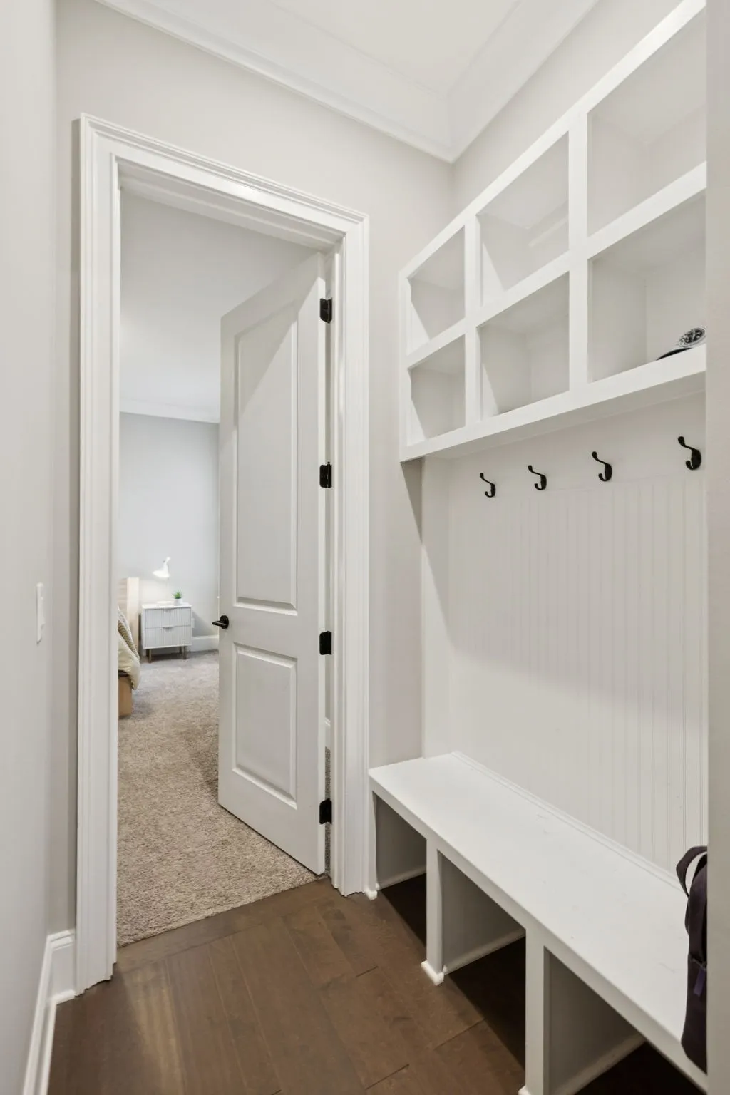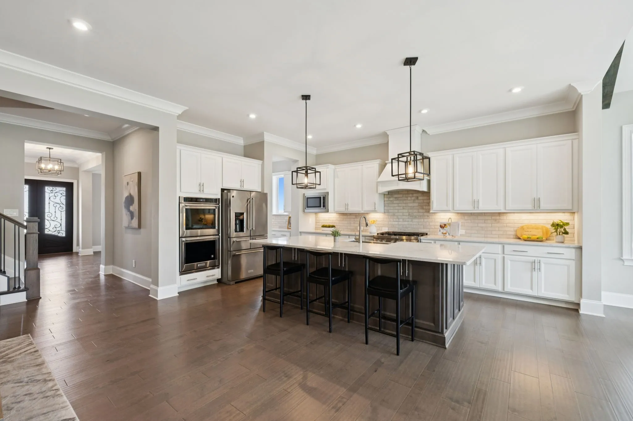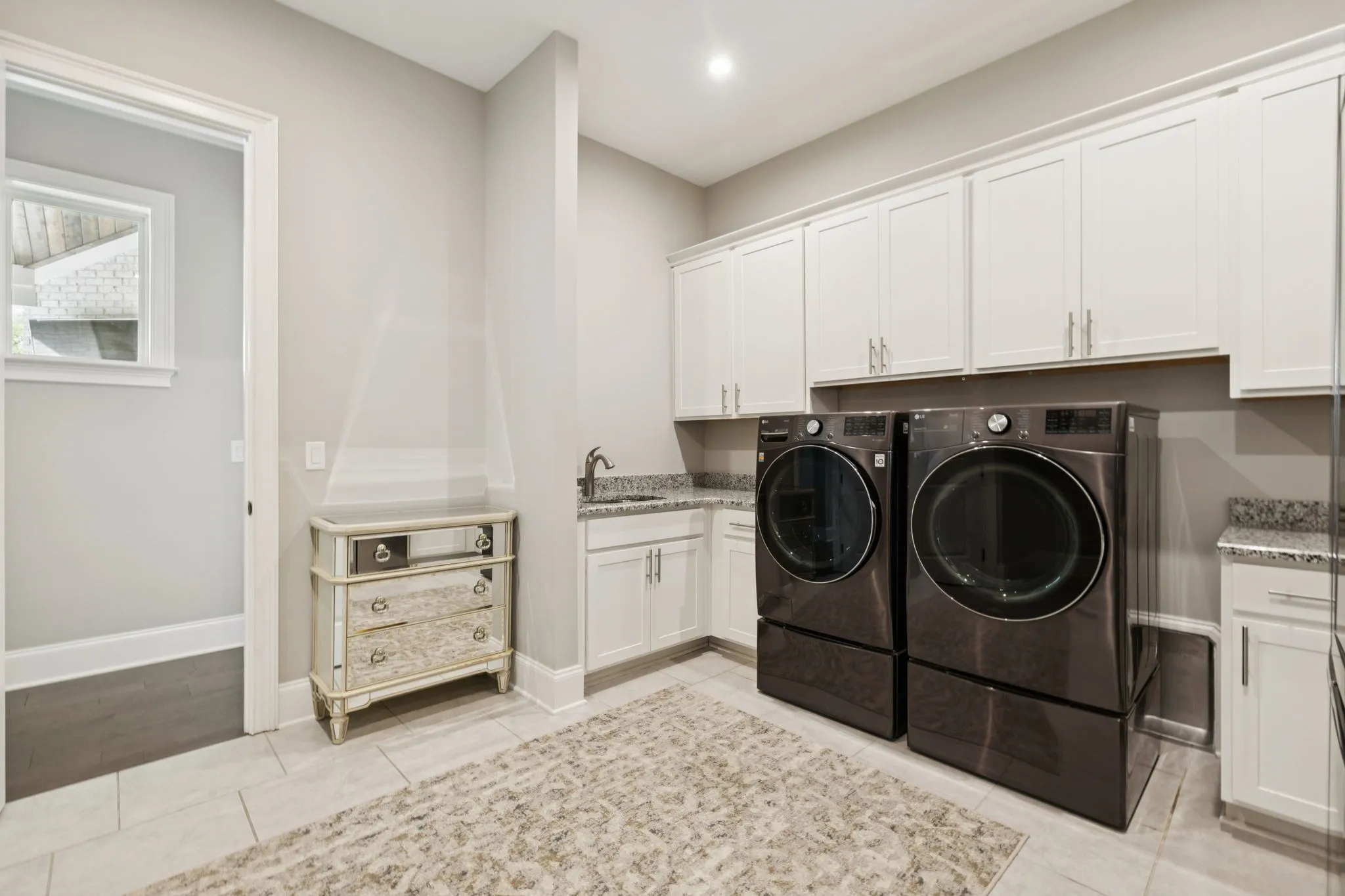 A private home office with double French doors provides the perfect workspace. The oversized laundry room offers plenty of storage and convenience.