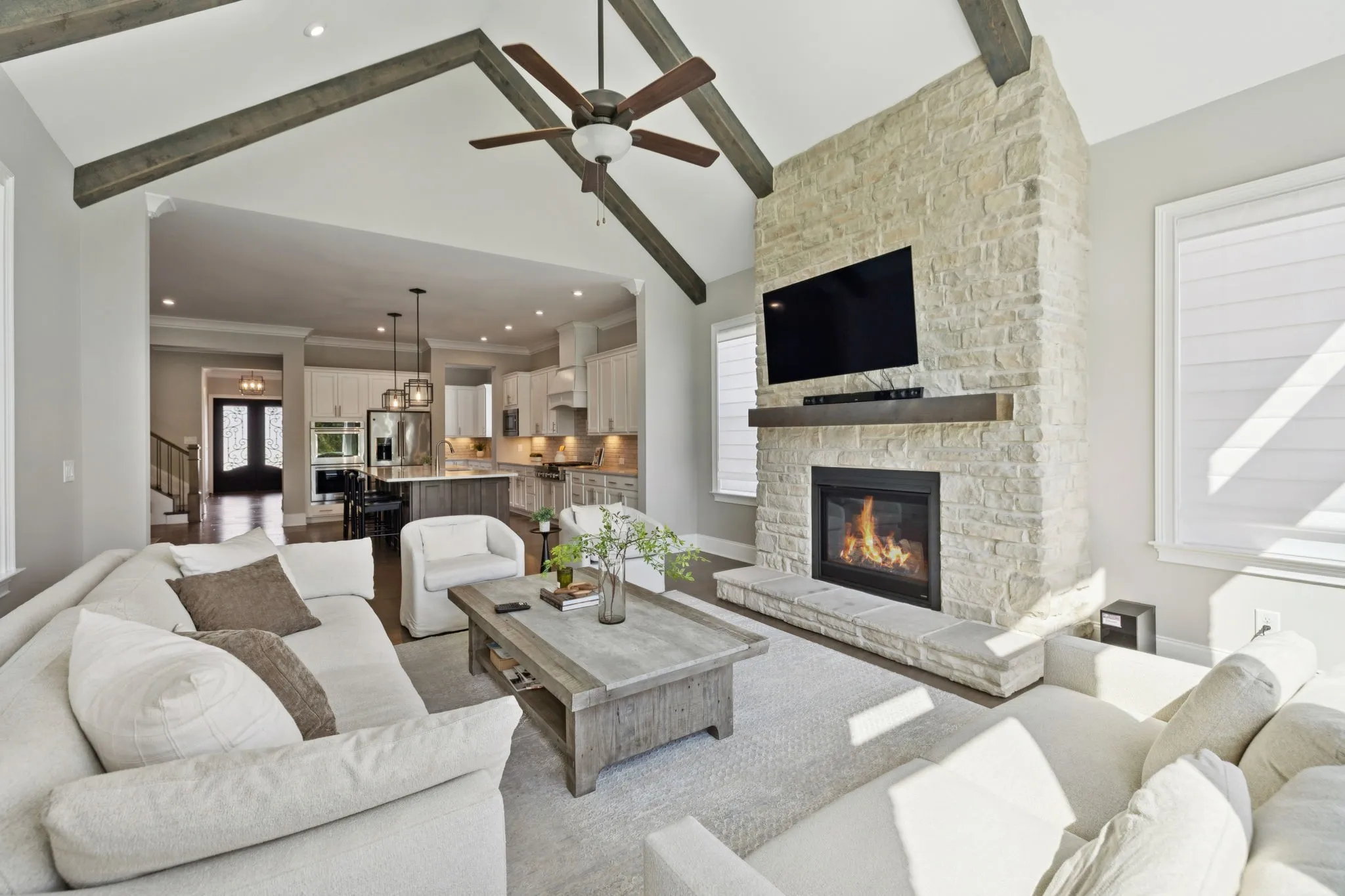 The heart of the home is the open-concept kitchen and living area, ideal for entertaining and everyday living. The kitchen flows seamlessly into the living room, highlighted by high ceilings, hardwood floors, and a cozy gas fireplace.