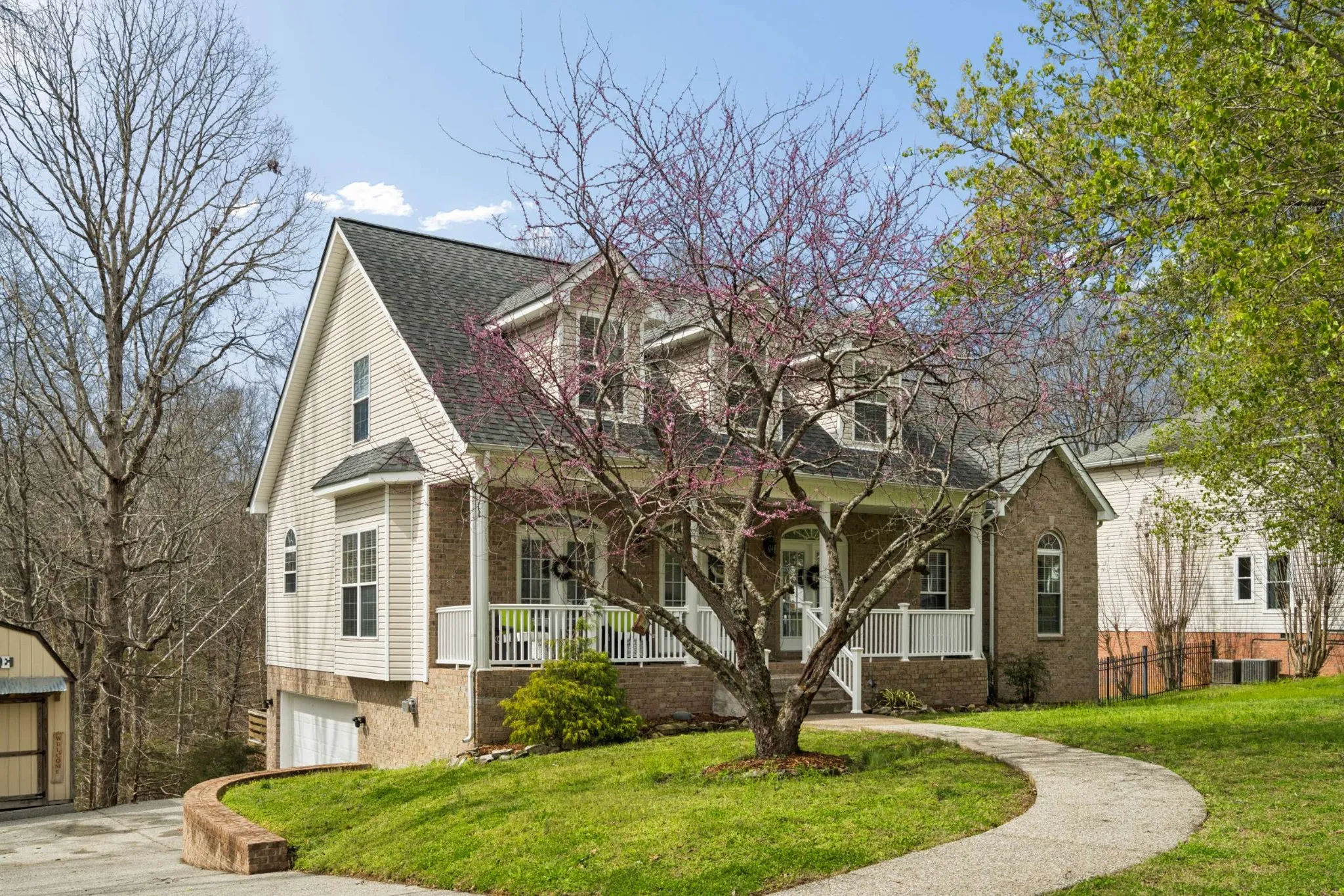 French doors stretch across the inviting front porch of this beautifully designed home, creating timeless curb appeal and an abundance of natural light. Nestled on a private, Gatlinburg-style wooded lot, this property offers the perfect blend of serenity and space.