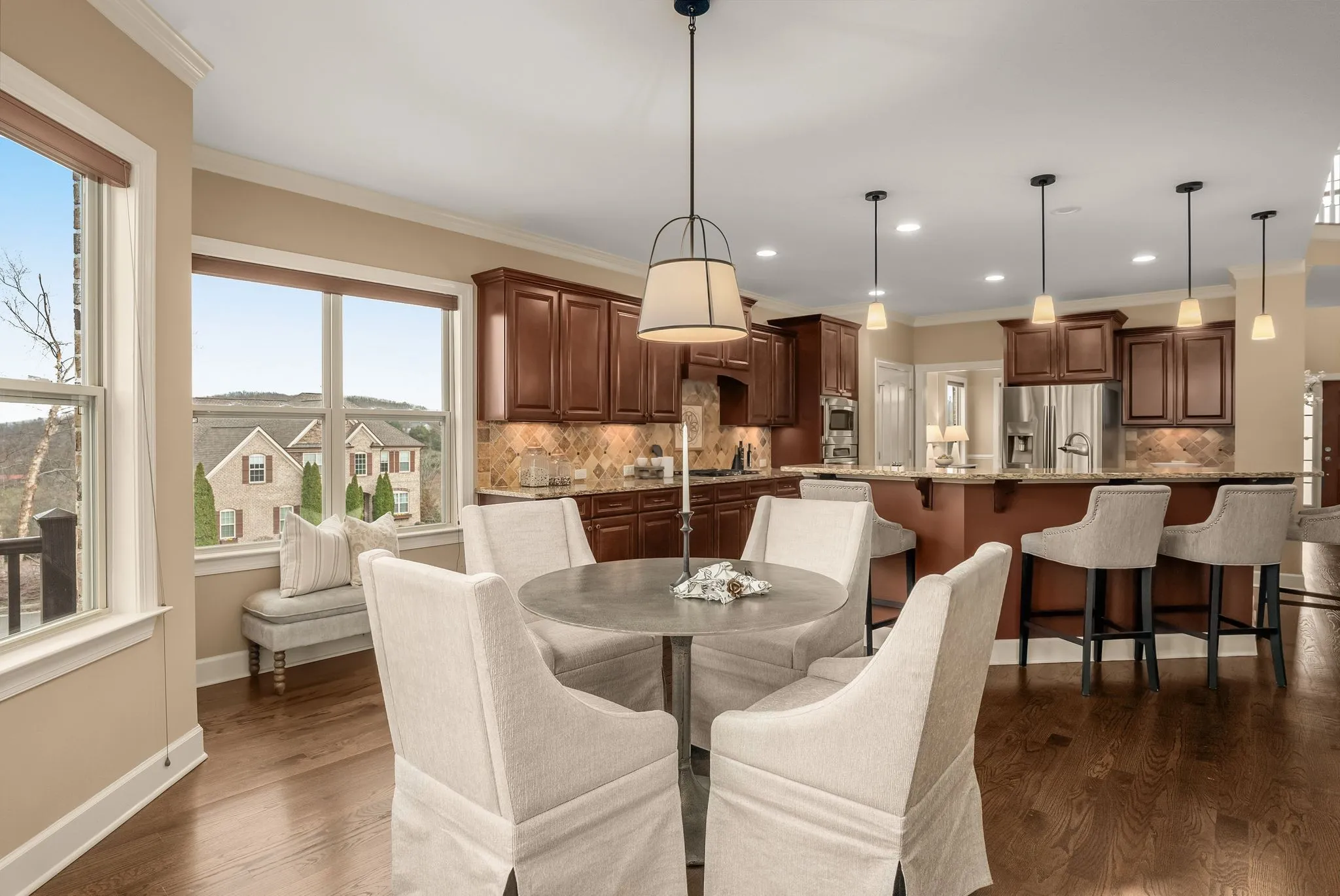 Perched at one of the highest elevations in the neighborhood with sweeping views and sunsets, this Brentwood residence stands apart for both its setting and exceptional care. From the stately brick façade to the welcoming front porch overlooking rolling landscape, the home offers a rare sense of elevation and privacy.