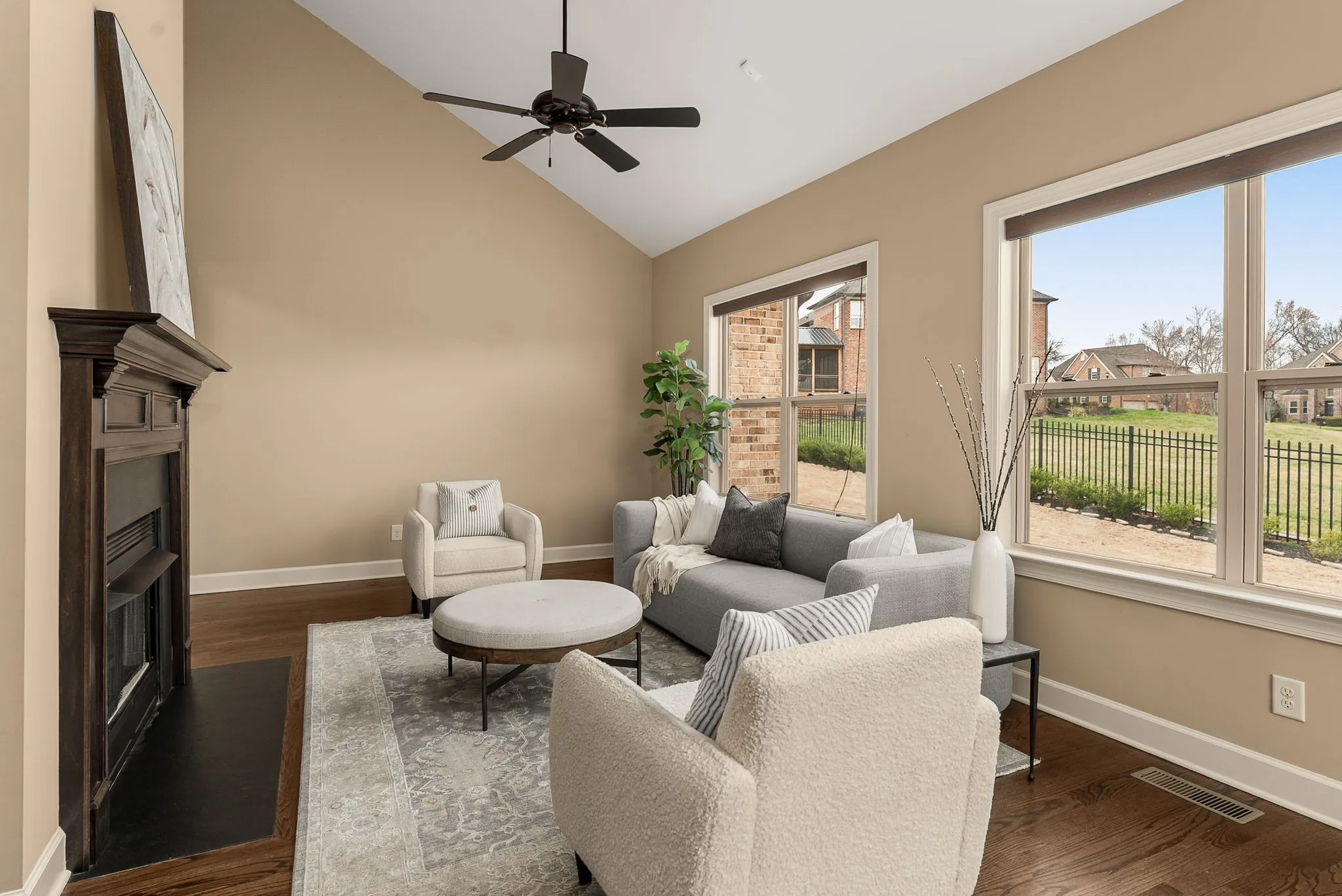 Inside, soaring ceilings, expansive windows added to the original floor plan, and an open layout fill the home with natural light and create an effortless sense of space. The two-story great room, anchored by a double-sided stacked stone fireplace, delivers architectural presence while remaining warm and inviting. Hardwood floors and refined finishes carry throughout the main level.
