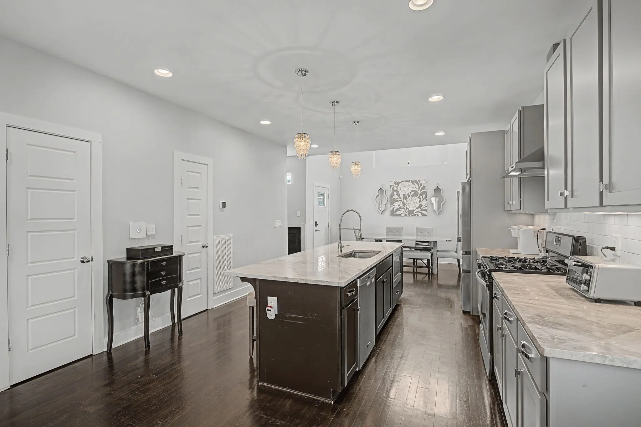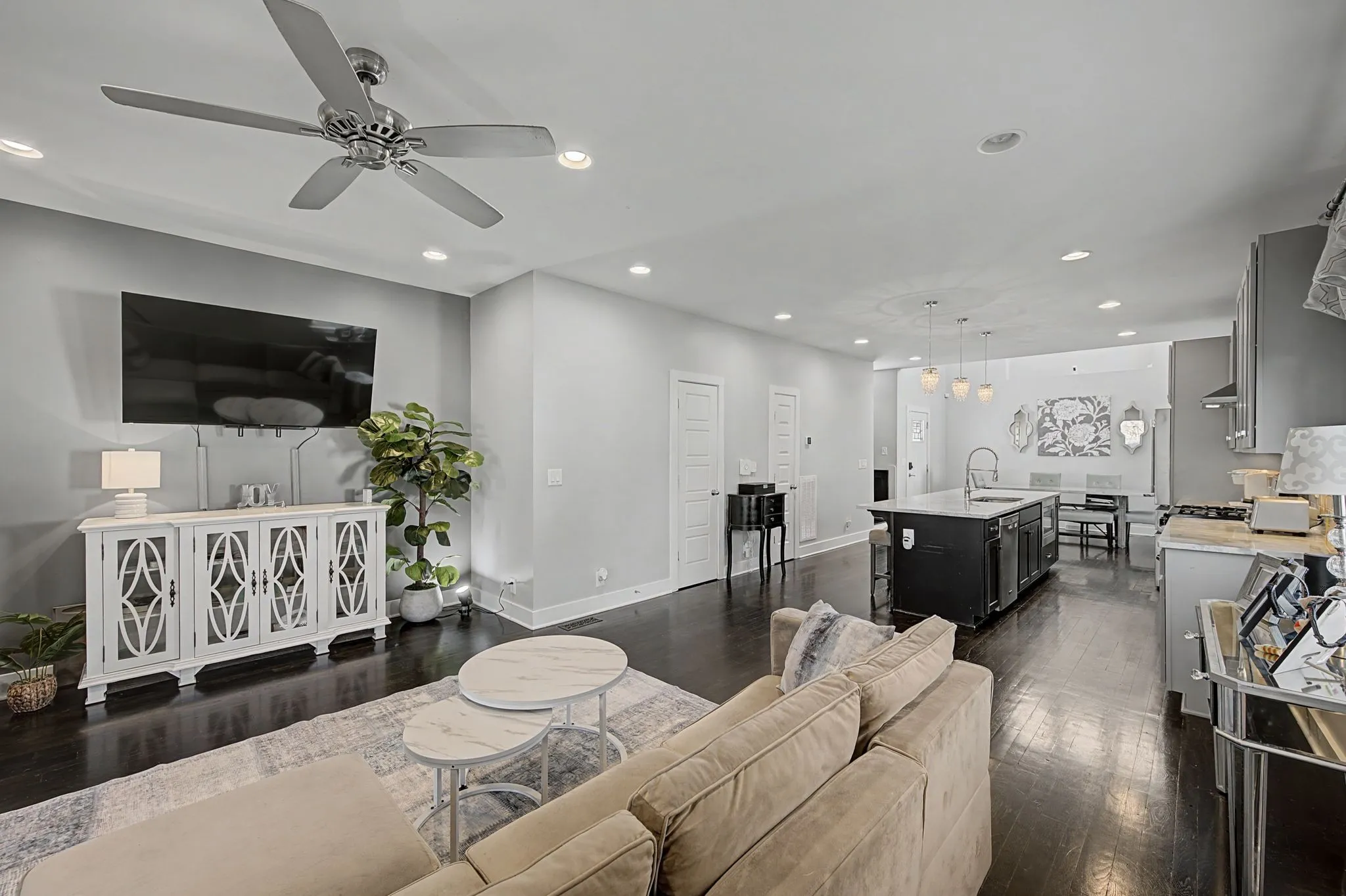 The main level is designed for natural flow. Living and dining areas connect seamlessly, with custom floor to ceiling window treatments softening the light and adding quiet polish. Just beyond, a screened in porch extends daily living outdoors, equally suited for morning coffee, casual dinners, or hosting friends. It overlooks a fenced backyard finished with turf, front and rear irrigation, and French drains designed to handle Tennessee rain showers with ease. The result is outdoor living that feels refined and low maintenance.