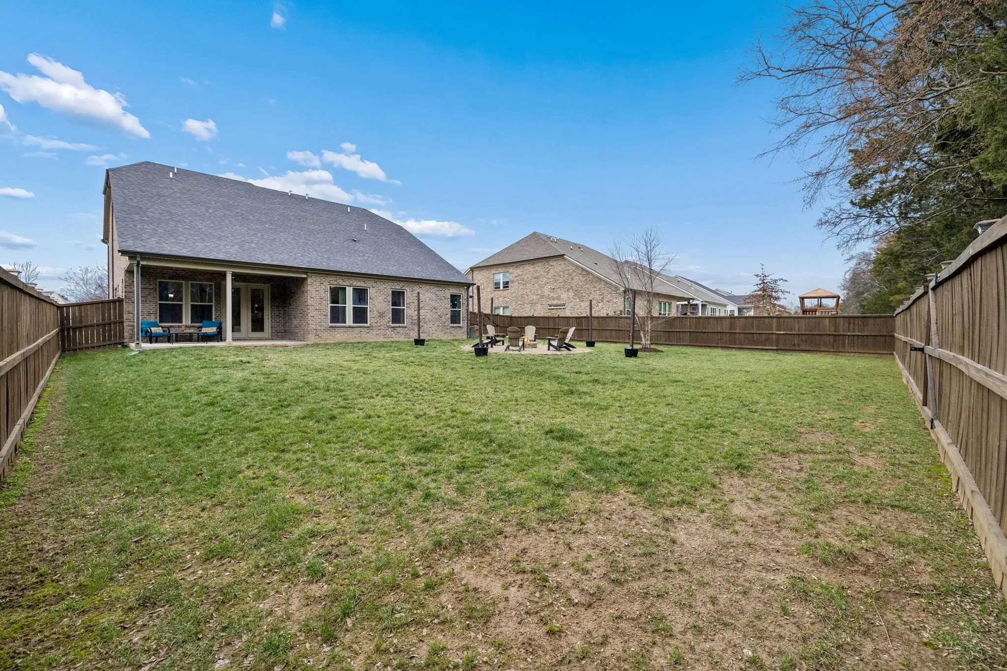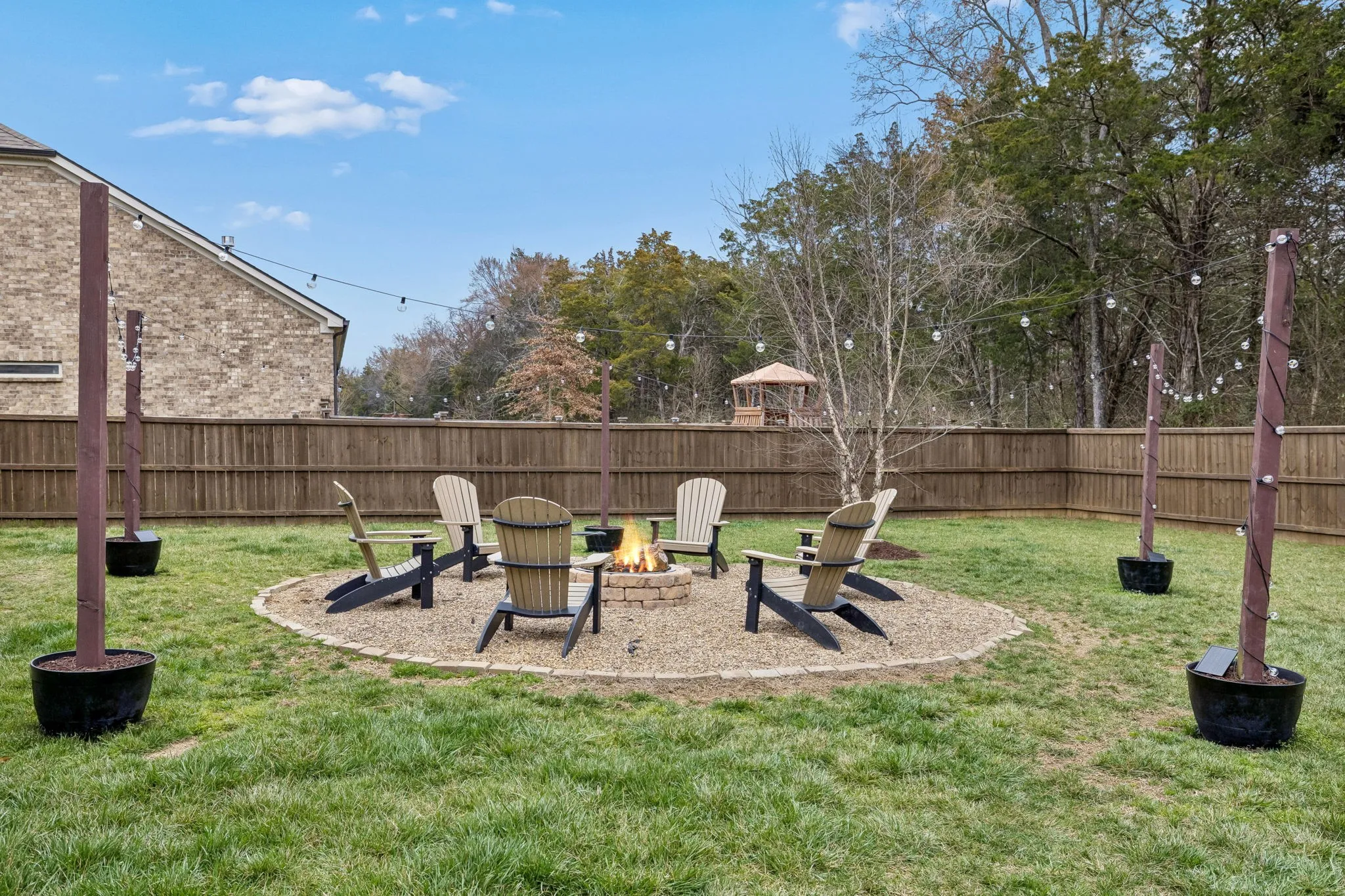 Step outside to a private, fully fenced backyard backing to wooded mature trees for added seclusion. The flat, usable yard is ideal for play, pets, or entertaining, with a dedicated gathering space featuring a fire pit and café lights for cozy evenings outdoors.