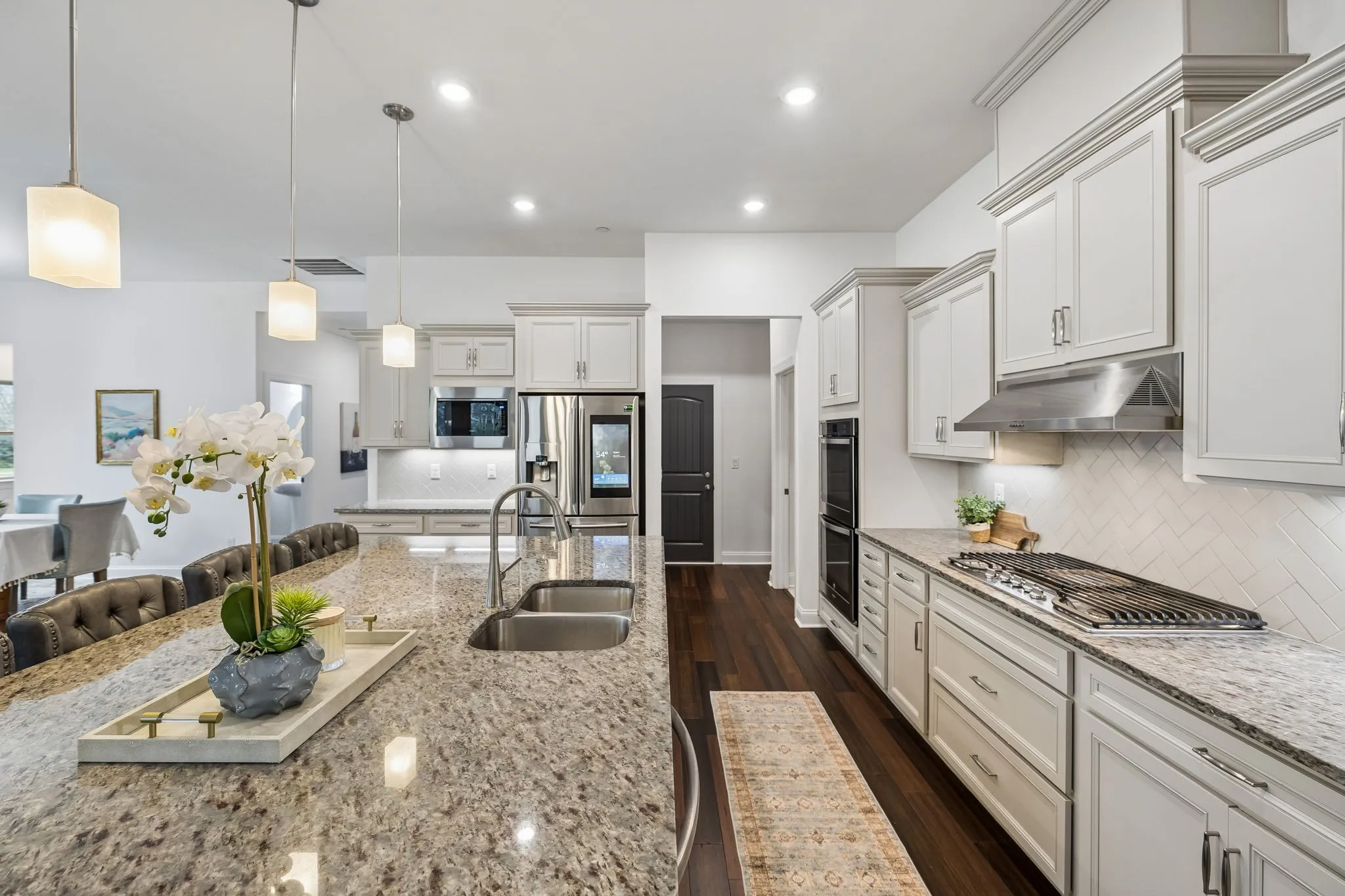 Inside, a spacious and functional layout is designed for versatile living. The main living areas flow comfortably for hosting and gathering, while the kitchen serves as the heart of the home with an oversized island offering abundant prep space and seating. An upstairs flex space provides the perfect option for a media room, home office, playroom, or quiet retreat. The primary suite includes two closets for added storage and organization. A three-car garage provides abundant storage for vehicles, hobbies, or weekend projects.