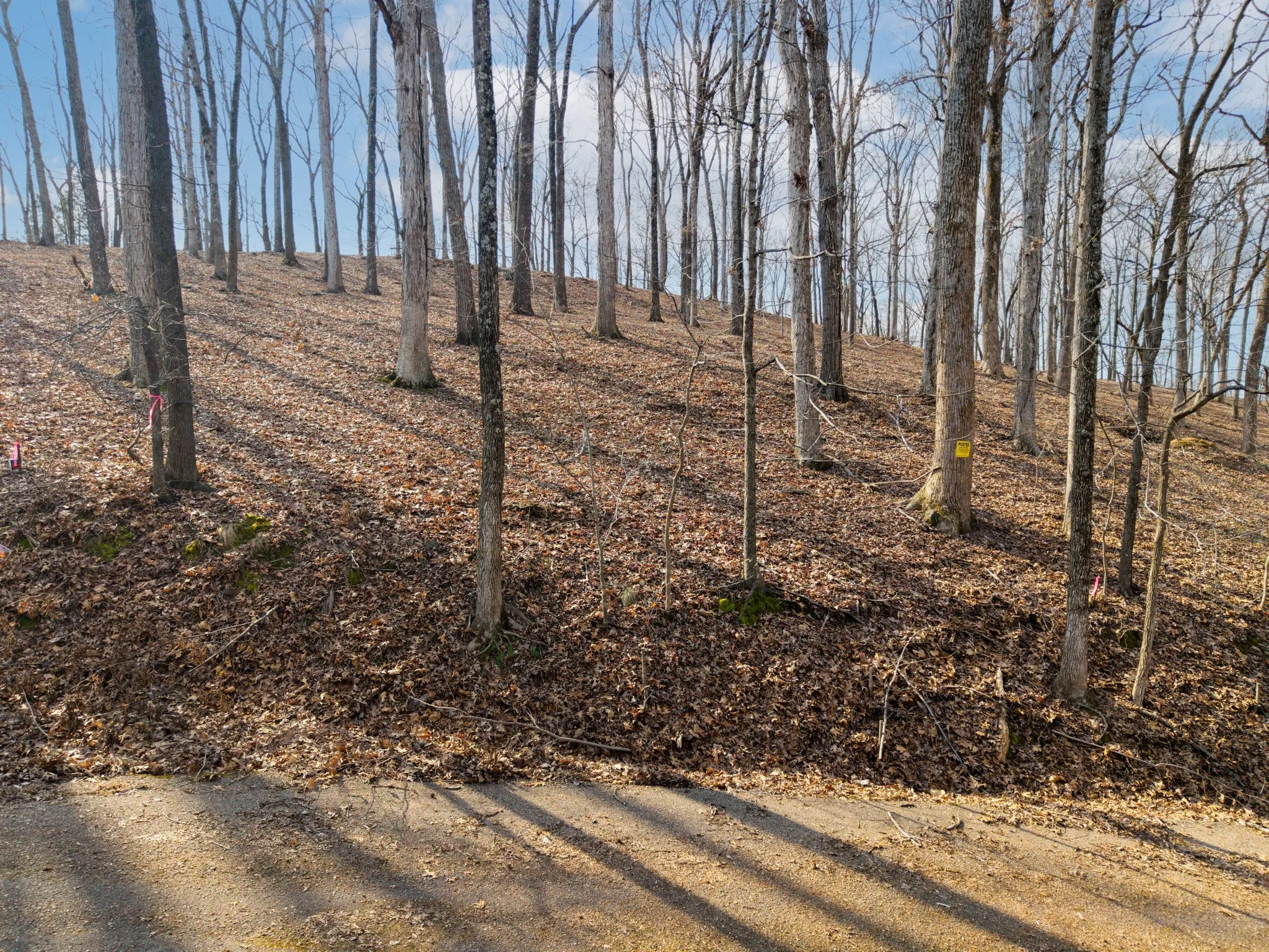 The property features predominantly level topography with a gentle slope, creating an efficient and cost-effective building site. The natural grade supports slab, crawl space, or walkout construction while allowing for proper drainage and reduced site preparation compared to steeper lake-area tracts.