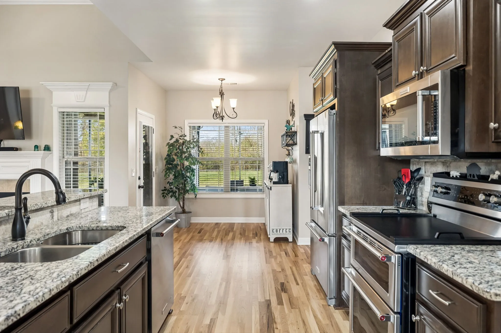 Inside, you’ll love the freshly refinished hardwood floors, brand new carpet in all bedrooms, neutral paint, crown molding, and high ceilings that fill the home with natural light. The open living area with a gas fireplace flows into a beautiful kitchen with granite countertops, KitchenAid stainless appliances, double oven, and spacious pantry, plus both a breakfast nook and formal dining room.