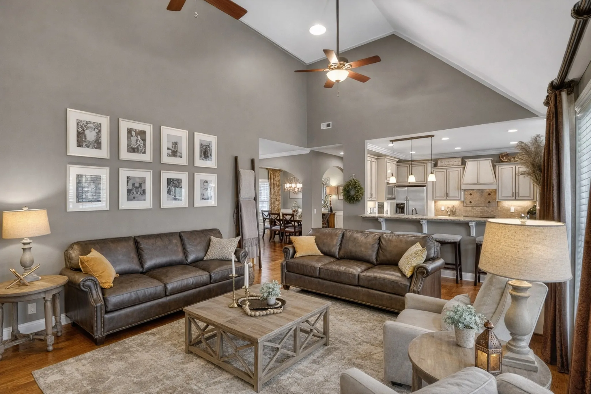Located in a desirable neighborhood with sidewalks and a true community feel, this 3-bedroom, 2-bath home offers space, style, and flexibility. The living room features soaring 22-foot ceilings and a stunning stone fireplace, with hardwood and tile flooring throughout.