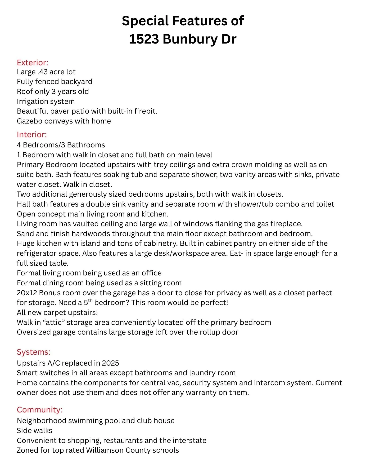 Best value in southern Williamson County! This large 4BR/3BA home located in the desirable Cherry Grove neighborhood is perfect for today’s lifestyle. Open concept kitchen and living room area with vaulted ceilings and a cozy fireplace. The formal living room is being used as an office and the formal dining room as a sitting room. The downstairs bedroom is currently being used as a devotional room, but could be a perfect office. Tons of options to fit your needs!