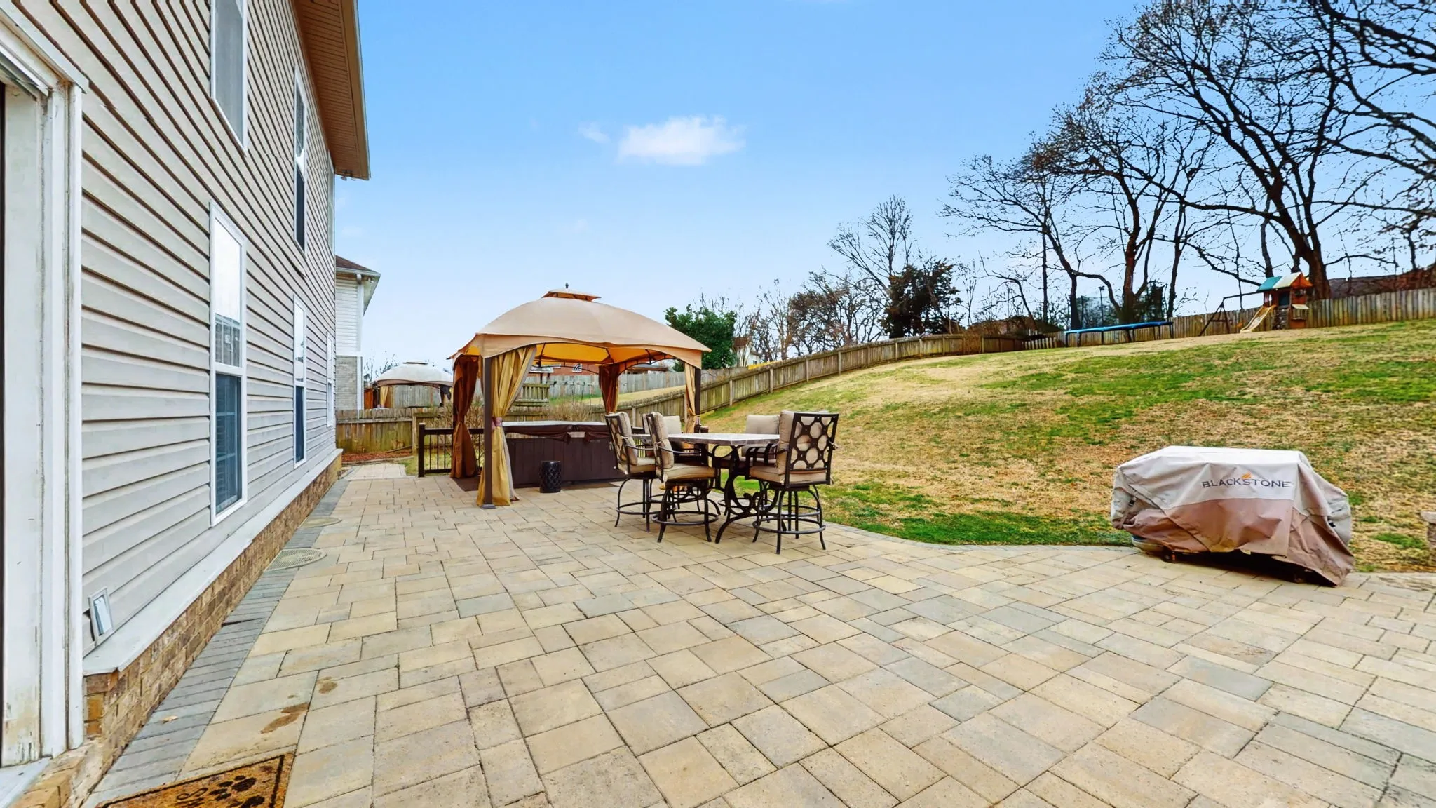 The back yard is an entertaining delight! Beautiful paver patio with built in firepit and a gazebo that conveys with the home. Lots of space to play or garden within the fenced in back yard.