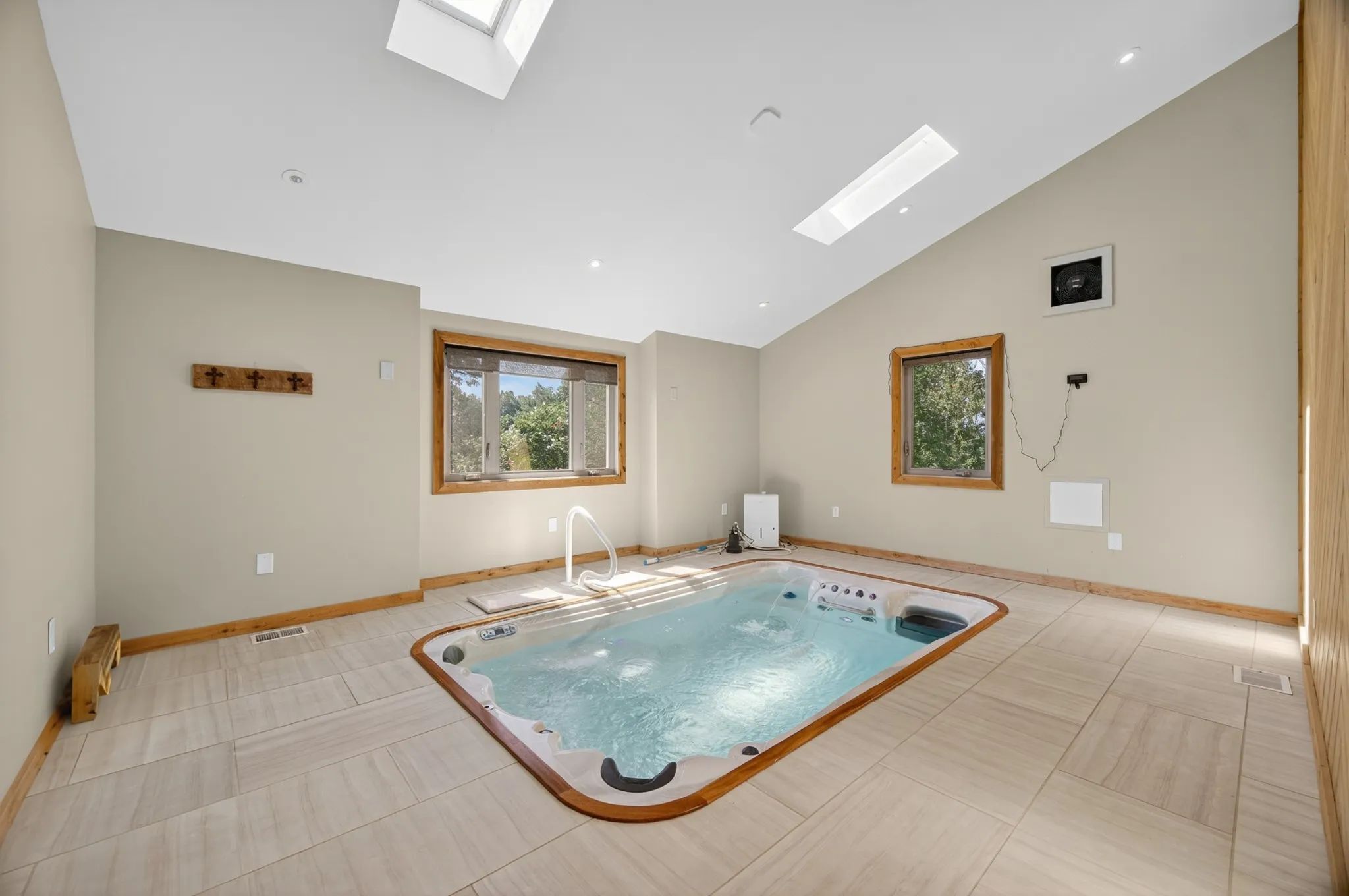 In 2018, the home expanded to include a stunning 1,500-gallon TidalFit swim spa room, complete with vaulted ceilings and remote-controlled skylights, offering year-round relaxation and wellness right at home.