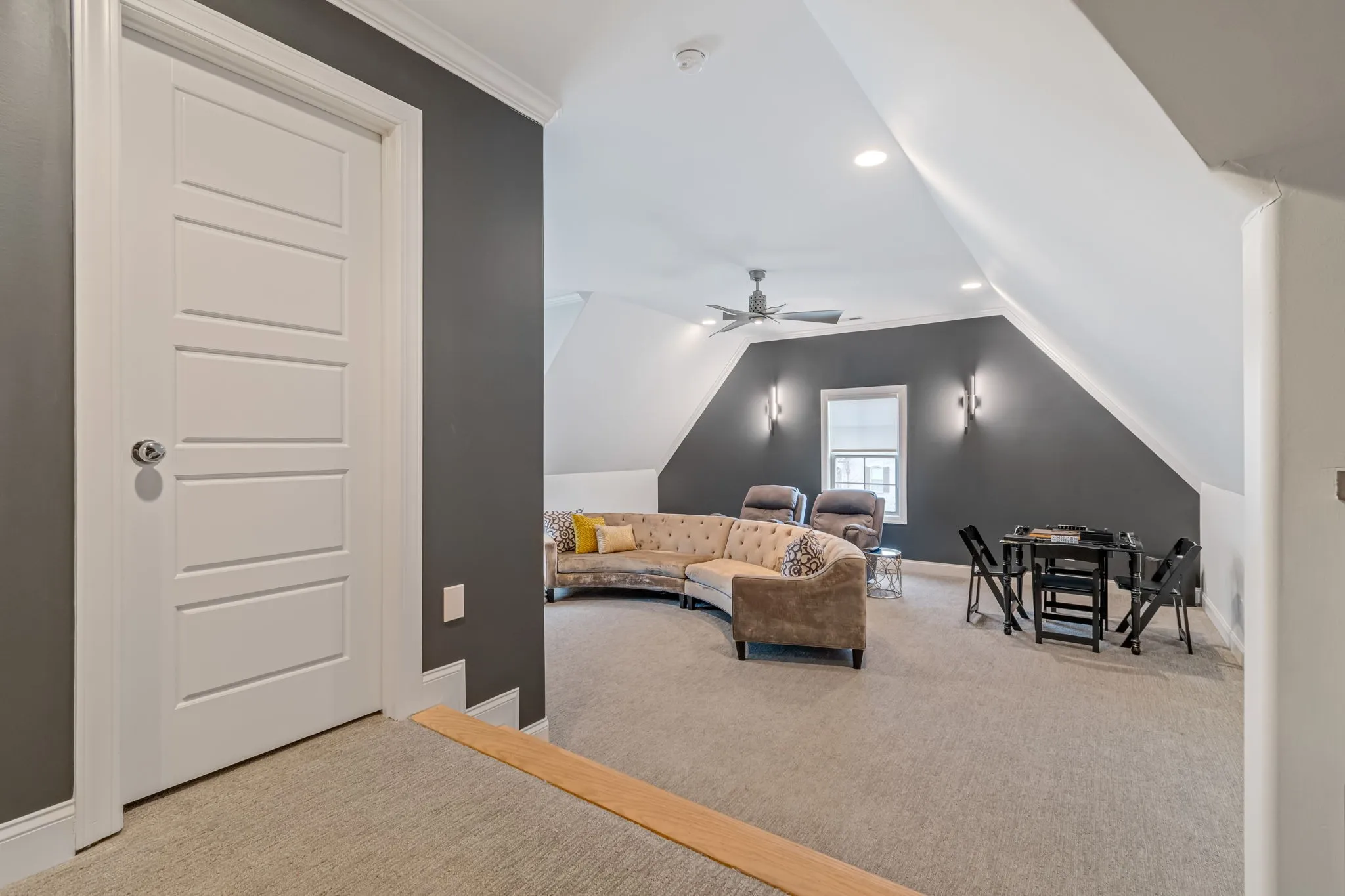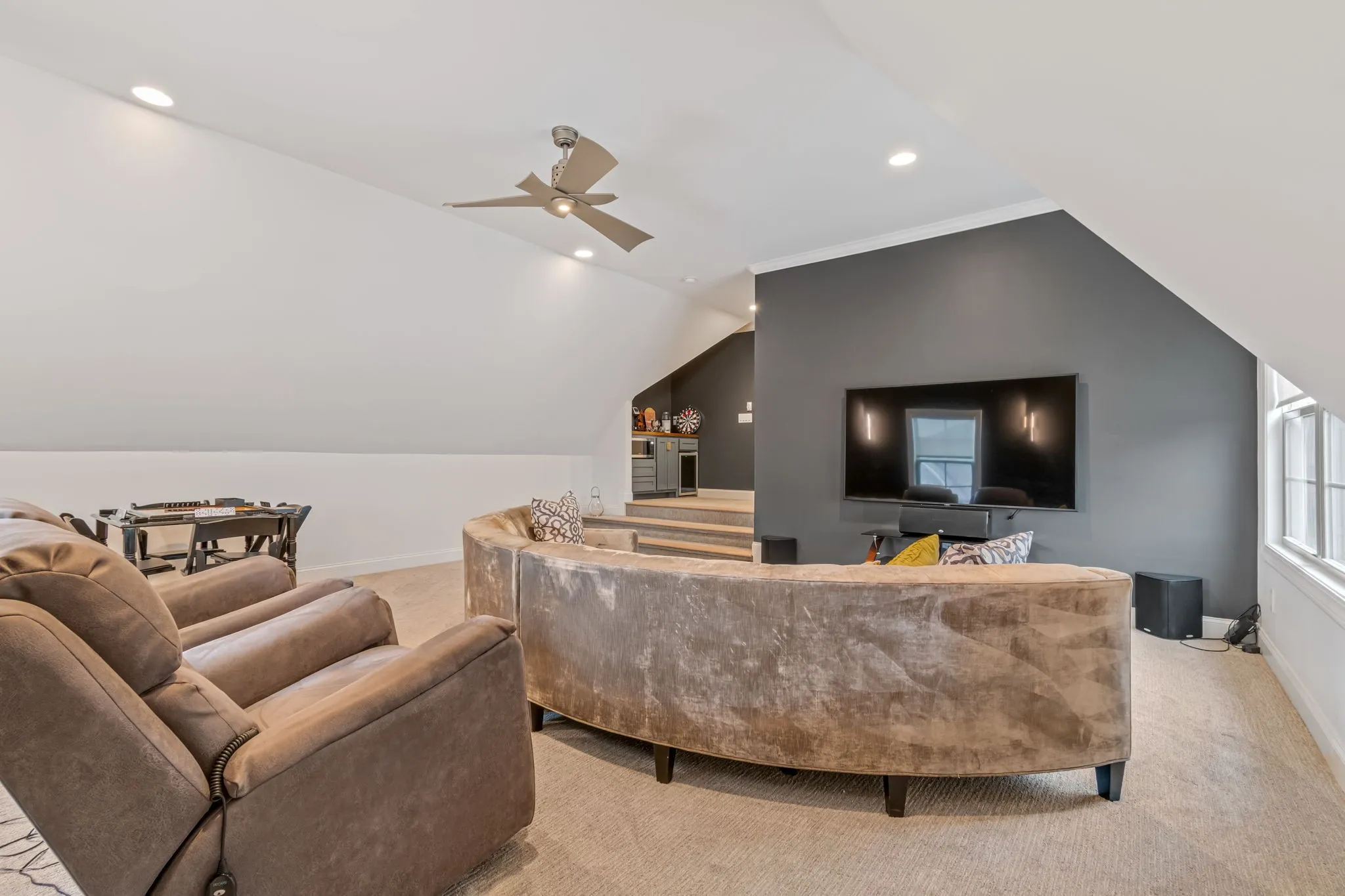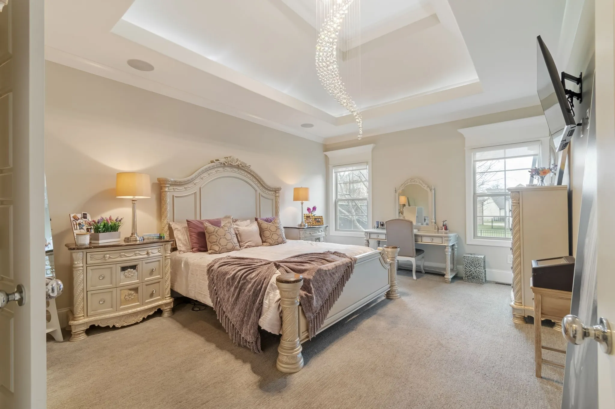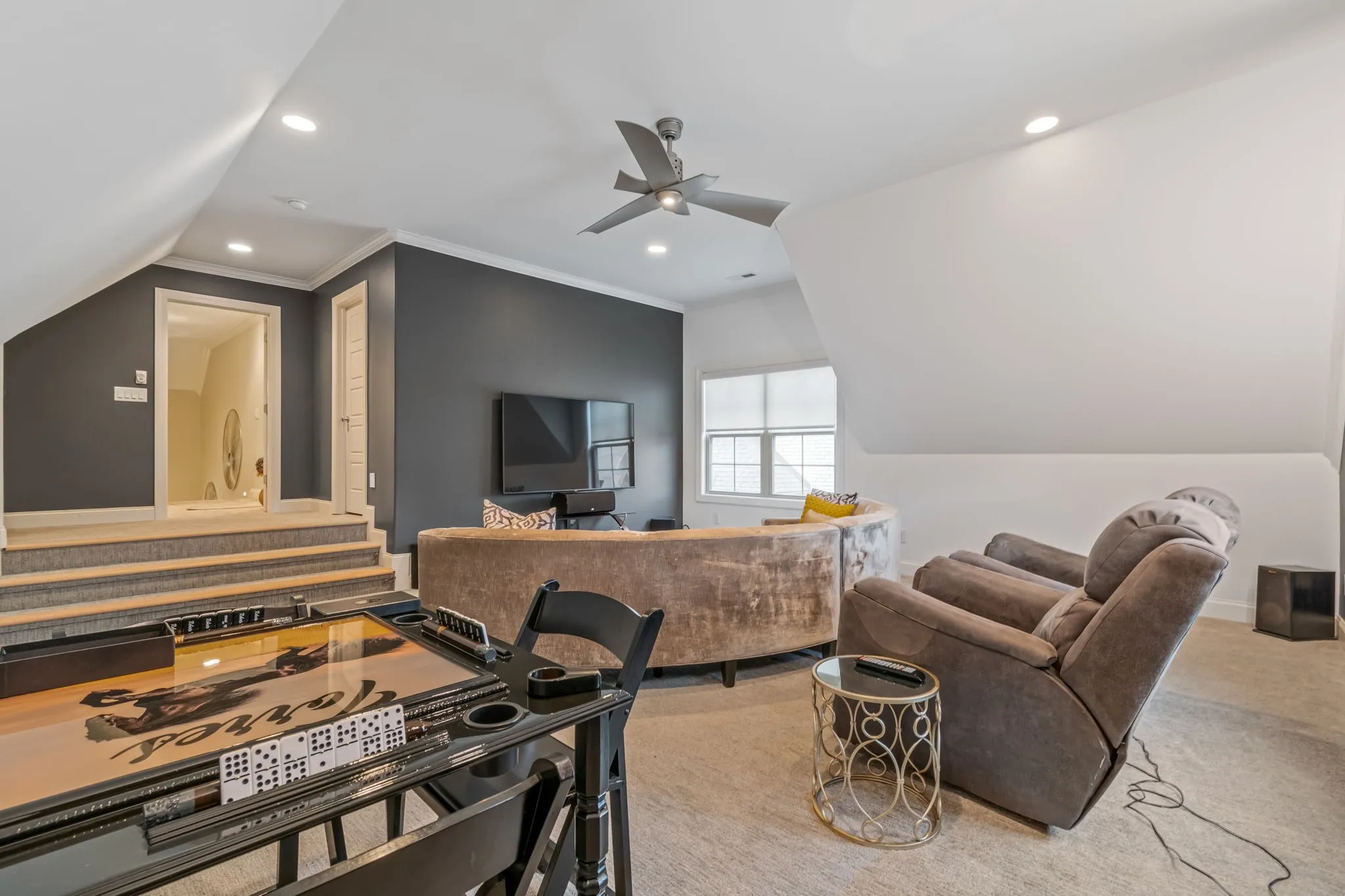 The primary suite offers a peaceful retreat with a tray ceiling and a walk-in shower with frameless glass and carefully curated tile finishes. Upstairs bonus room provides flexible space for media, play, or work.