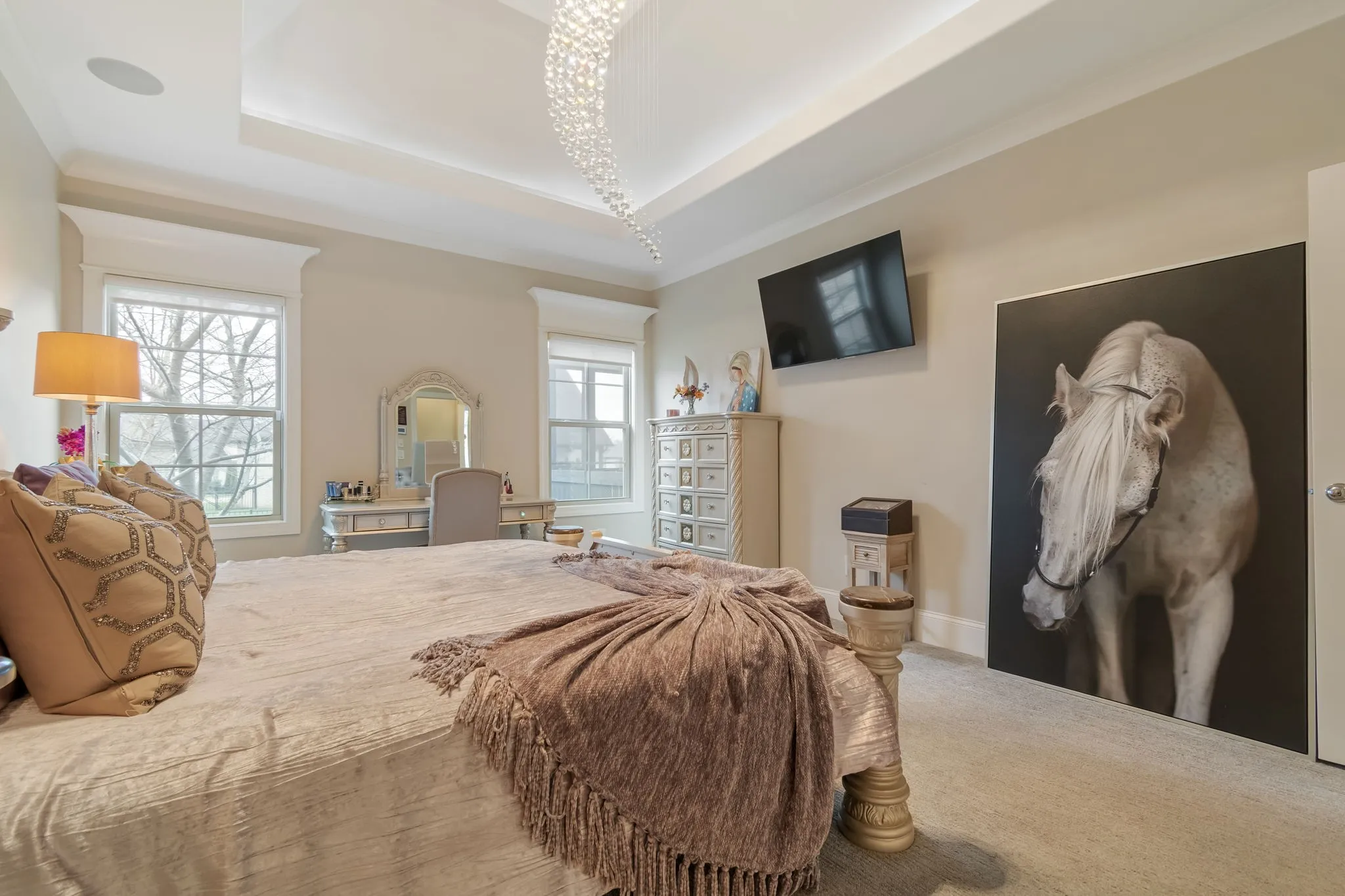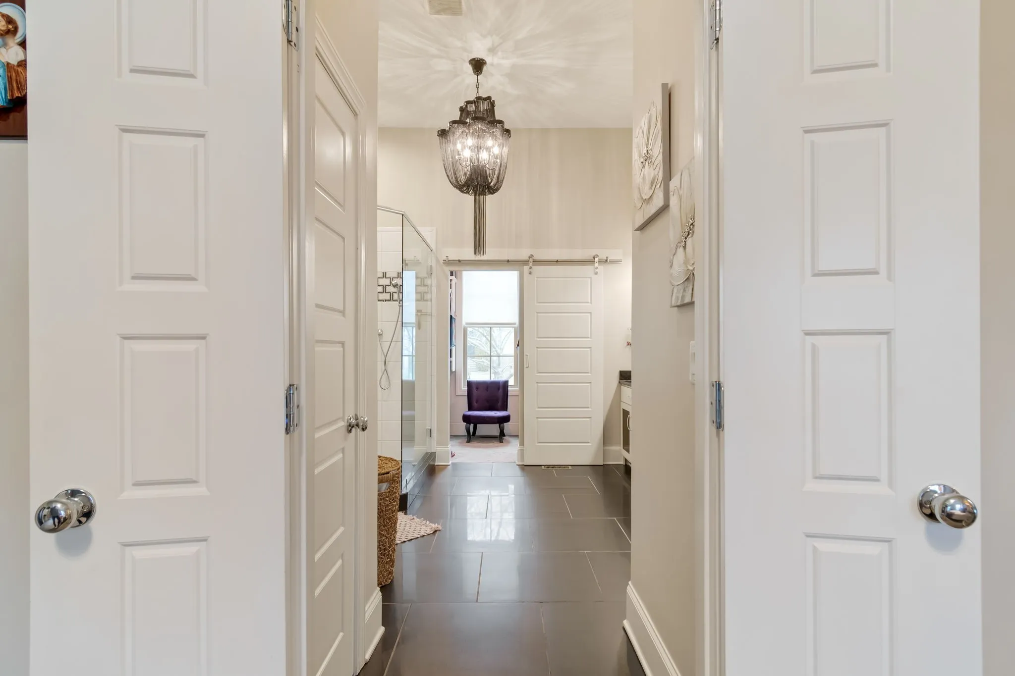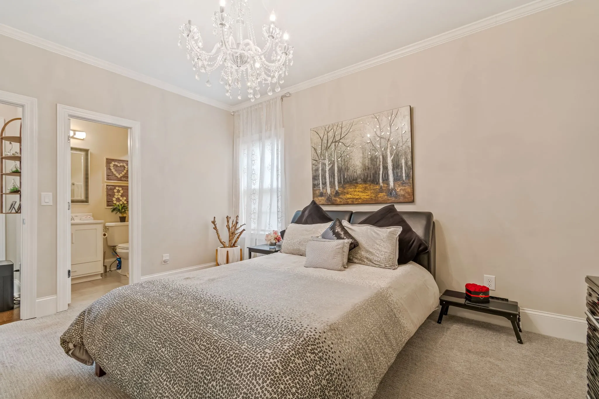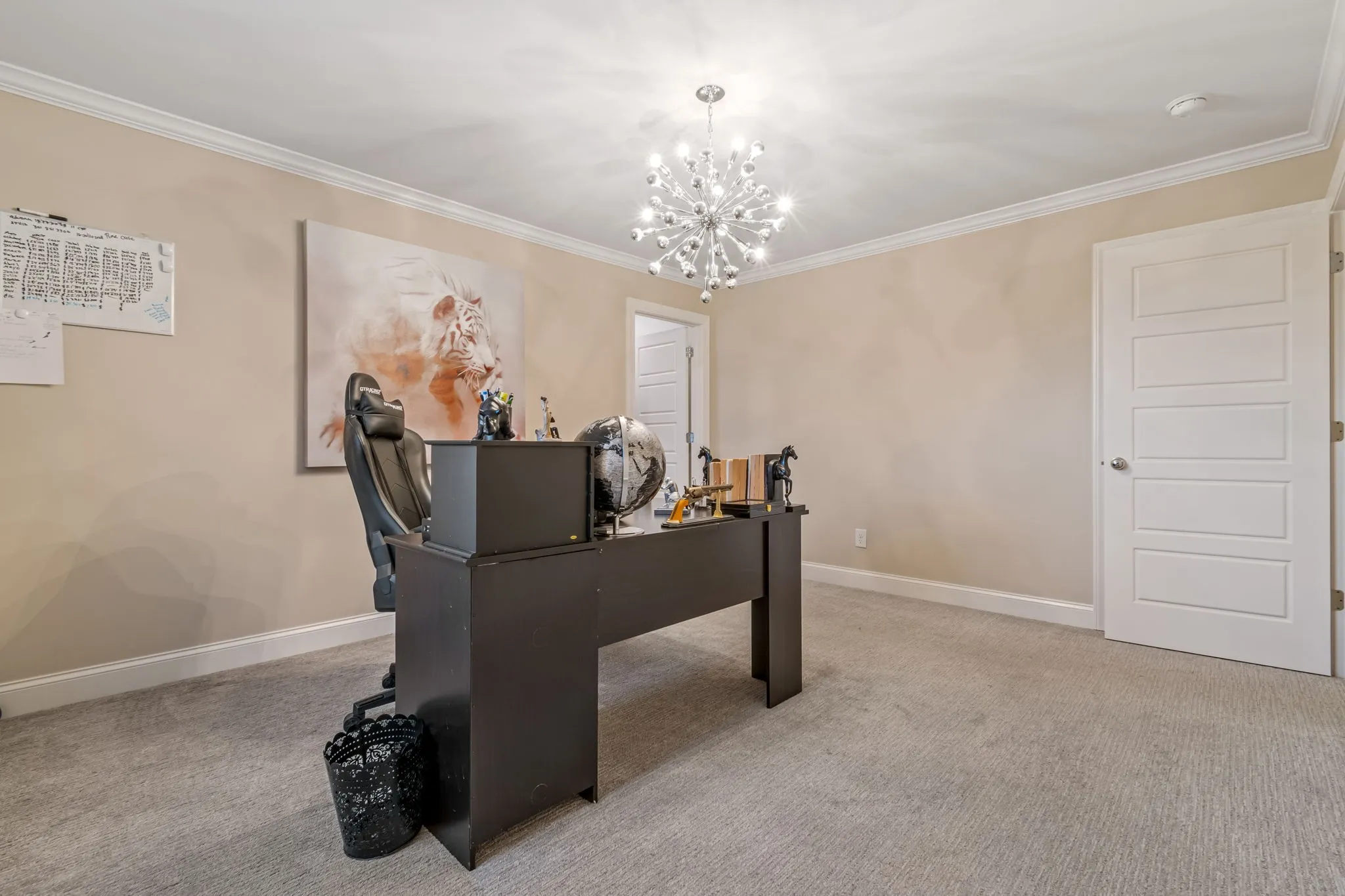 The primary suite offers a peaceful retreat with a tray ceiling and a walk-in shower with frameless glass and carefully curated tile finishes. Upstairs bonus room provides flexible space for media, play, or work.